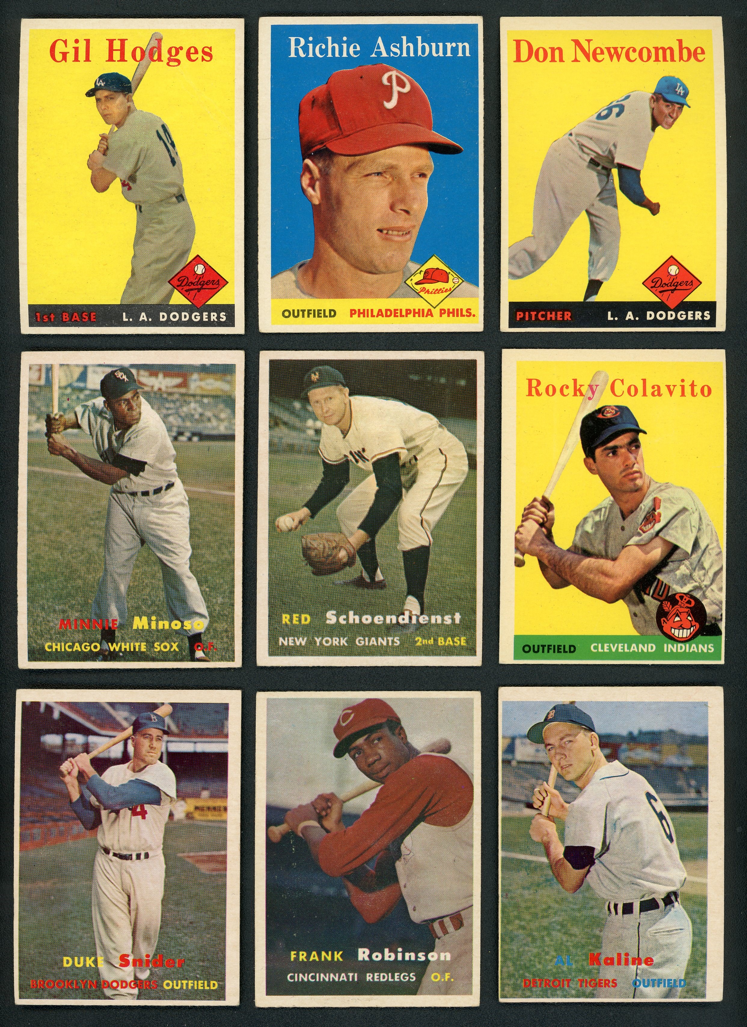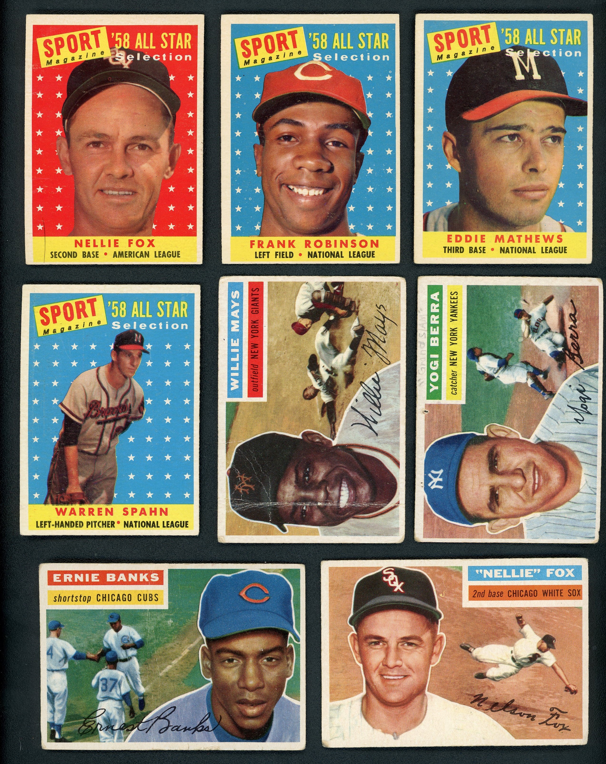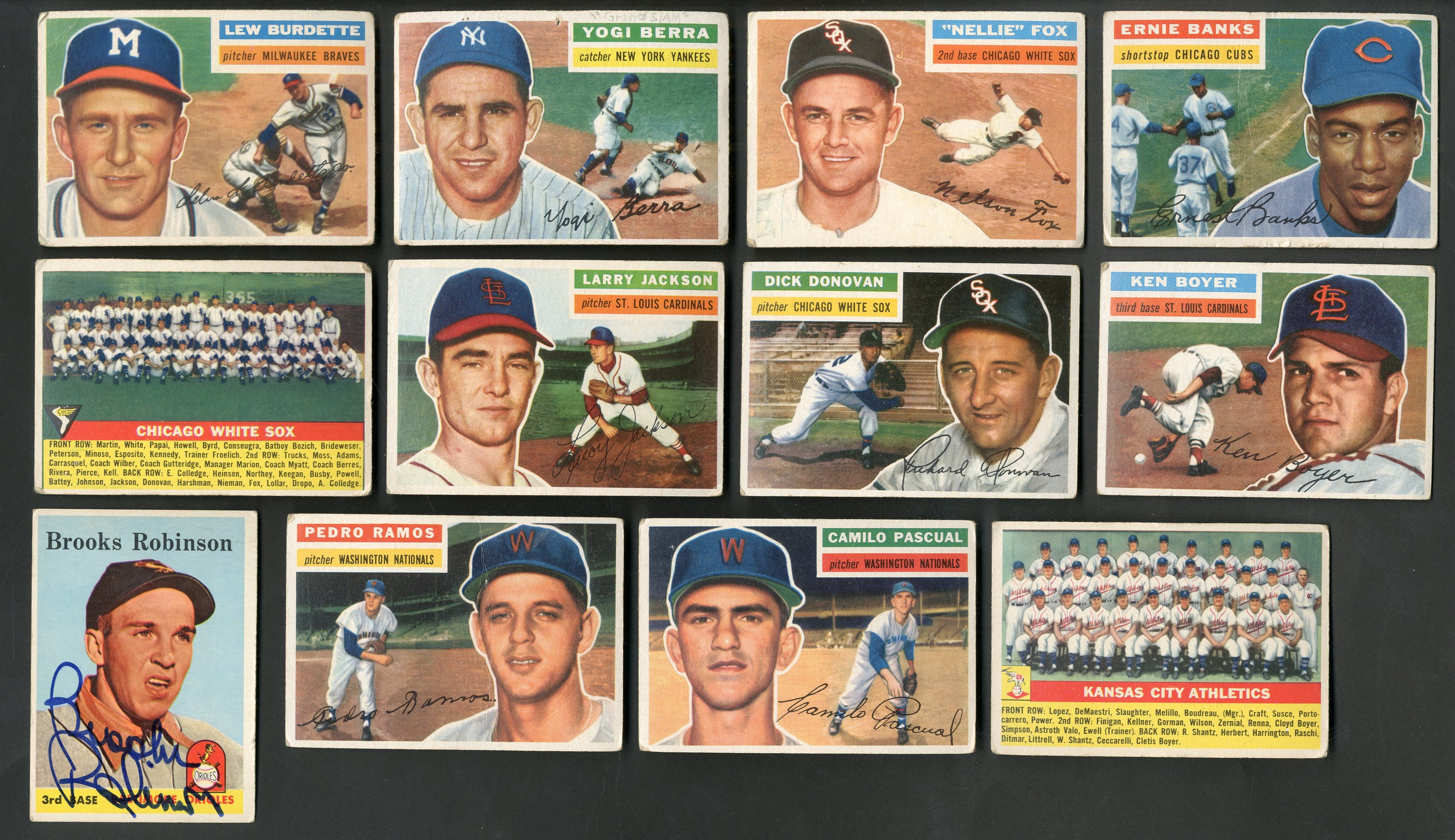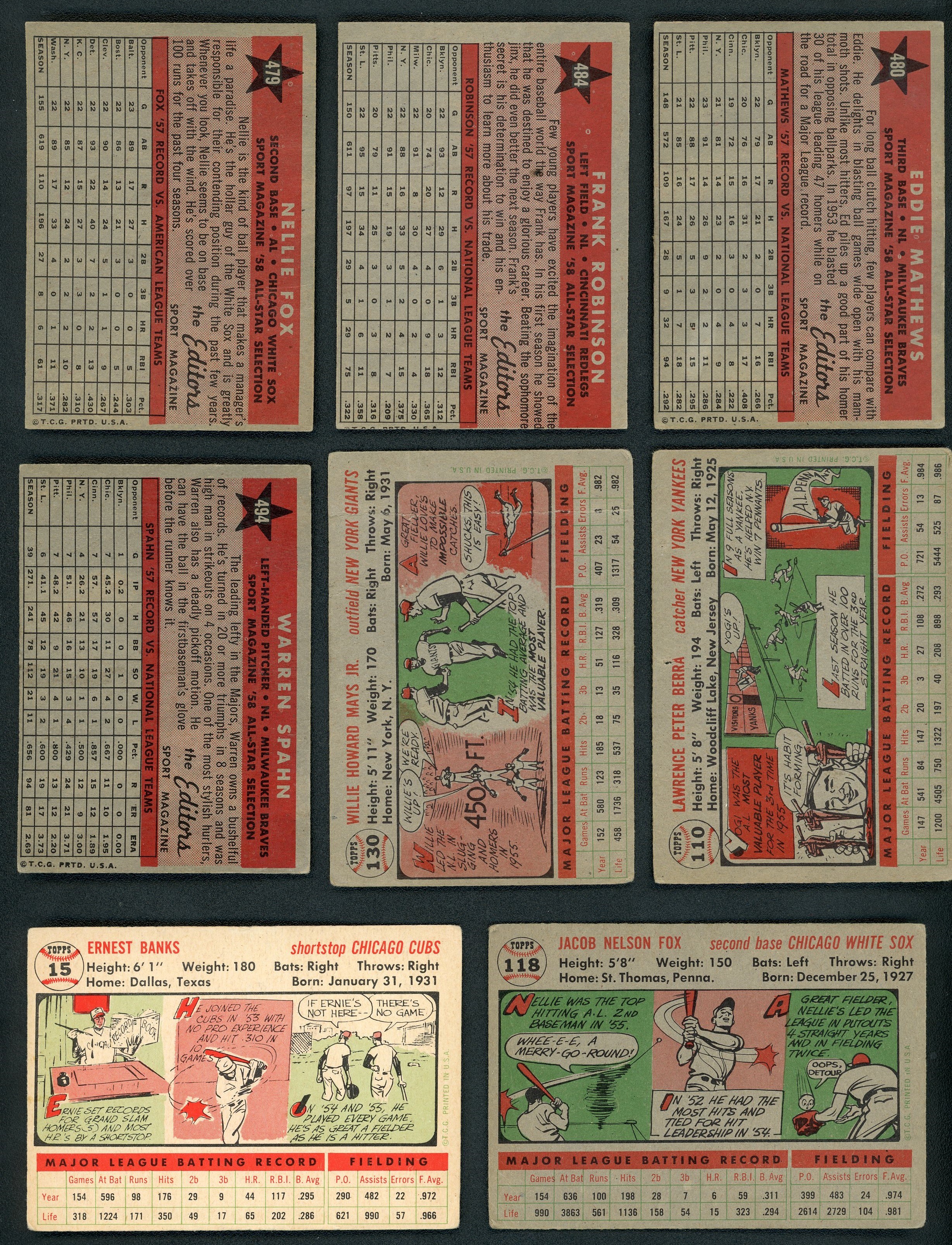 Interesting collection fresh to the market. Lot of 142 Cards ranging from 1954-1961 they are mostly Topps. Overall Condition is VG+: 1) 1954 Topps - 3 Cards, No stars. 2) 1955 Topps- 1 Card, No Stars. 3) 1956 Topps - 13 Cards Including; #15 Banks, #110 Berra, #118 Fox + #130 Mays. 4) 1957 Topps - 33 Cards Including; #35 F. Robinson, #125 Kaline, #138 Minoso, #154 Schoendienst + #170 Snider. 5) 1958 Topps - 74 Cards Including; #162 Hodges, #230 Ashburn, #270 Spahn, #307 B. Robinson (Signed), #340 Newcombe, #368 Colavito. 6) 1958 Topps All-Star - 9 Cards Including; #479 Fox, #480 Mathews, #484 F. Robinson, #494 Spahn. 7) 1959 Topps - 6 Cards, No stars. 8) 1960 Fleer Babe Ruth #3. 9) 1961 Topps - 2 Cards, No Stars. This is a nice group with lots of neat stuff!
