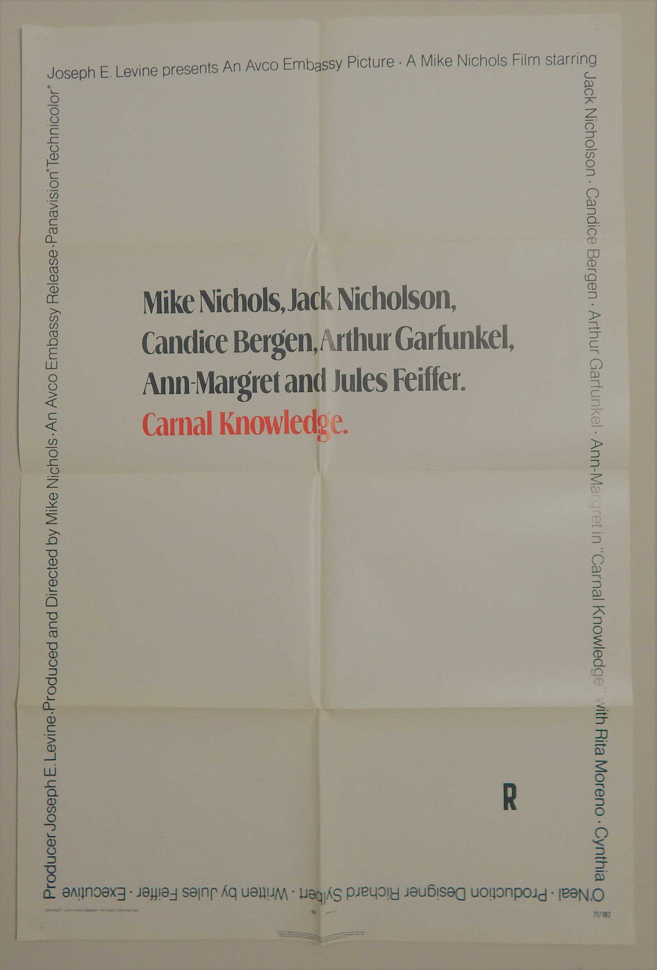 From a 1971 racy classic about men and women, the film caused outrage in some communities around the country due to its dubious morality (at the time). The unique cast included: Mike Nichols, Jack Nicholson (Golden Globe nominee); Candice Bergen; Arthur (Art) Garfunkel (Golden Globe nominee); Ann-Margaret (Golden Globe nominee) and Jules Feiffer (also the writer of the screen play). The poster has a raised 'R' added to the lower left as the poster had no official rating printed on it. Small pinhole in each corner otherwise EX+ condition. Comes with a two-page, typed Synopsis, Cast List, and Technical Credits. A great piece of historical art for our current "#MeToo" generation.
