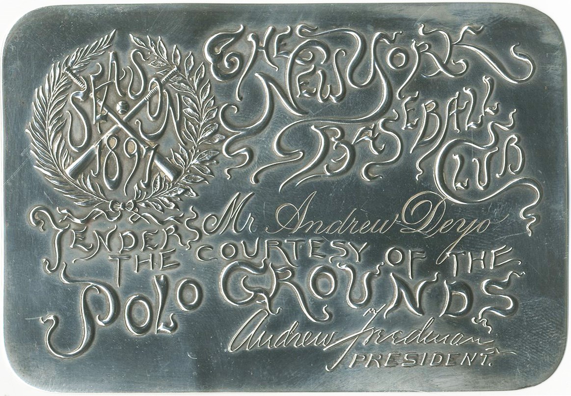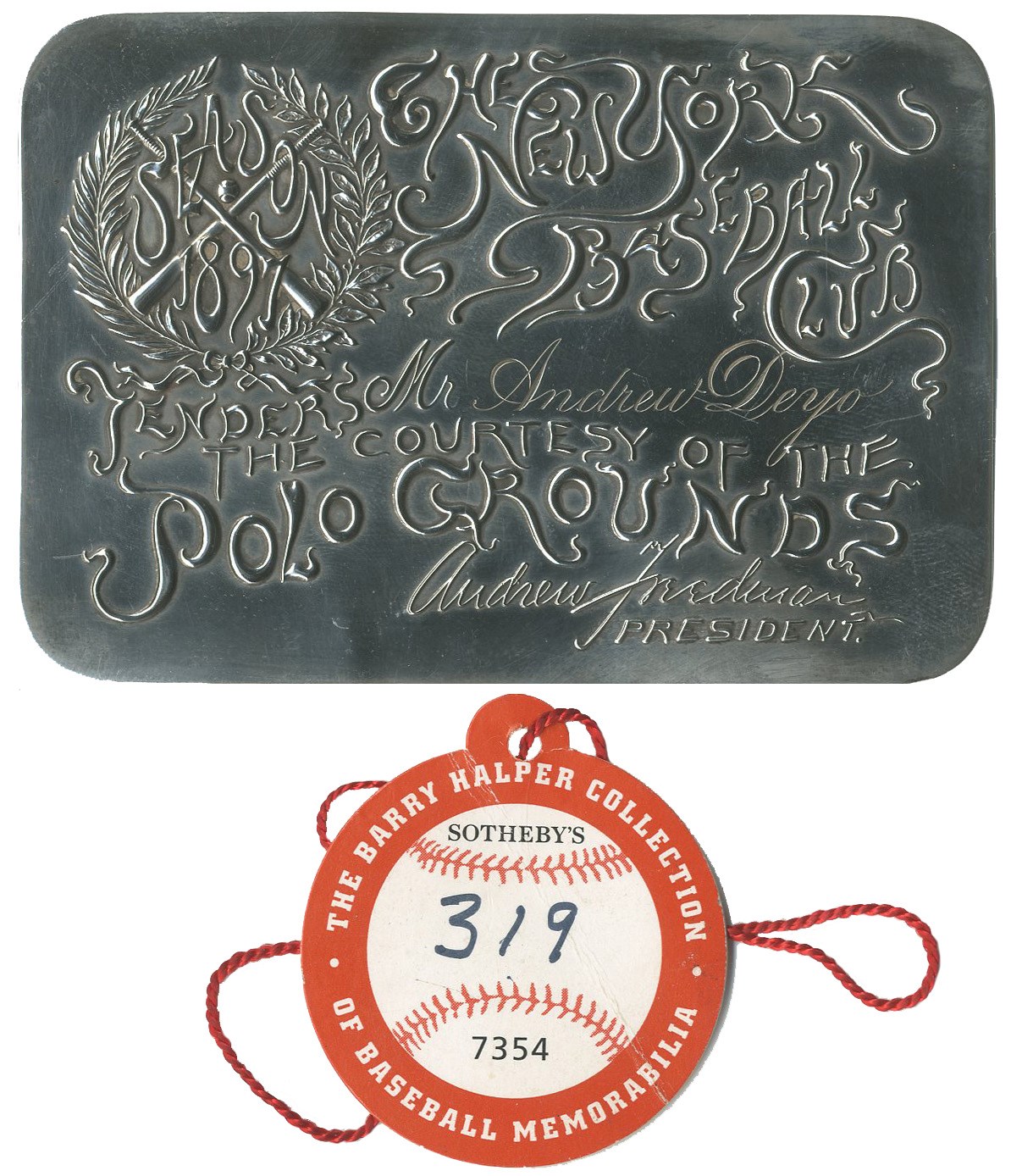 Incredible New York Giants sterling silver season pass presented to Andrew Deyo for the 1897 season. In a swirling, psychedelic font, the pass reads, "The New York Baseball Club, Season 1897, Tender to Mr. Andrew Deyo, The Courtesy of the Polo Grounds". Giants President Andrew Freedman's signature appears raised on the front, while the back is stamped "Sterling". Freedman bought the Giants in 1895 for $53,000, and spent a brief but tumultuous time as owner until he sold the team in 1902. His ownership tenure also included acquiring the Baltimore Orioles of the American League and completely dismantling the team to poach talent for the Giants. In 1897, the Giants were led by shortstop George Davis, who put together a very impressive statistical season for the time, batting .353 with 10 home runs and a league leading 135 RBI's. More than a century later, Davis would be posthumously inducted into the Baseball Hall of Fame in 1999. The pass comes from Sotheby's Barry Halper Auction in 1999 with an accompanying tag. It is overall in EX condition with some surface wear on the back and front.