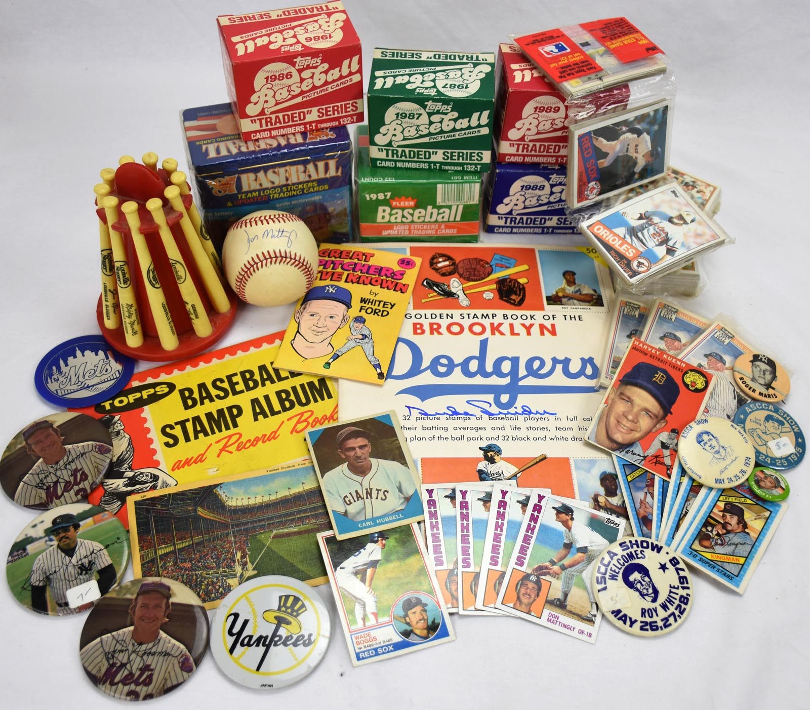Sets: 1986 (92/132), 87, 88, 89 Topps Traded, 1987 Fleer (2, sealed), (12) 1970s-80s pins with 1960s Roger Maris, Yankees, Mets and stars, Don Mattingly signed baseball, Duke Snider signed Stamp Book, (4) 1984 Topps Don Mattingly rookies, 1962 Topps Baseball stamp album, 1970s Louisville Slugger bat bank with 10 plastic bats with Mantle & Aaron, 1985 Topps unopened rack pack, 1954 Topps Harvey Kuenn rookie (VG), 1987 Leaf Candy City team sets with Mantle, Kelloggs 3-D super stars, 1981 Topps Giant cards (25) with Reggie Jackson, (2) 1987 Topps All-Star sealed sets, Babe Ruth lucky coin, 1959 Mickey Mantle Boy's Life magazine.
