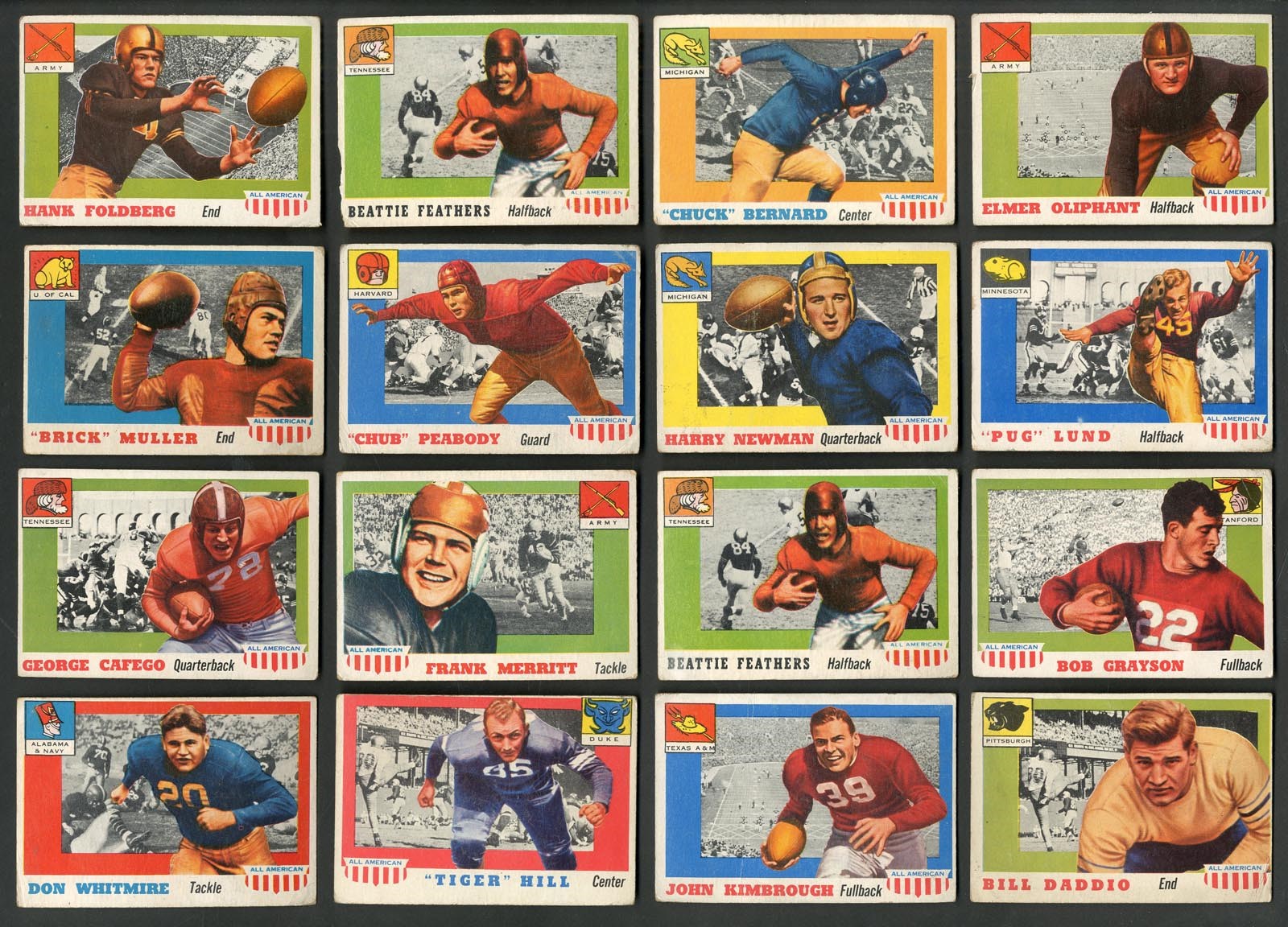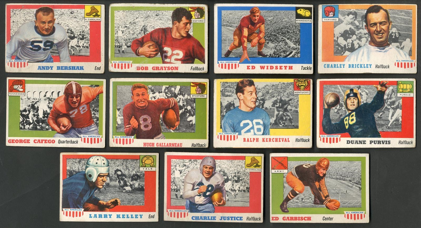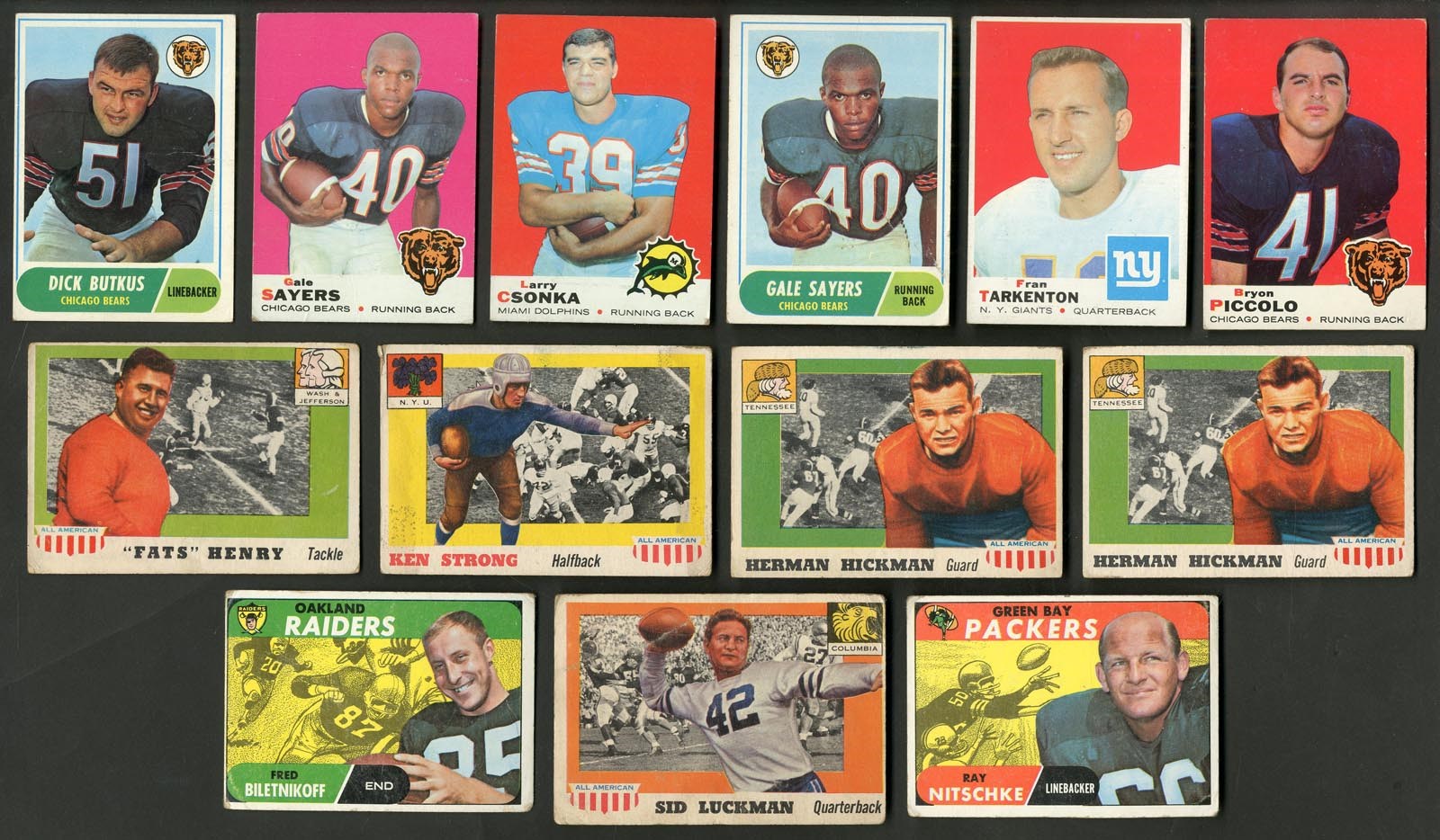 165+ Topps and Philadelphia football cards from 1955-1969: 1955 Topps All-American (34): Sid Luckman, Henry Hickman (2), Fats Henry, Ken Strong, Beattie Feathers. Stars include: Gale Sayers (2), Brian Piccolo rookie, Ray Nitschke, Dick Butkus, Fran Tarkenton, Larry Csonka, Fred Biletnikoff, John Mackey. The balance are commons. Overall VG with some Poor.