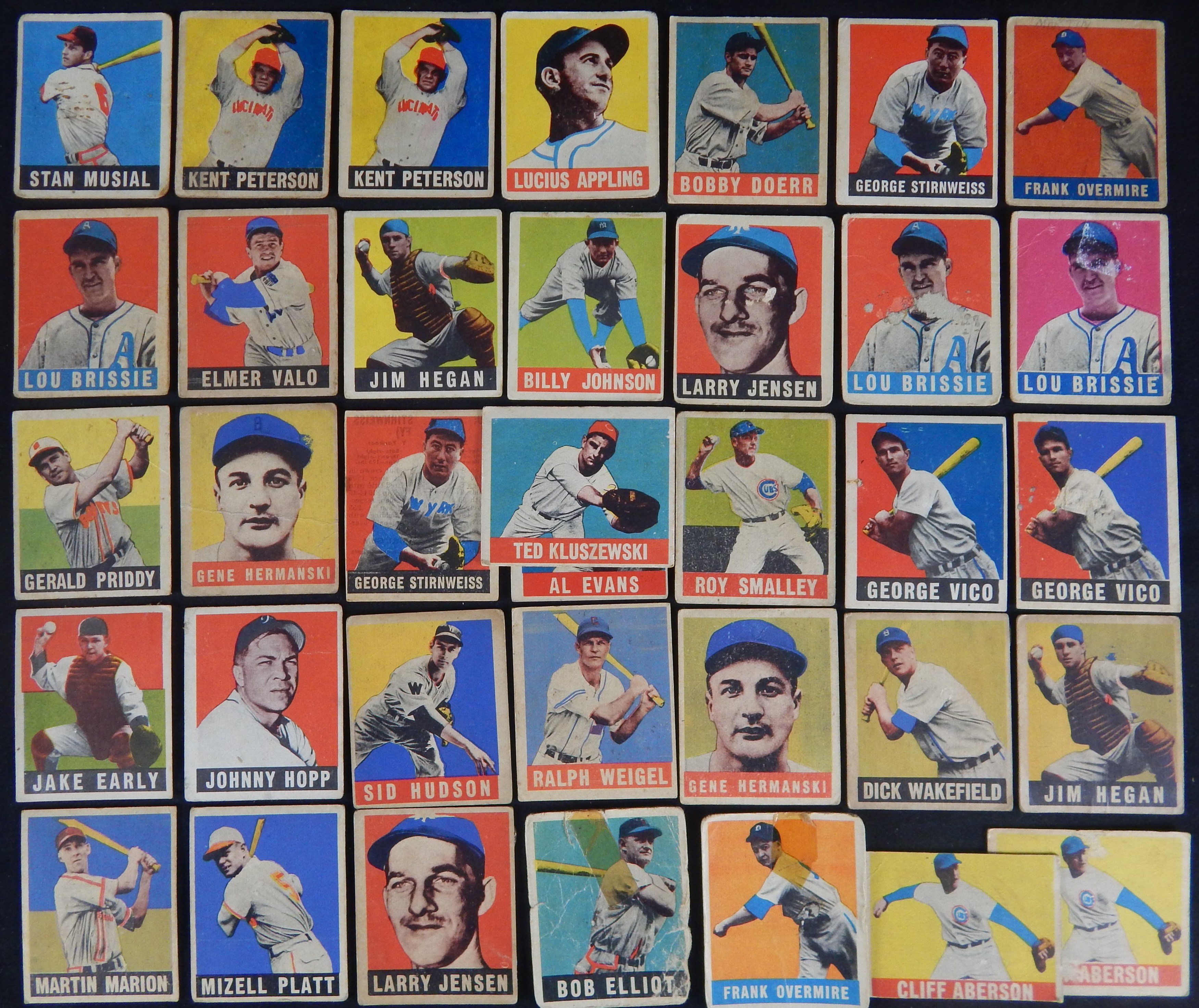 Low grade collection. may contain back damage, paper loss, writing, major creasing and soiling. Includes: 35 cards w/#4 Musial (FR/GD - staining), 38 Kluszewski, 42 Peterson (2, both red cap), 59 Appling and 83 Doerr. Total 35 cards.