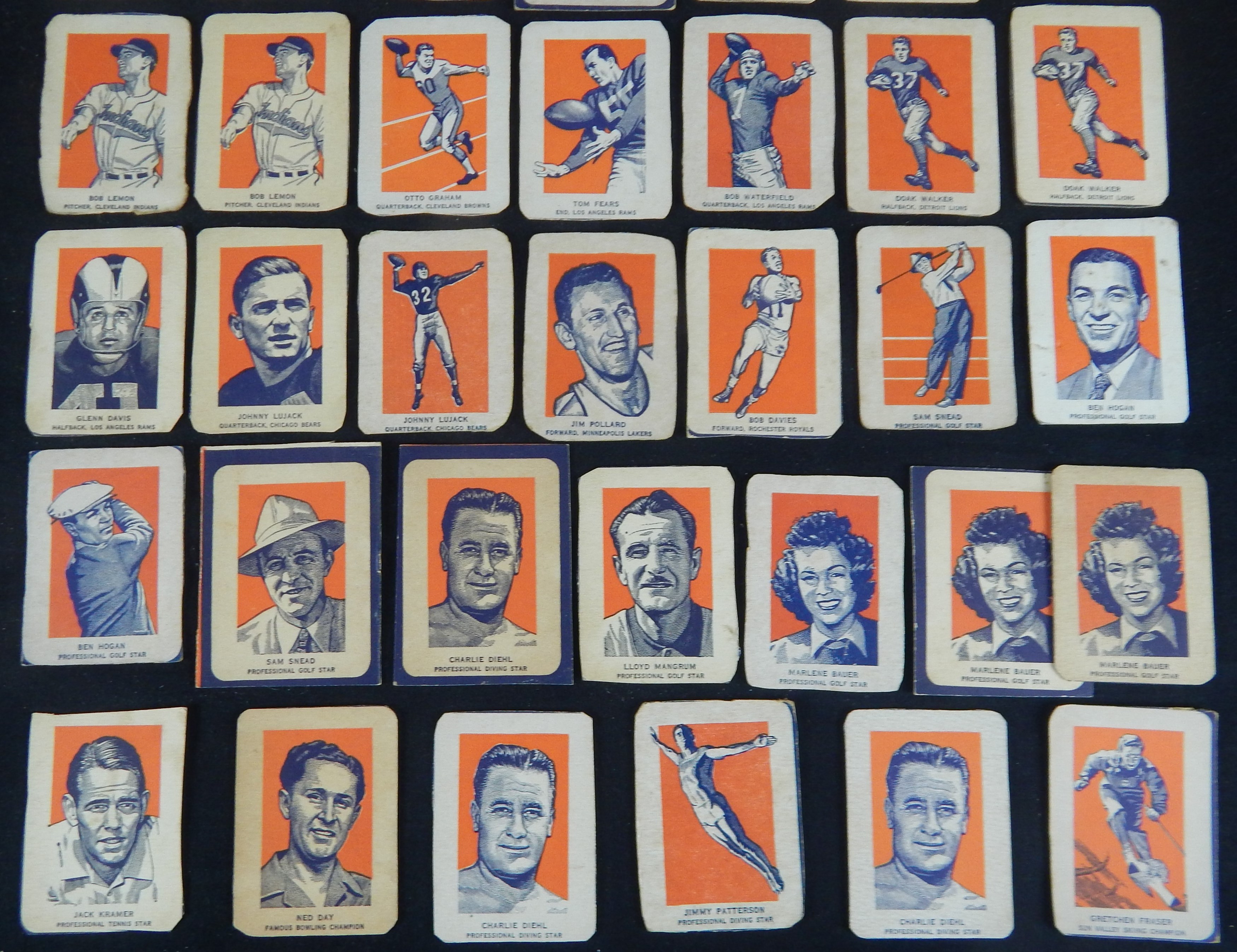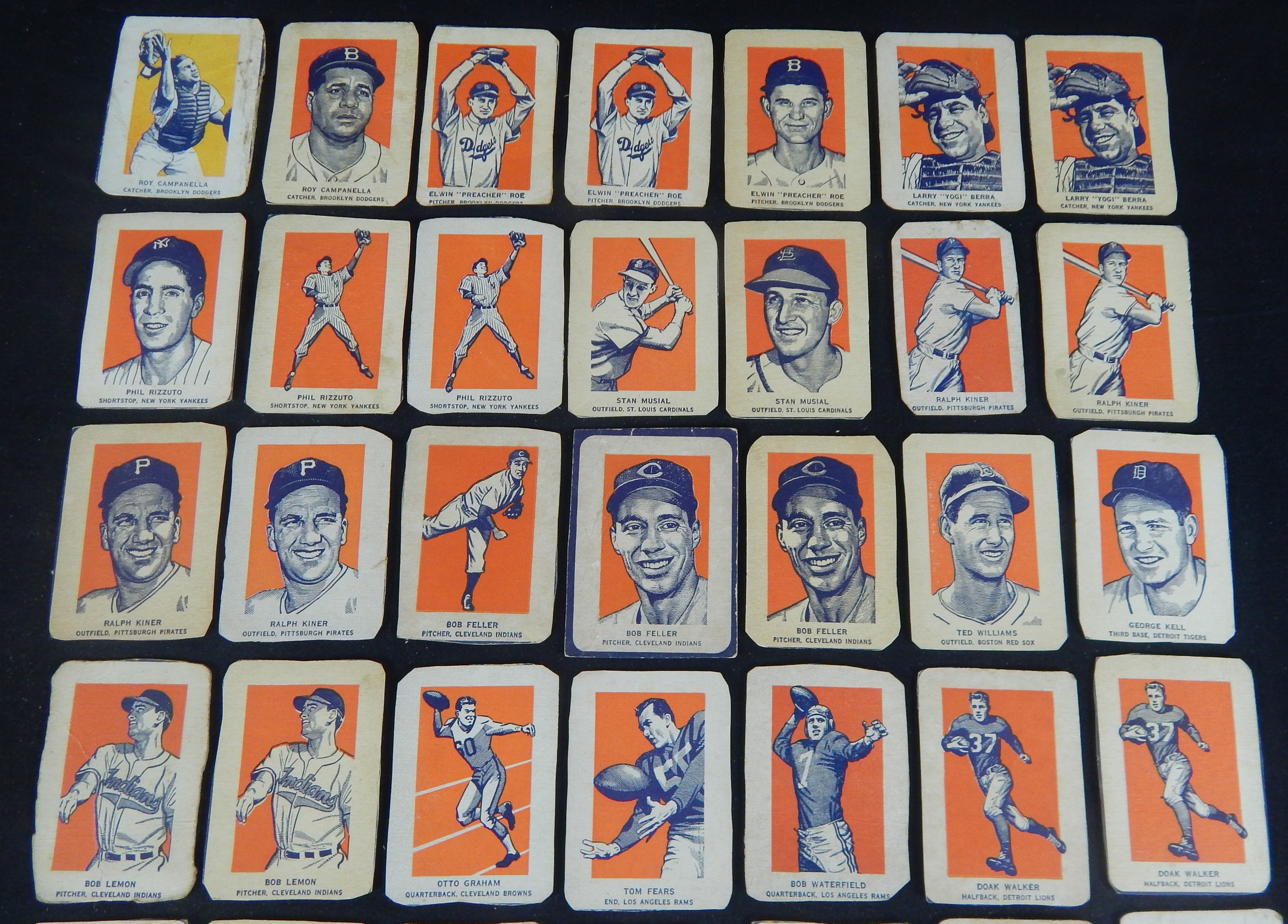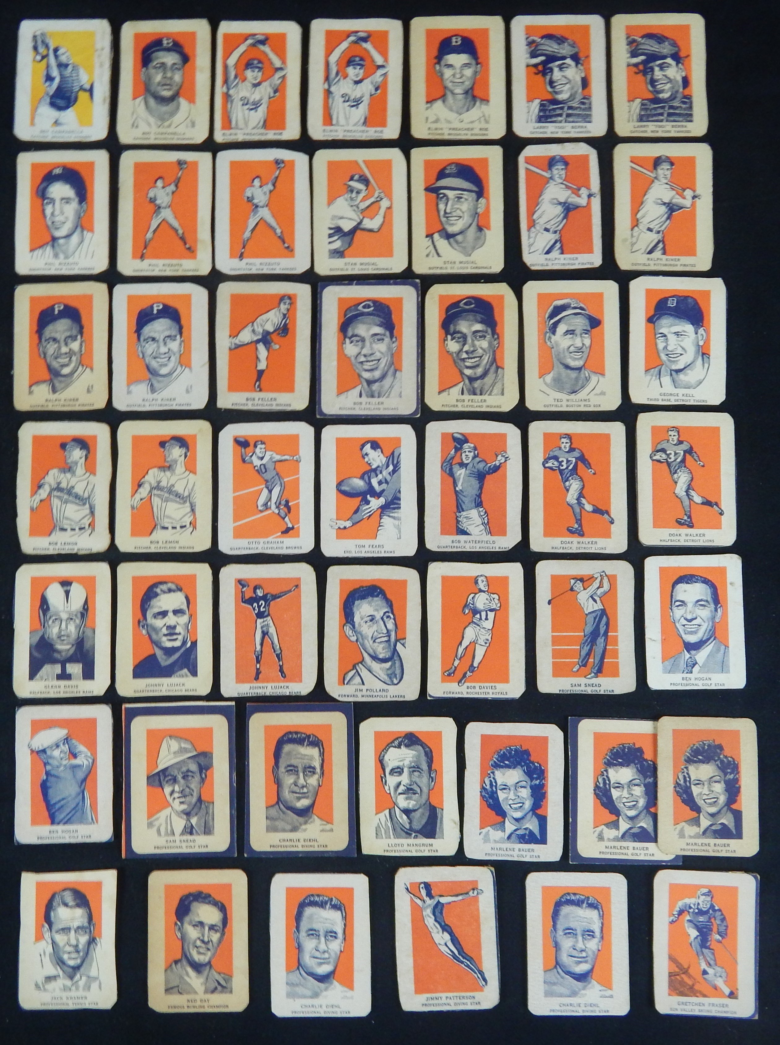 Multi-sport, mixed grade collection with many stars. Includes: BASEBALL - 23 cards w/Campanella (2), Berra (2), Rizzuto (3), Musial (2), Kiner (4), Feller (3), Lemon (2) and Ted Williams. FOOTBALL - 9 cards w/Graham, Fears, Waterfield, Walker (2), Davis and Lujack (2). BASKETBALL - 2 cards w/Pollard and Davies. GOLF - 8 cards w/Hogan (2), Snead (2) and Marlene Bauer (3). OTHERS - 6 cards....divers, tennis etc.