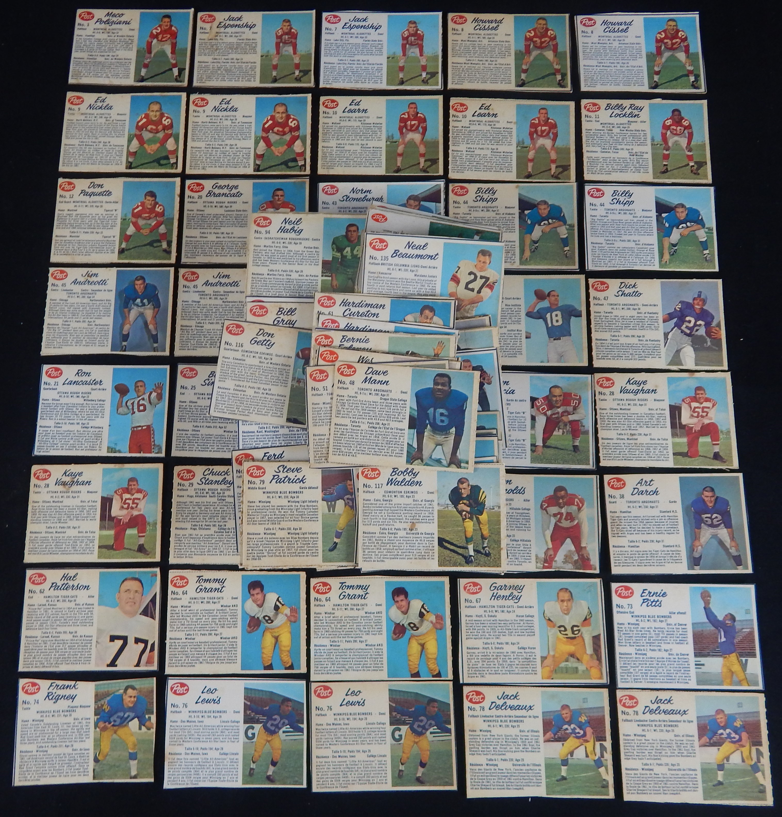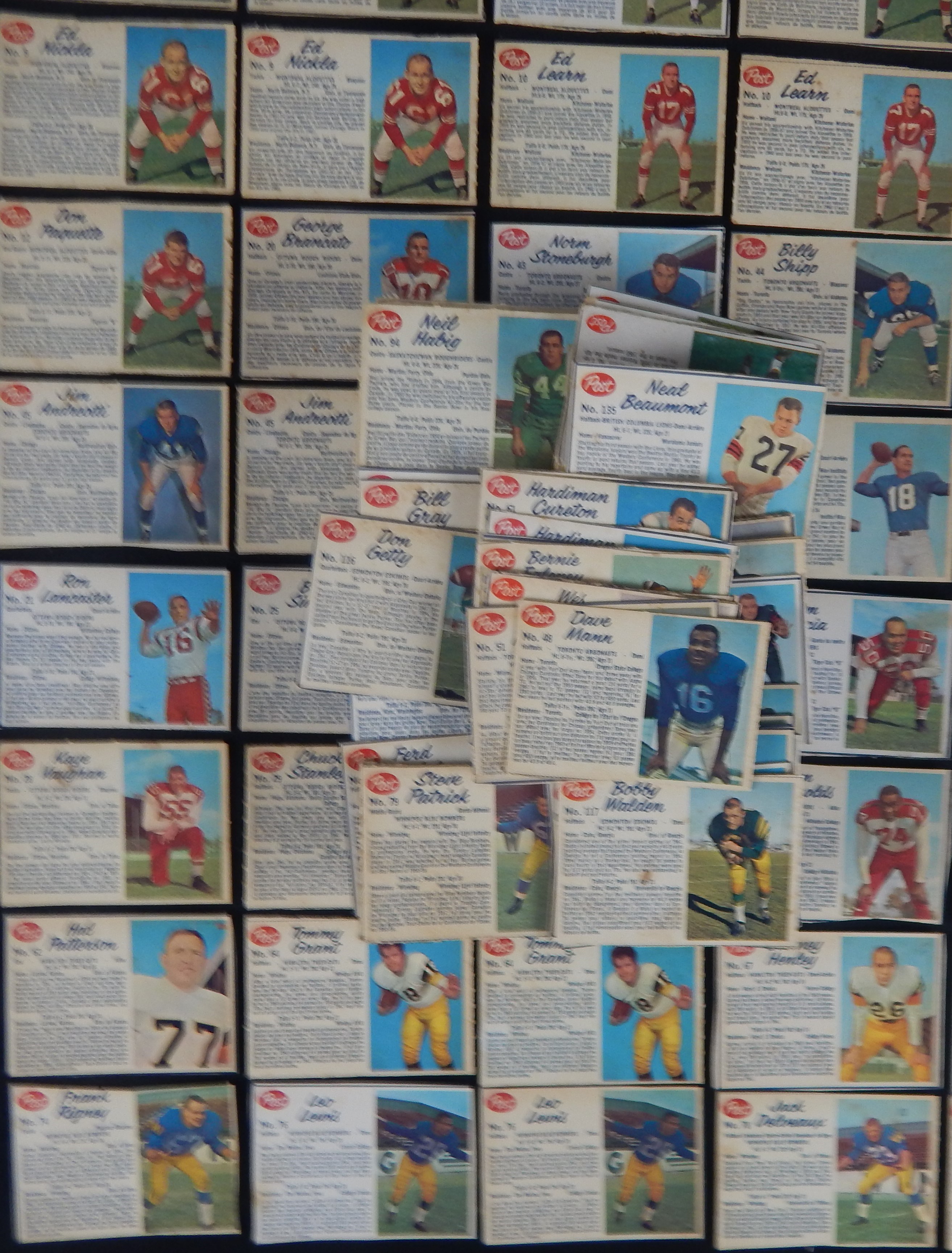 Mixed grade lot of 87 Canadian Post football cards from 1962. Also includes SIX cards from the United States Post set with #33 Bednarik and #8 Kramer.