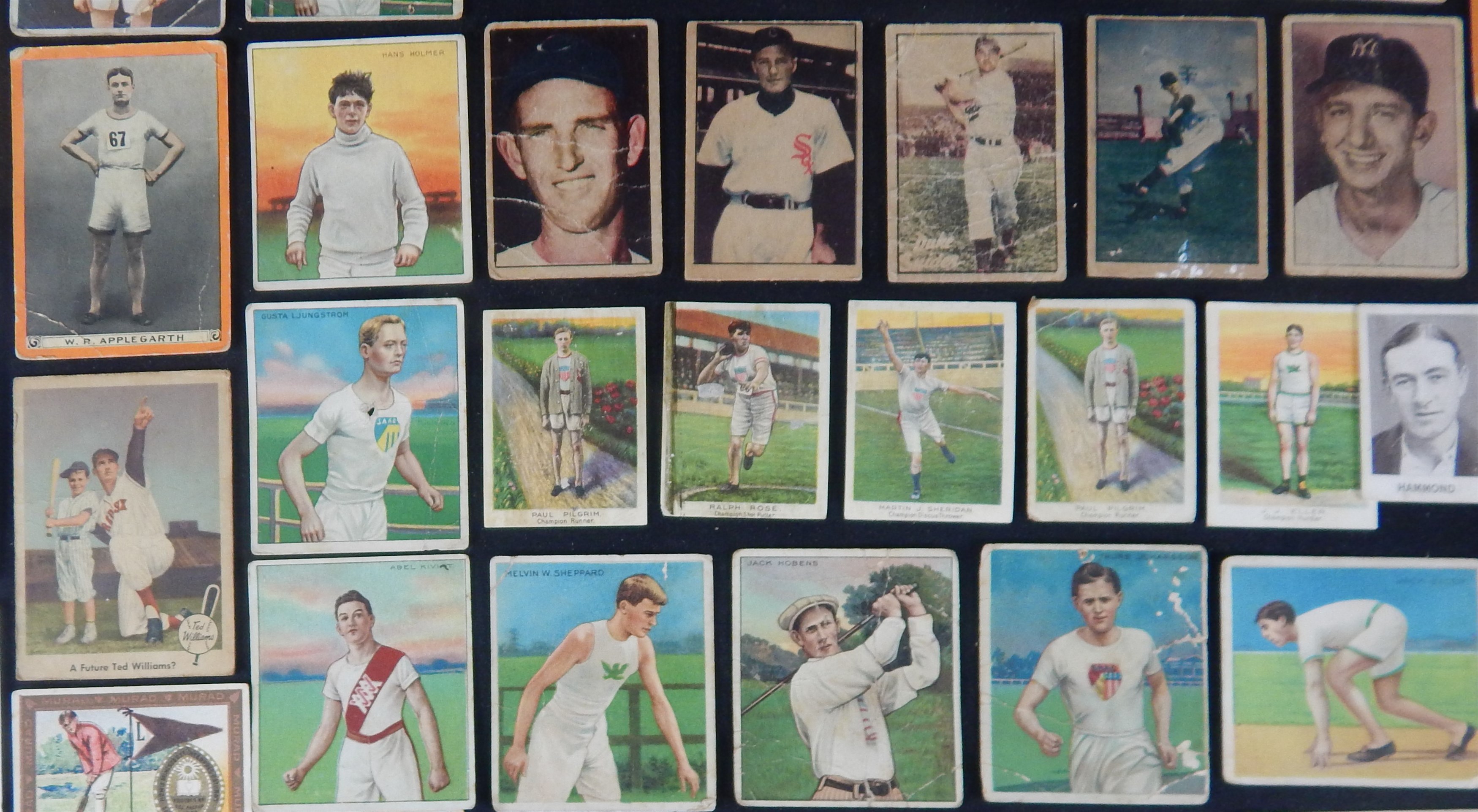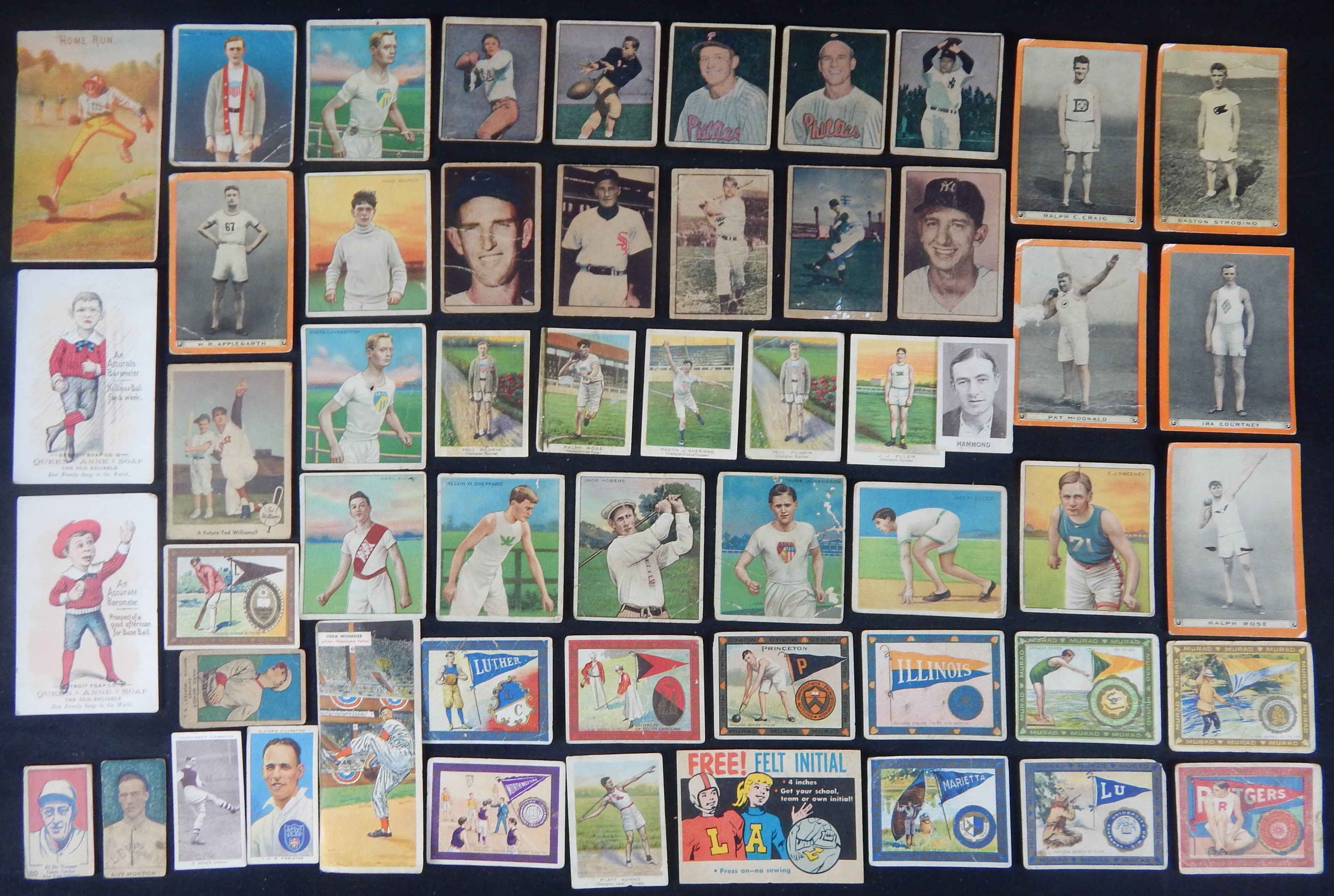 Eclectic collection of 60 mixed grade cards including 1910s baseball strip cards, Pan Handle scrap, 1910s Mecca track and field, Murad and some Berk Ross cards. See images.
