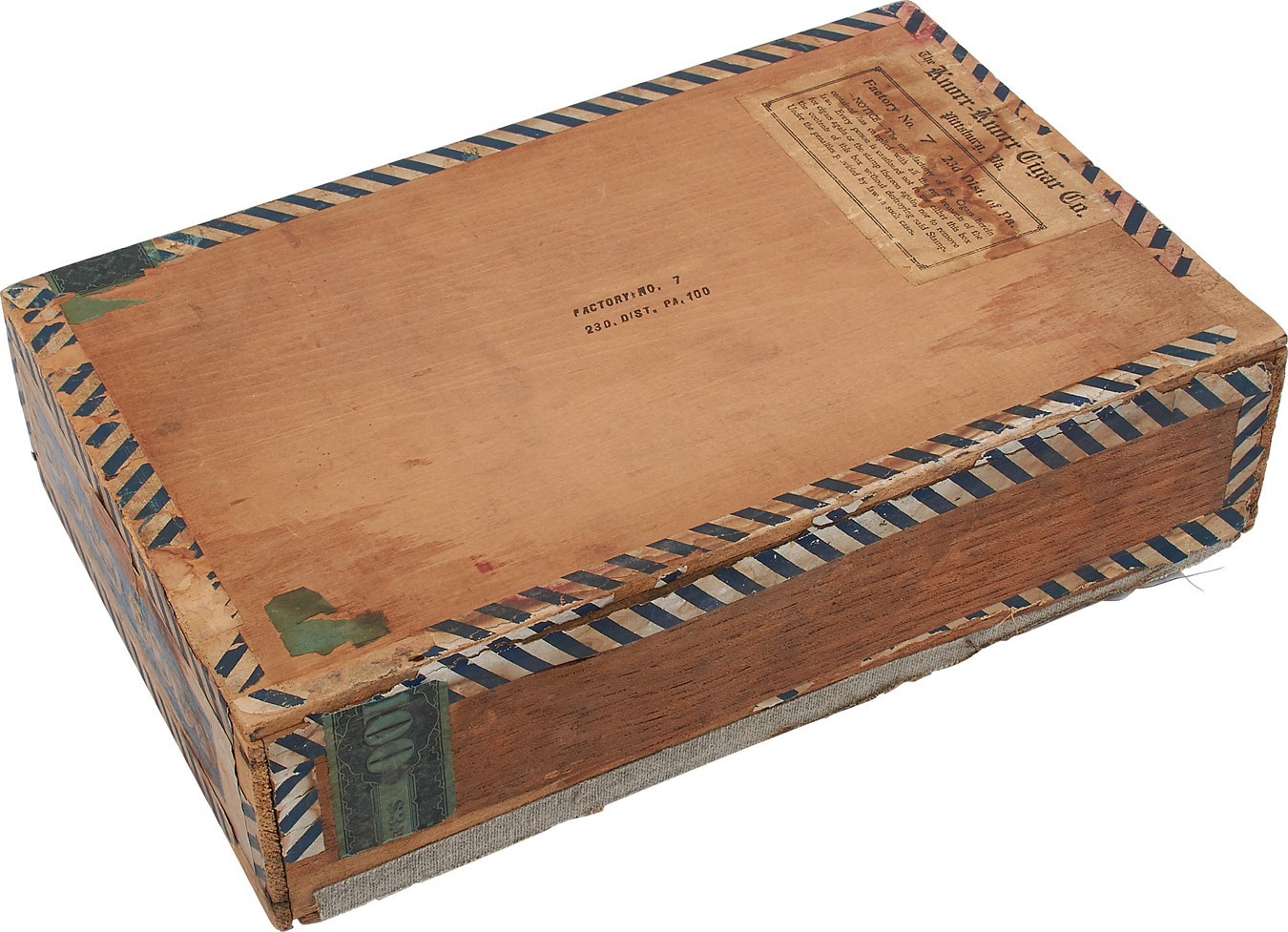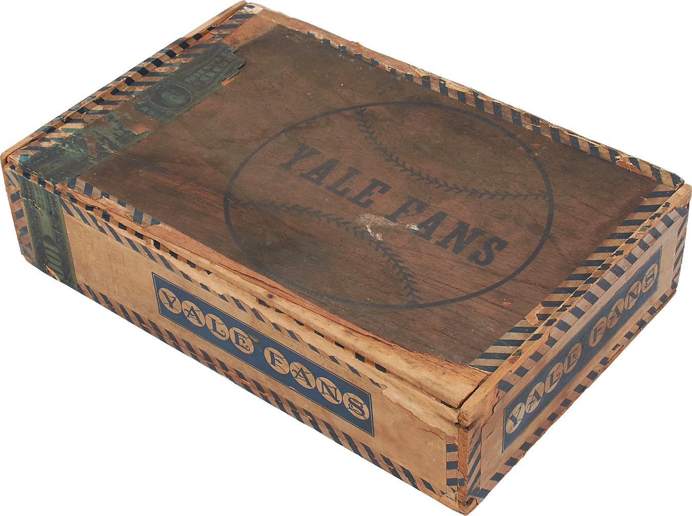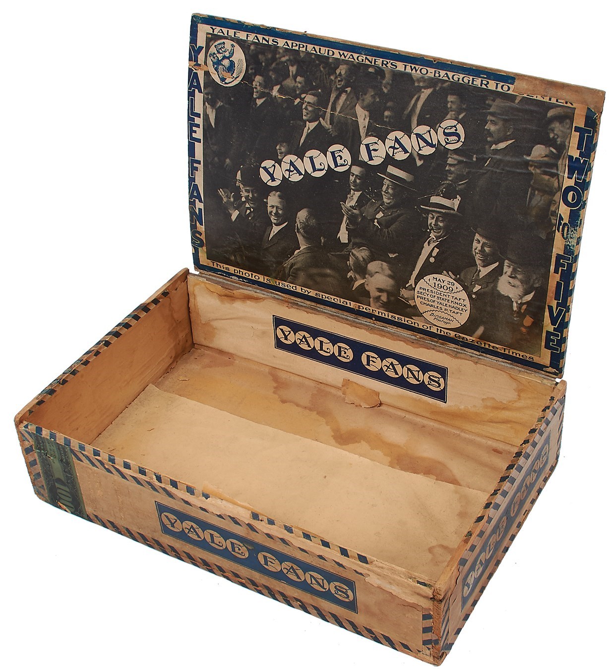 This is a magnificent and large size cigar box, and the only one known. "Yale Fans" with big baseball image is burned into the top, the inner label shows President Taft in the stands with the Yale President, Secretary of State, and reads, "Yale Fans Applaud Wagner's Two Bagger." This refers to the one and only Honus Wagner. Photogravure label is dated May 29, 1909, and the details are inside a baseball, lists who was there and "Photog Bingman." Along three sides are "Yale Fans" labels in this incredible crossover made for Yale because of Hadley. It has wear to the outside, top is missing paper and there's minor water damage inside. Inner label is intact except for a small piece on the top right. Measures 11x7x2.75". One of the best from the finest collection of baseball and sports cigar boxes ever to be offered for public auction.