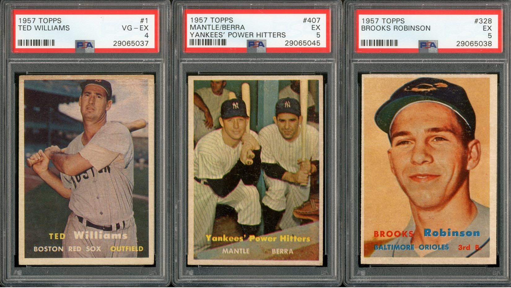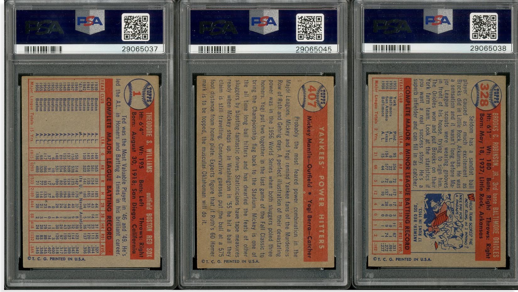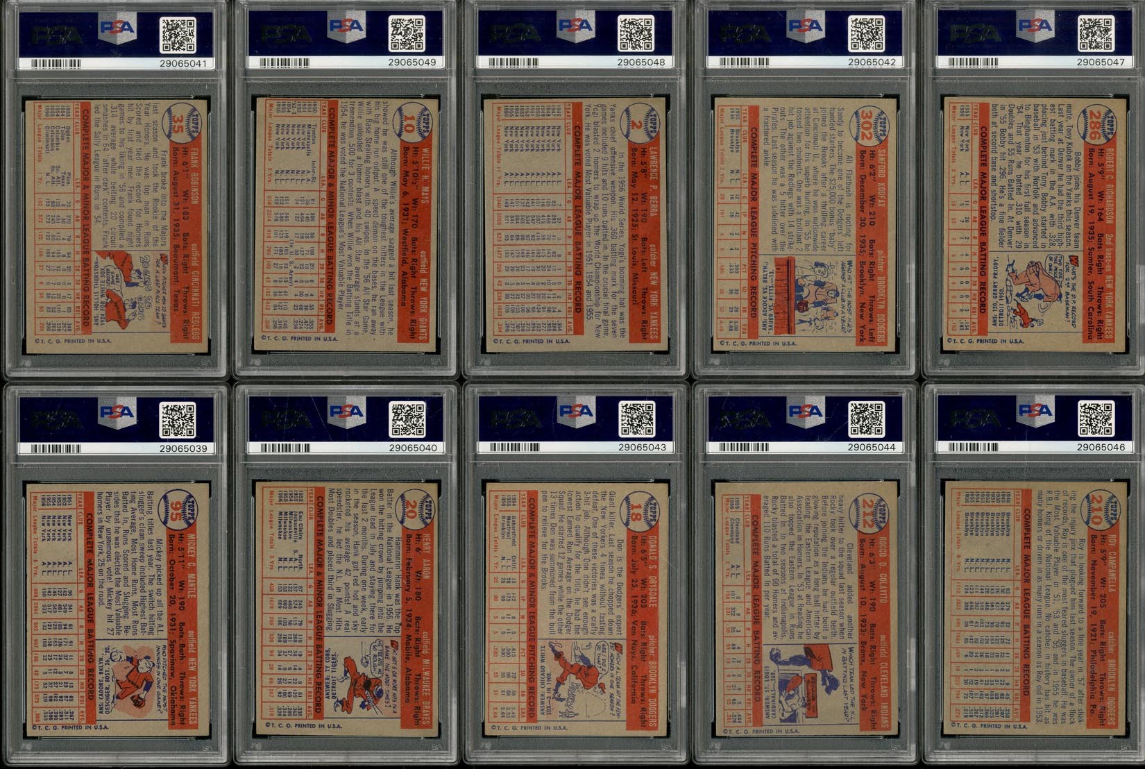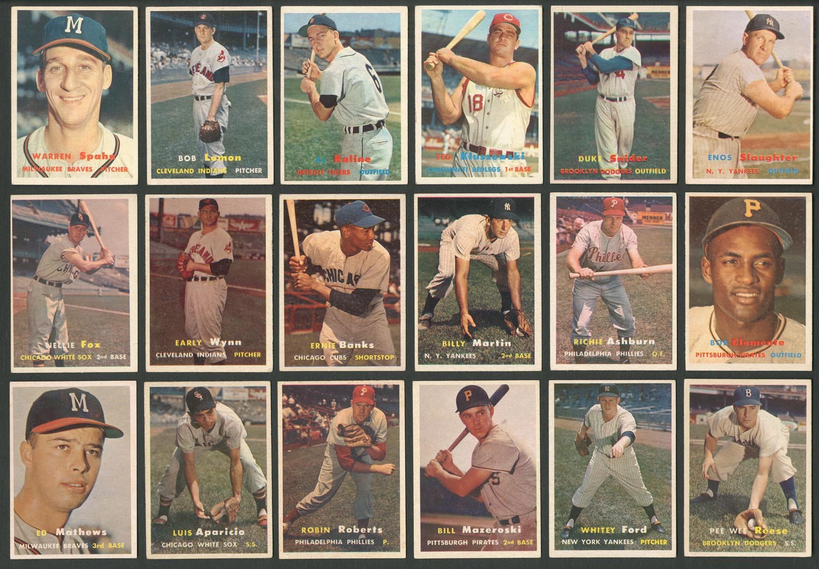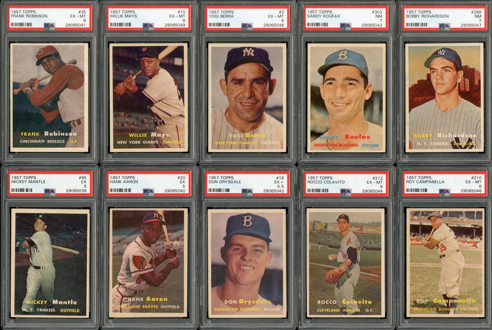 Includes: Graded Cards - PSA NM 7: 2 cards w/#286 Richardson RC and 302 Koufax. PSA EX-MT 6: 5 cards w/#2 Berra, 10 Mays, 35 Robinson RC, 210 Campanella and 212 Colavito RC. PSA EX+ 5.5: 1 card, #18 Drysdale RC. PSA EX 5: 4 cards w/#20 Aaron, 95 Mantle, 328 Robinson RC and 407 Mantle/Berra. PSA VG-EX 4: 1 card, #1 Williams. Ungraded Cards - #7 Aparicio (EX), 15 Roberts (EX), 24 Mazeroski RC (NM), 25 Ford (EX/MT), 30 Reese (EX), 38 Fox (VG/EX), 55 Banks (EX), 62 Martin (EX/MT), 70 Ashburn (VG/EX), 76 Clemente (EX), 90 Spahn (EX), 97 Yankees (EX), 120 Lemon (VG/EX), 125 Kaline (VG/EX), 165 Kluszewski (EX), 170 Snider (EX/MT), 210 Campanella (PSA - NM), 215 Slaughter (EX/MT), 250 Mathews (NM), 312 Kubek RC (EX/MT), 324 Dodgers (EX/MT), 338 Bunning RC (EX/MT), 400 Dodgers' Sluggers (VG/EX). Grades 20% NM or better, 65% EX to EX/MT, 15% VG to VG/EX, a few lesser.