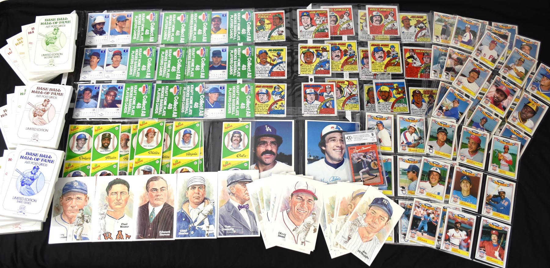 Eclectic collection of 1980s cards including a partial Perez Steele HOF Postcard set.