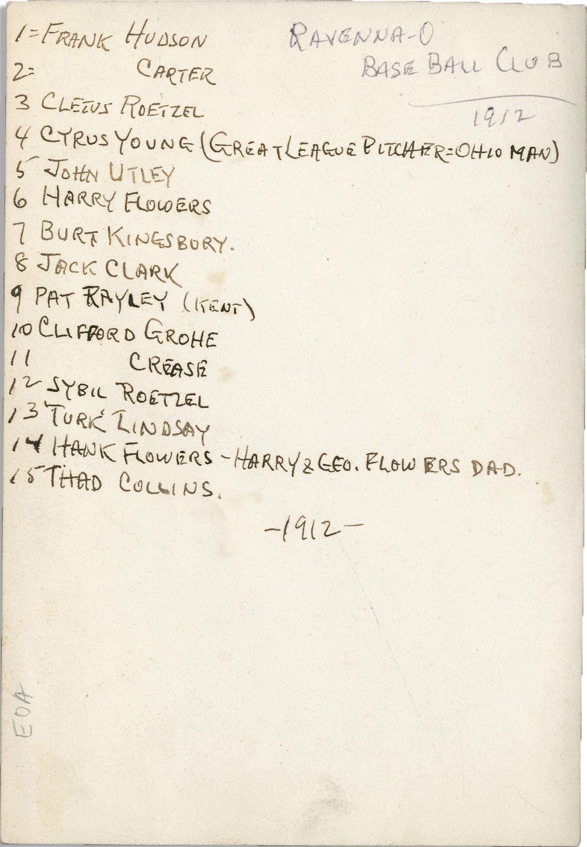 He played first base and pitched the last inning in one of the two doubleheader games. A handwritten roster on back includes Young, and numbers on the back roster correlate to numbers written on the players on front.