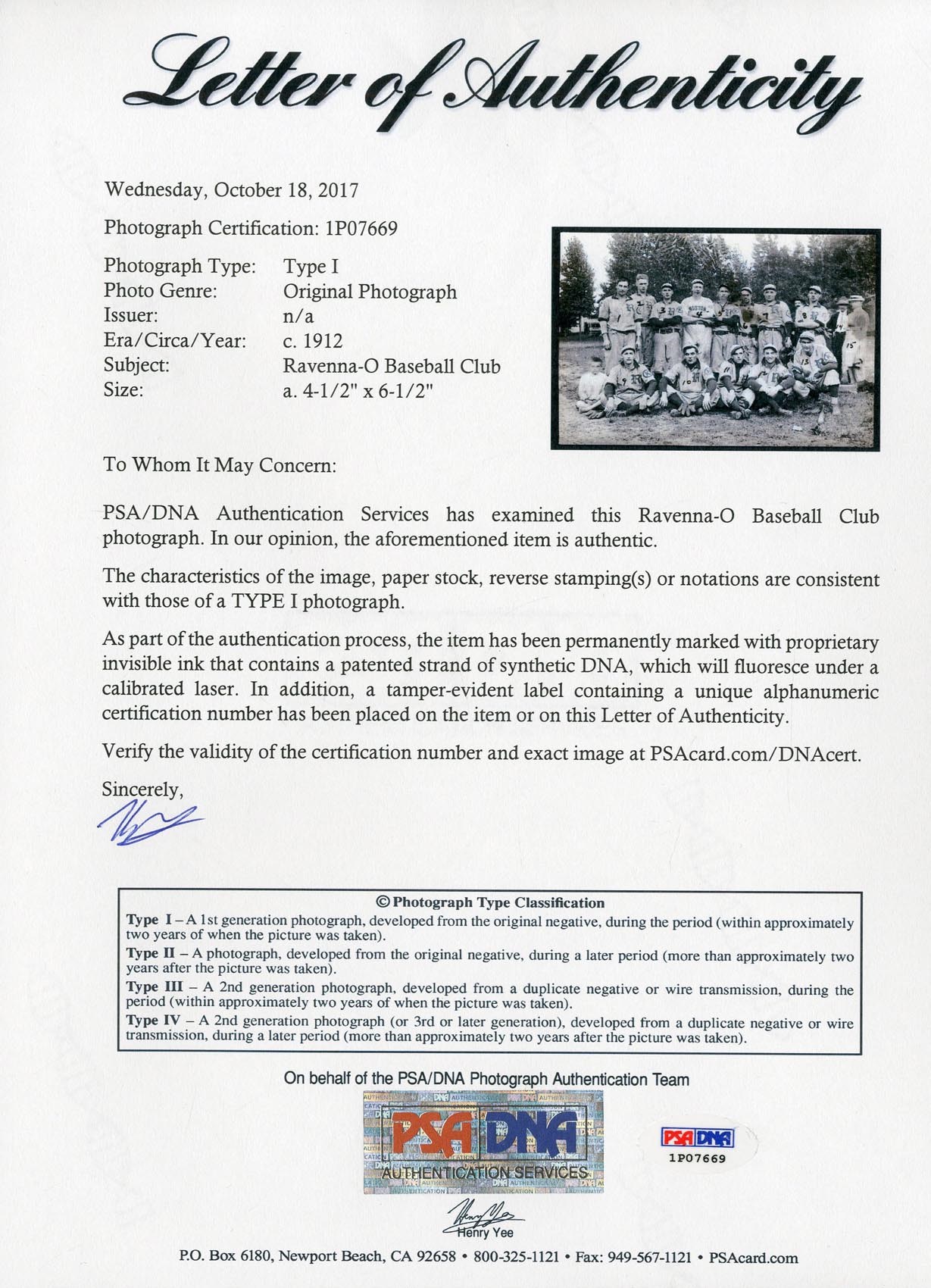 Measures 4.5x6.5", and comes with PSA LOA.