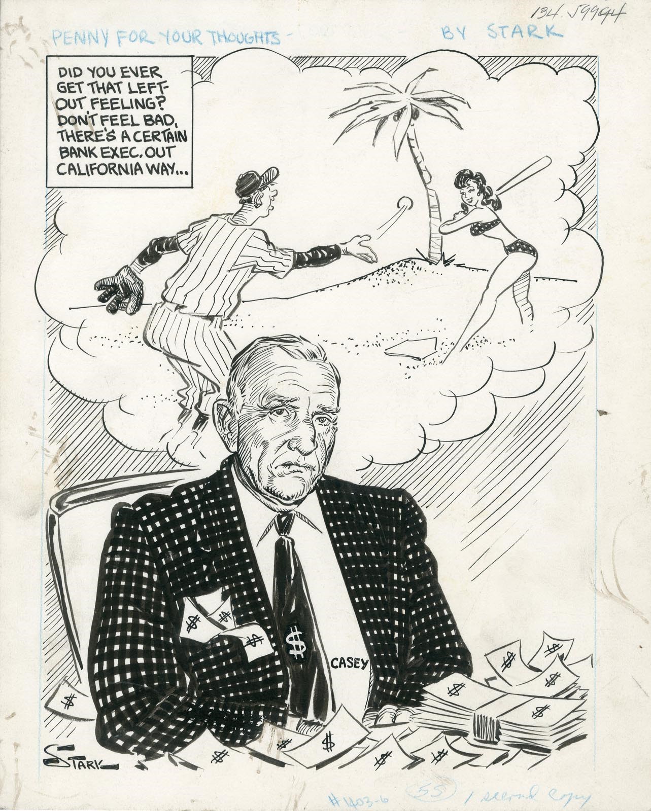 Original pen & ink from important sports artist Bruce Stark. Features Casey Stengel amidst a stacks of cash most likely dreaming of missing out on the NY Yankees 61' & 62' World Series wins. Stengel had been manager of the Yanks from 1949-1960, and spent 1961 working as vice president of the Glendale Valley National Bank which was owned by members of Edna Stengel's family. "Did you ever get that left out feeling? Don't feel bad, there's a certain bank exec. out California way..." Came from Sporting News and was published.
