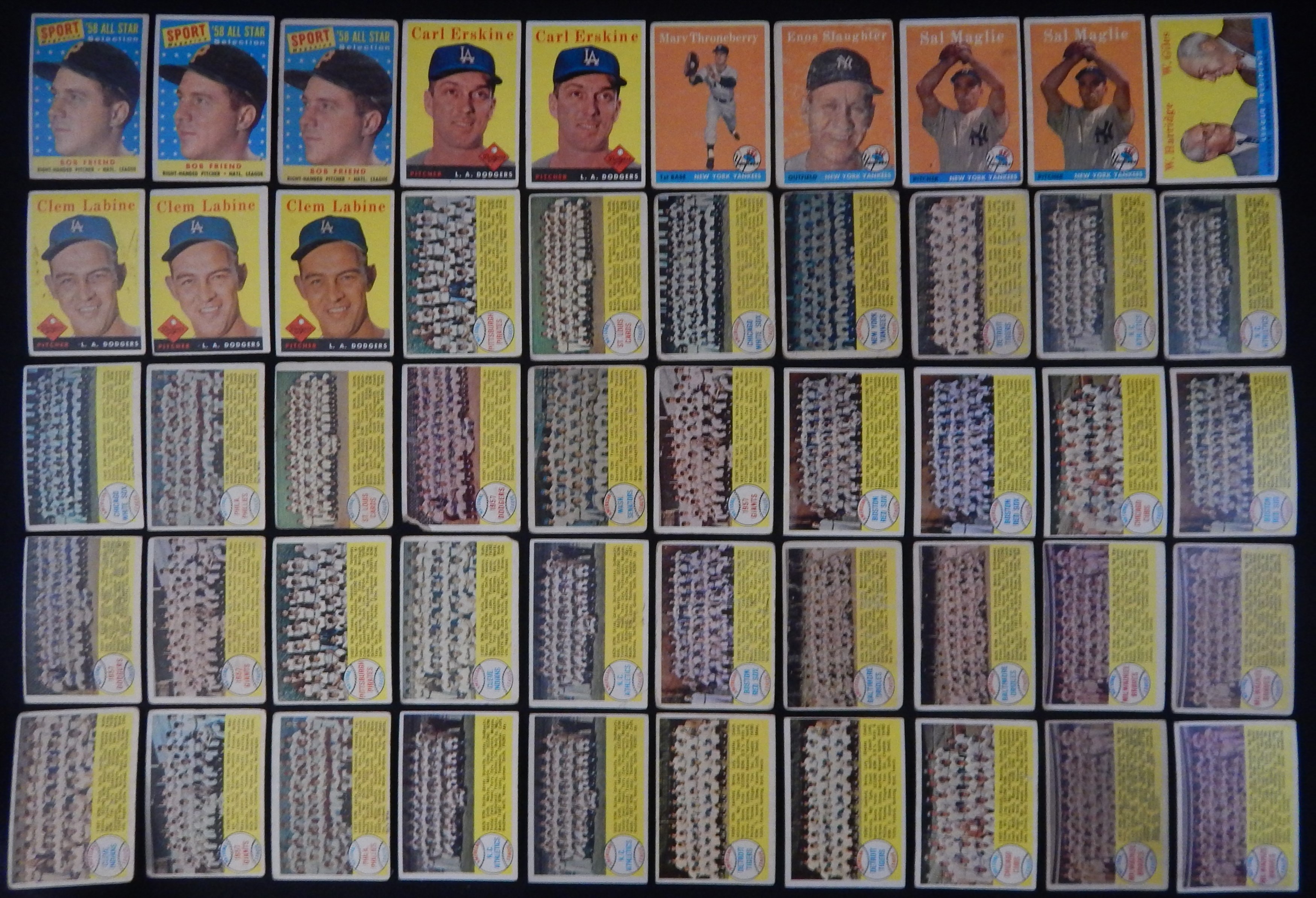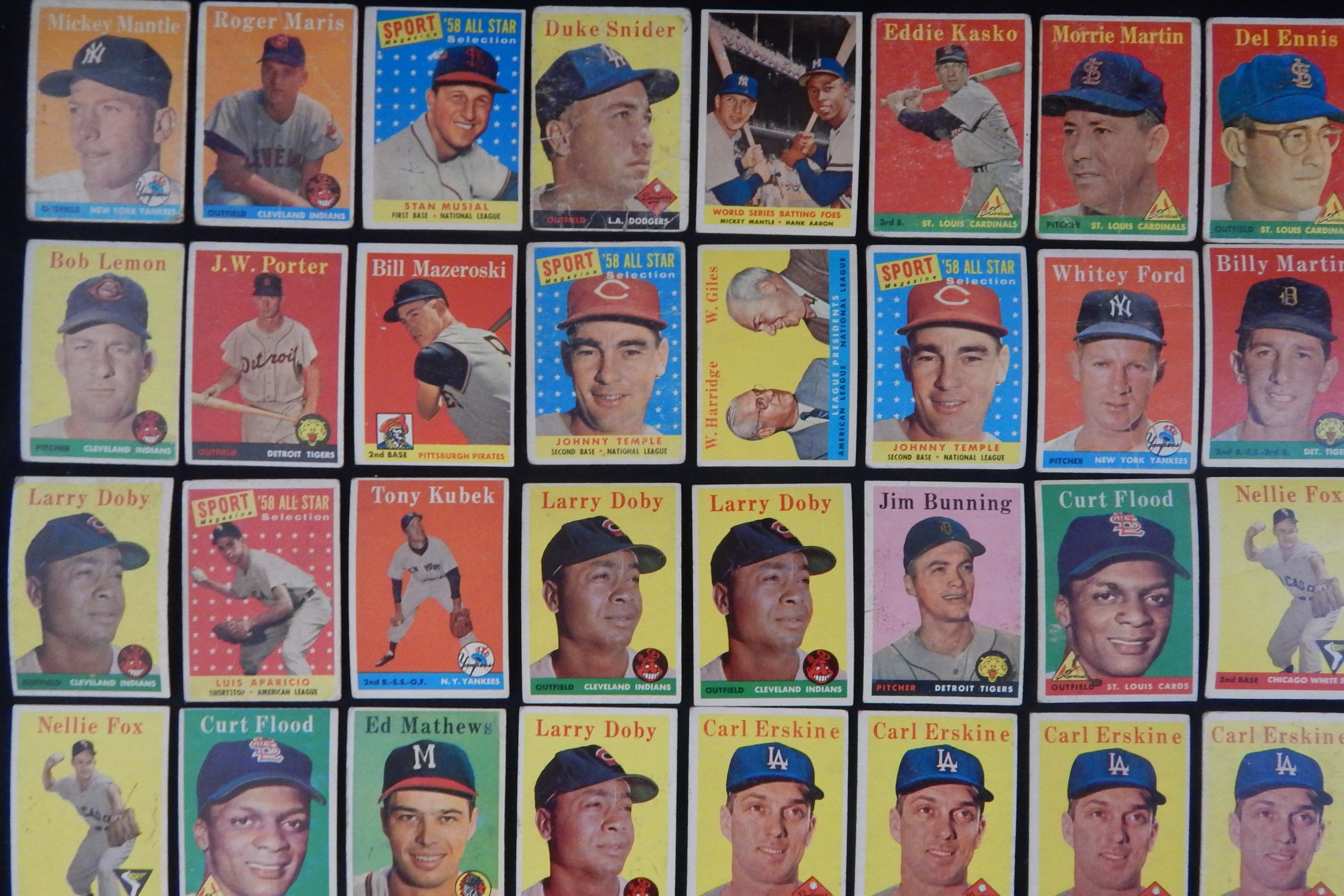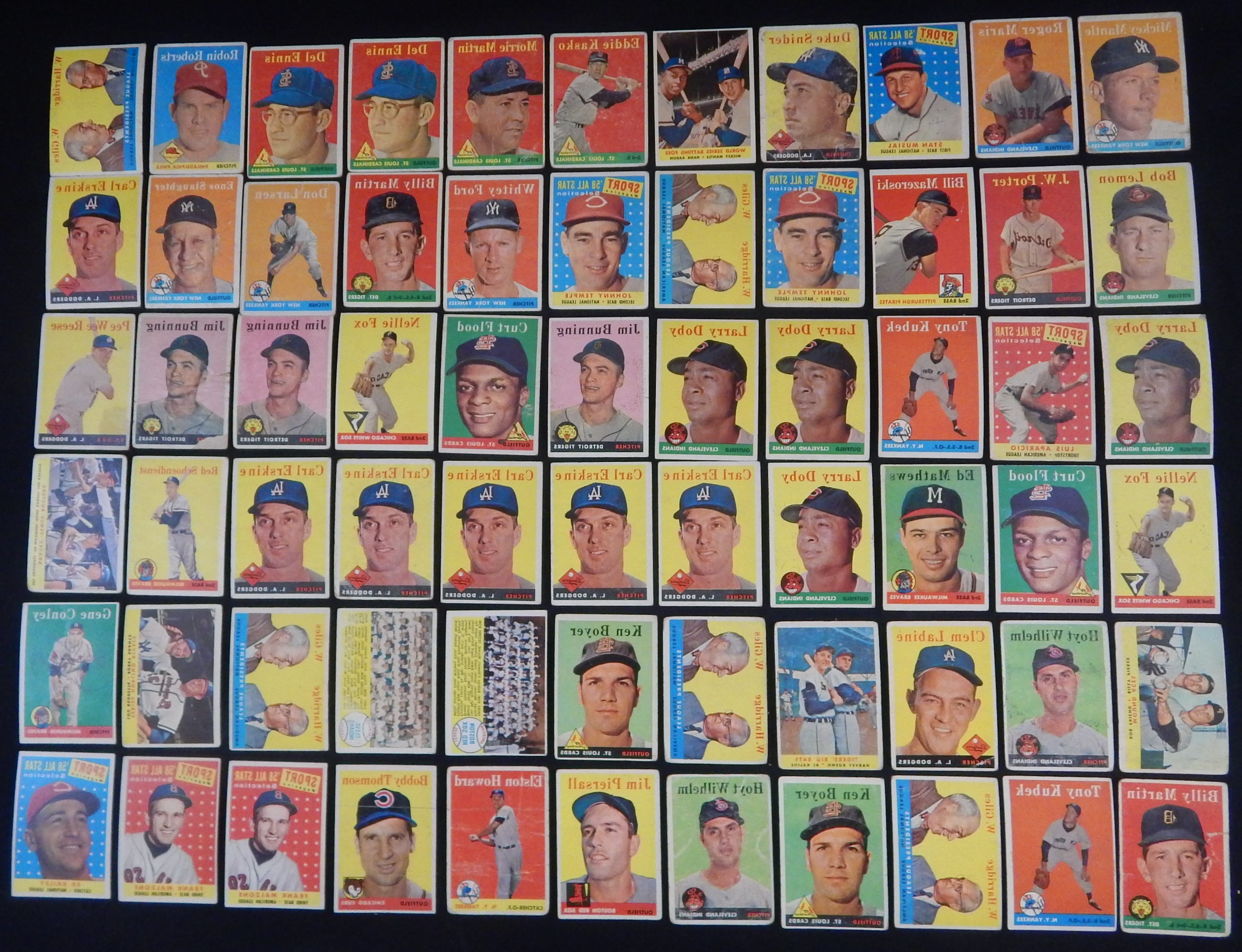 Total of 2,000+ cards, mostly lower-to-mid grade, including #47 Maris RC (FR), 88 Snider, 150 Mantle (PR), 310 Banks (really, really bad), 375 Reese, 418 Mantle/Aaron (GD), 476 Musial AS (FR, ink), specials, teams (30), minor stars, yellow letters (4) and other HOFers such as Bunning, Roberts, Schoendienst etc.