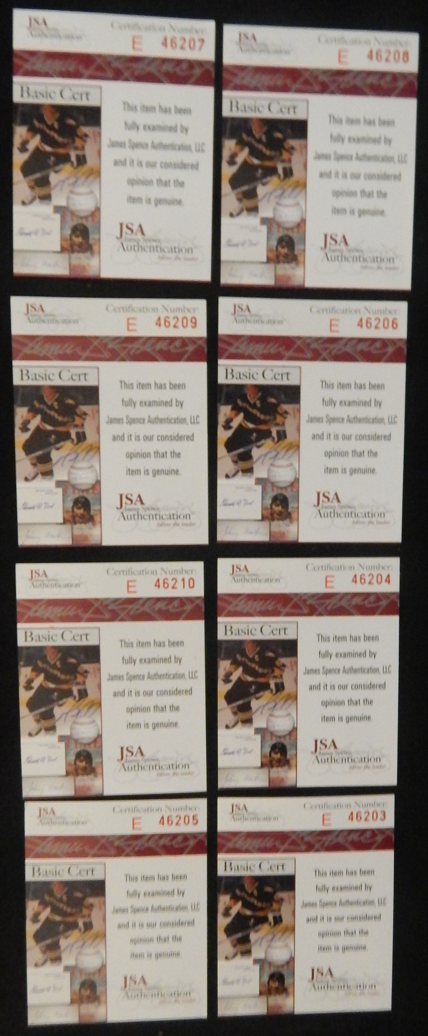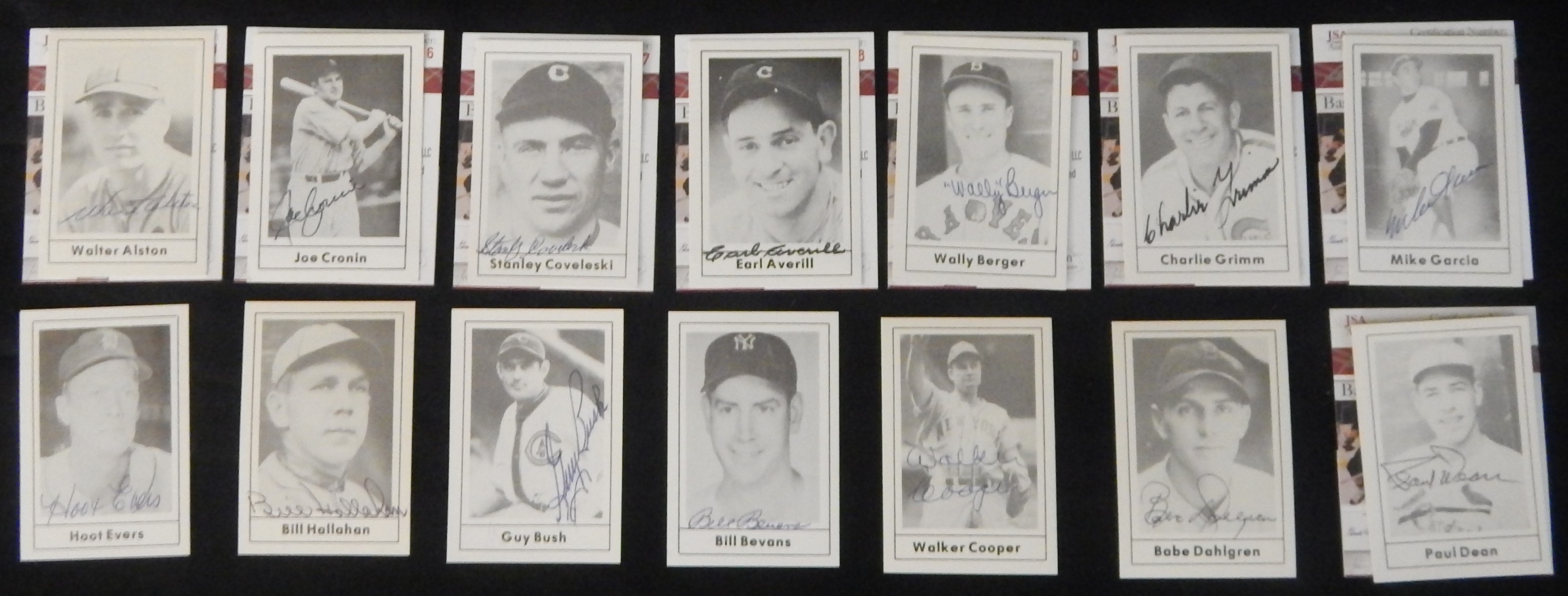 All 14 cards are signed (badly in sharpie and ink), and are authenticated by JSA. HOFers; Joe Cronin, Walter Alston Earl Averill, and Stan Coveleski. Other cards included; Wally Berger, Bill Bevans, Guy Bush, Walker Cooper, Stanley Coveleski, Babe Dahlgren, Paul Dean, Hoot Evers, Mike Garcia, Charlie Grimm, Bill Hallahan.