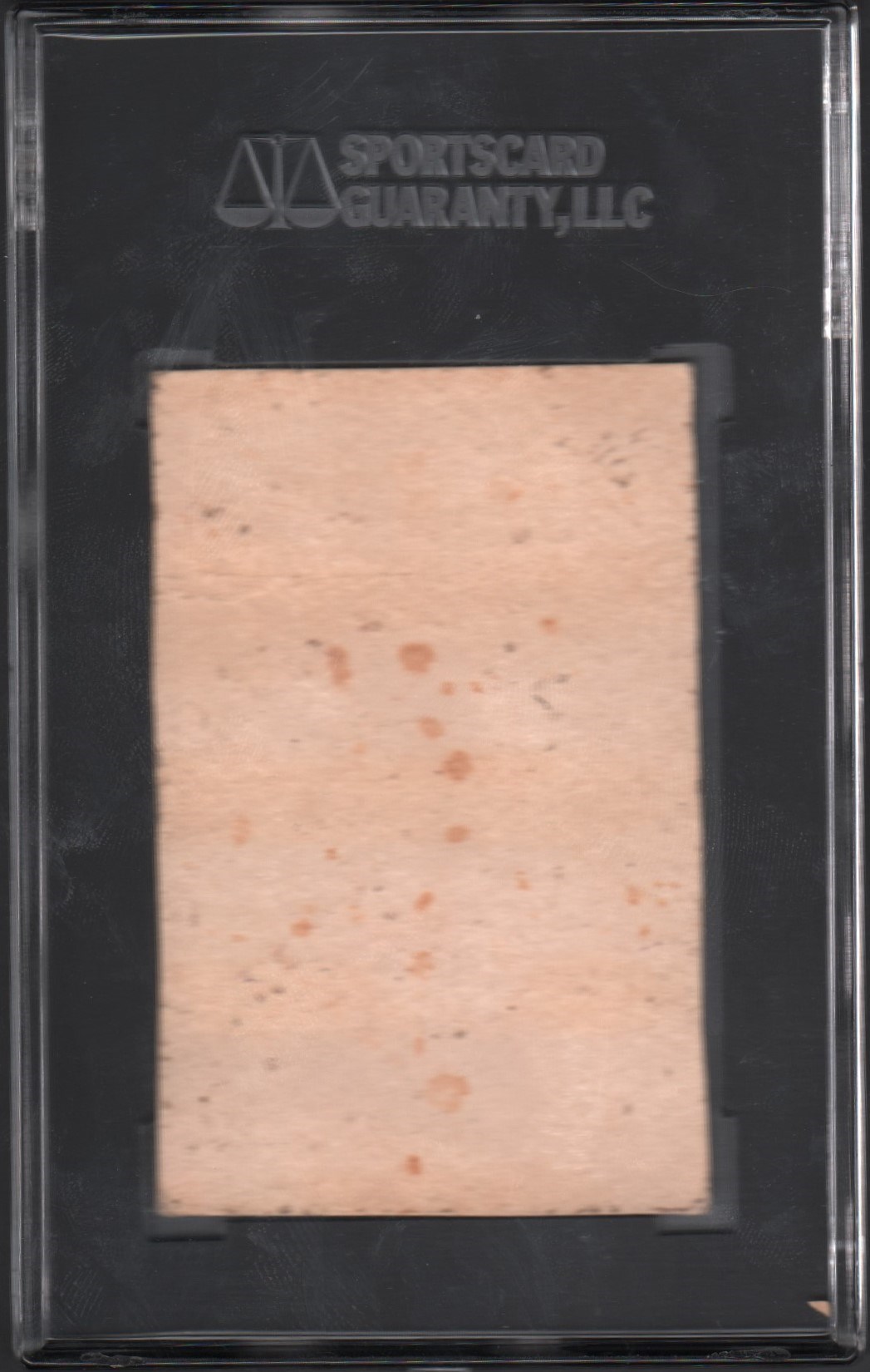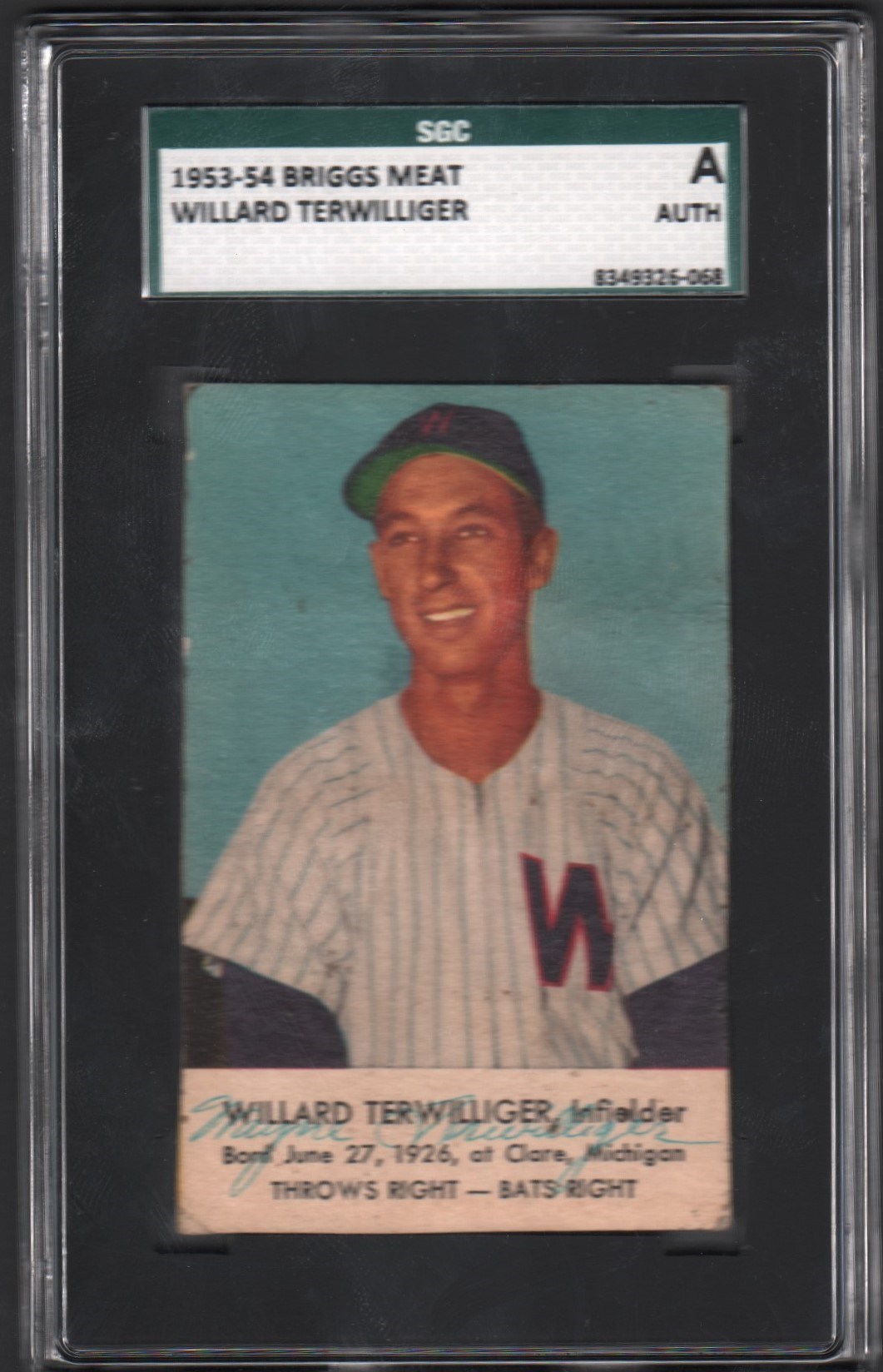 Ultra rare regional food issue featuring Willard (Wayne) Terwilleger of the Washington Senators. The 1950s were the decade of the food regional issues, with Briggs Meat issue being one of the most rare. This regional issue included 2 player panels on hot dog packages and utilized the same images from the 1950’s Dan Dee Potato Chips and Stahl Meyer Franks sets, and were comprised of 28 Washington Senators players and 12 New York subjects. With their waxed surfaces, tendency to stain as well as nearly all of the cards being cut from their panels by excited young men, the Brigg’s Meats cards are the most condition sensitive cards of this food issue time period. Graded and authenticated by SGC as AUTHENTIC.