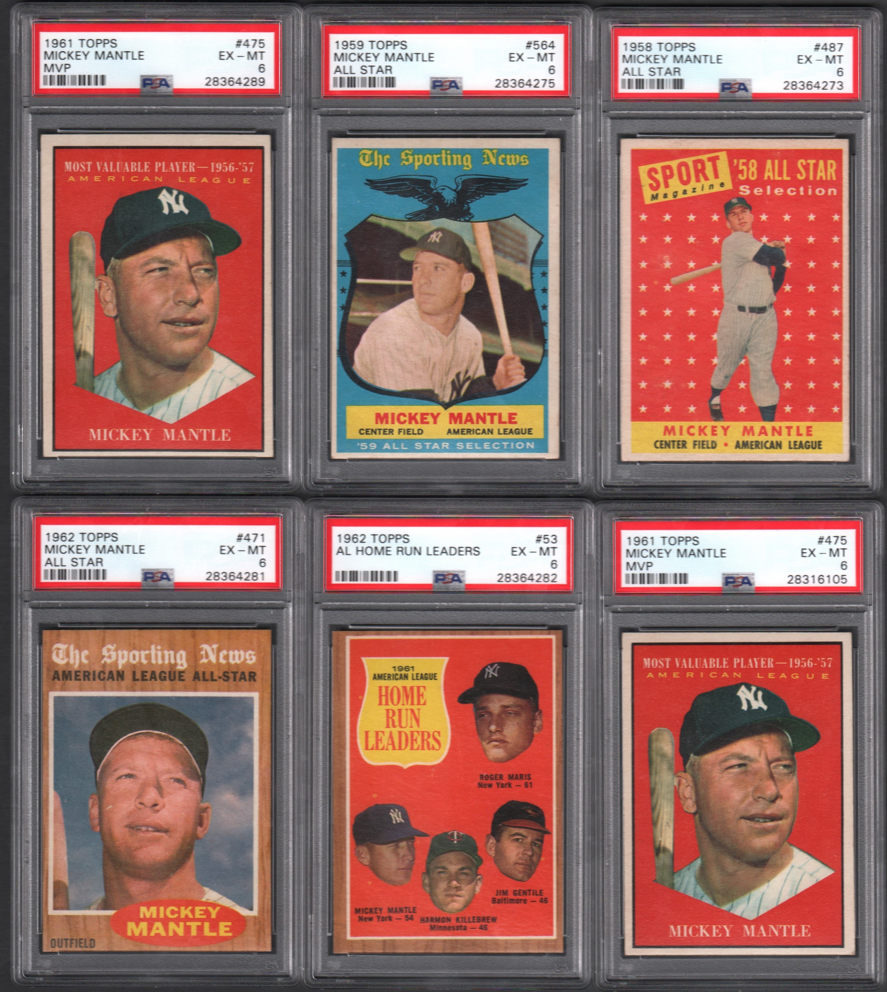 Fresh PSA graded collection of SEVEN Mickey Mantle cards, all graded by PSA EX-MT 6. Each card is a secondary Topps cards with leaders, all-stars and specials.