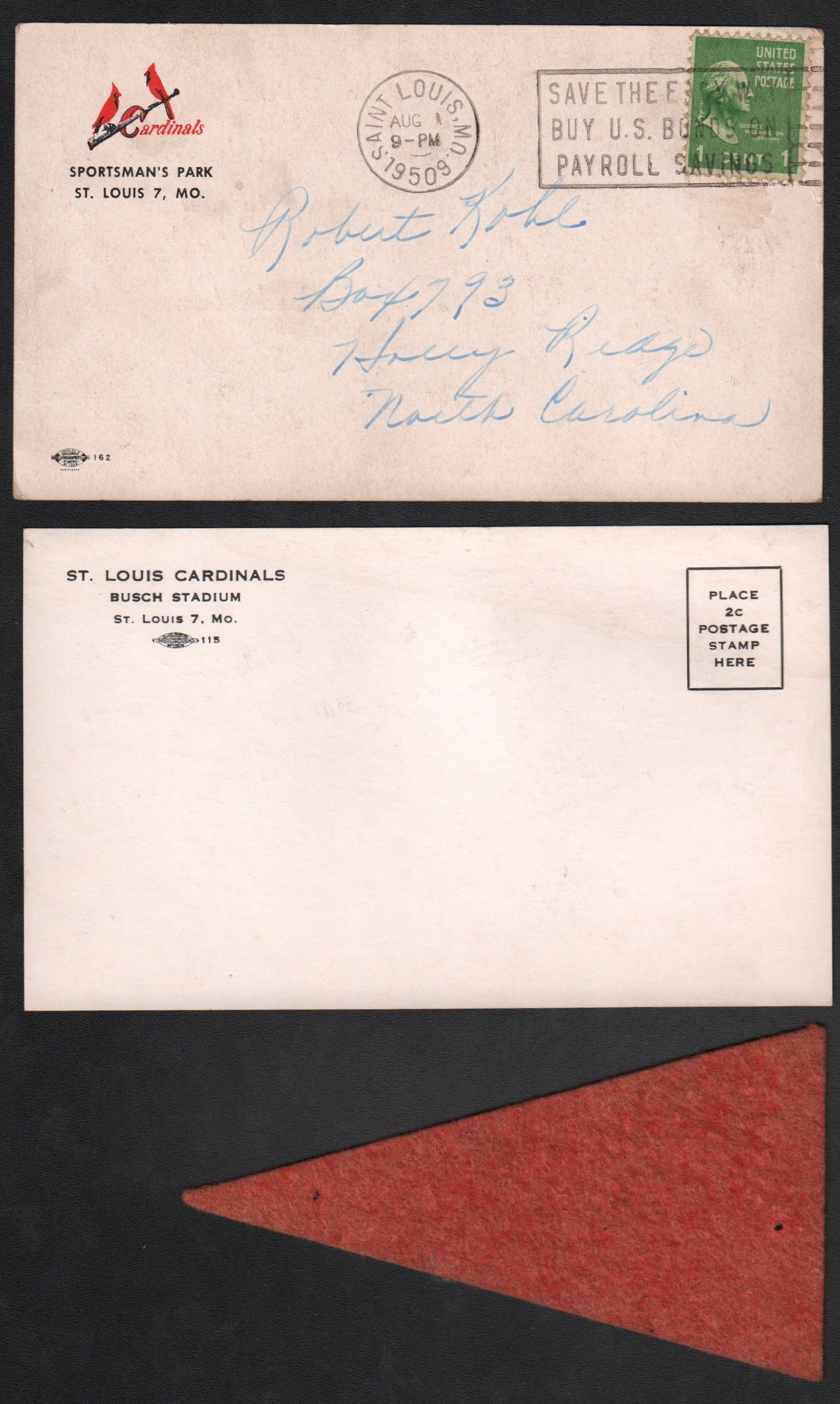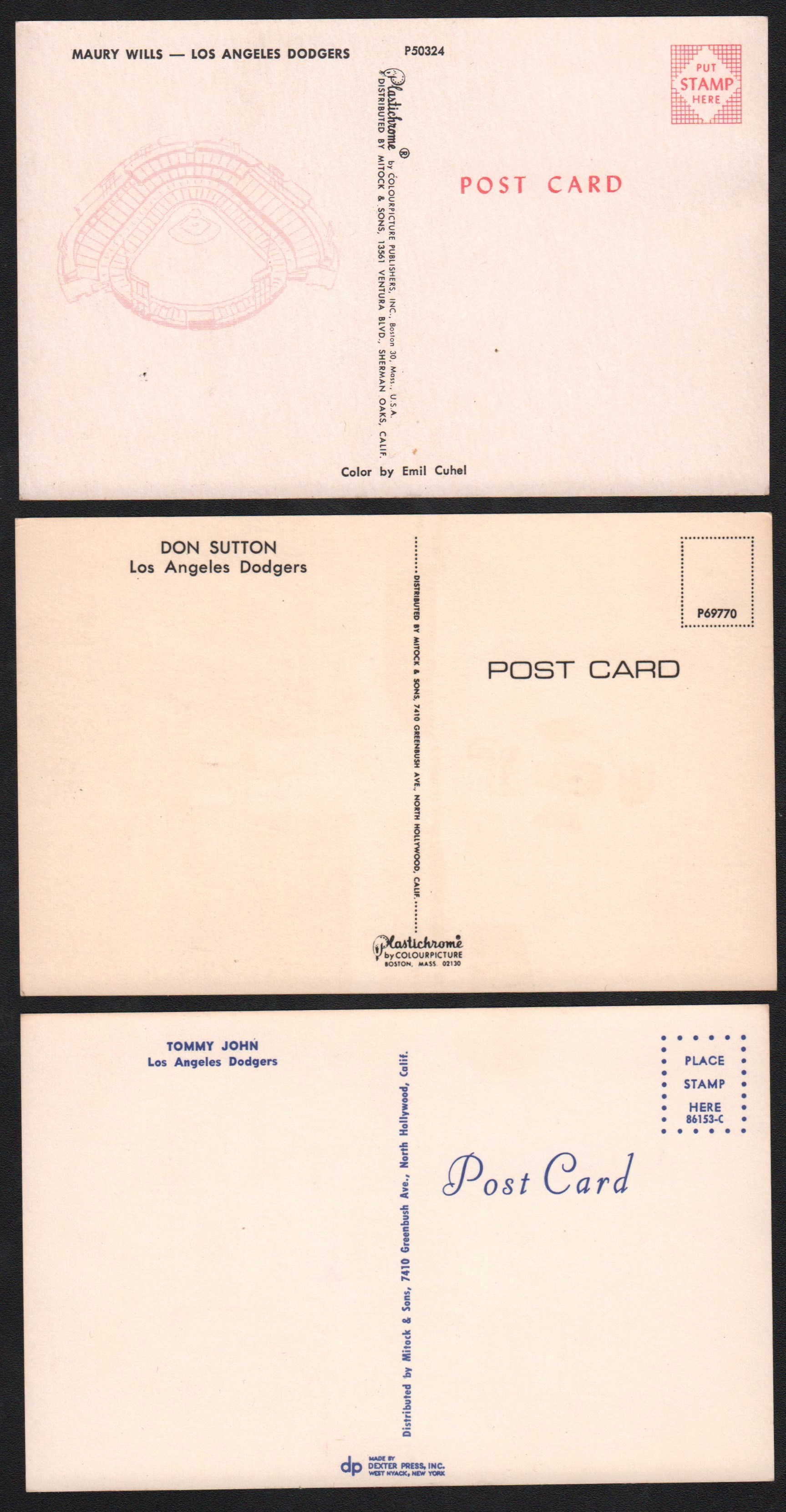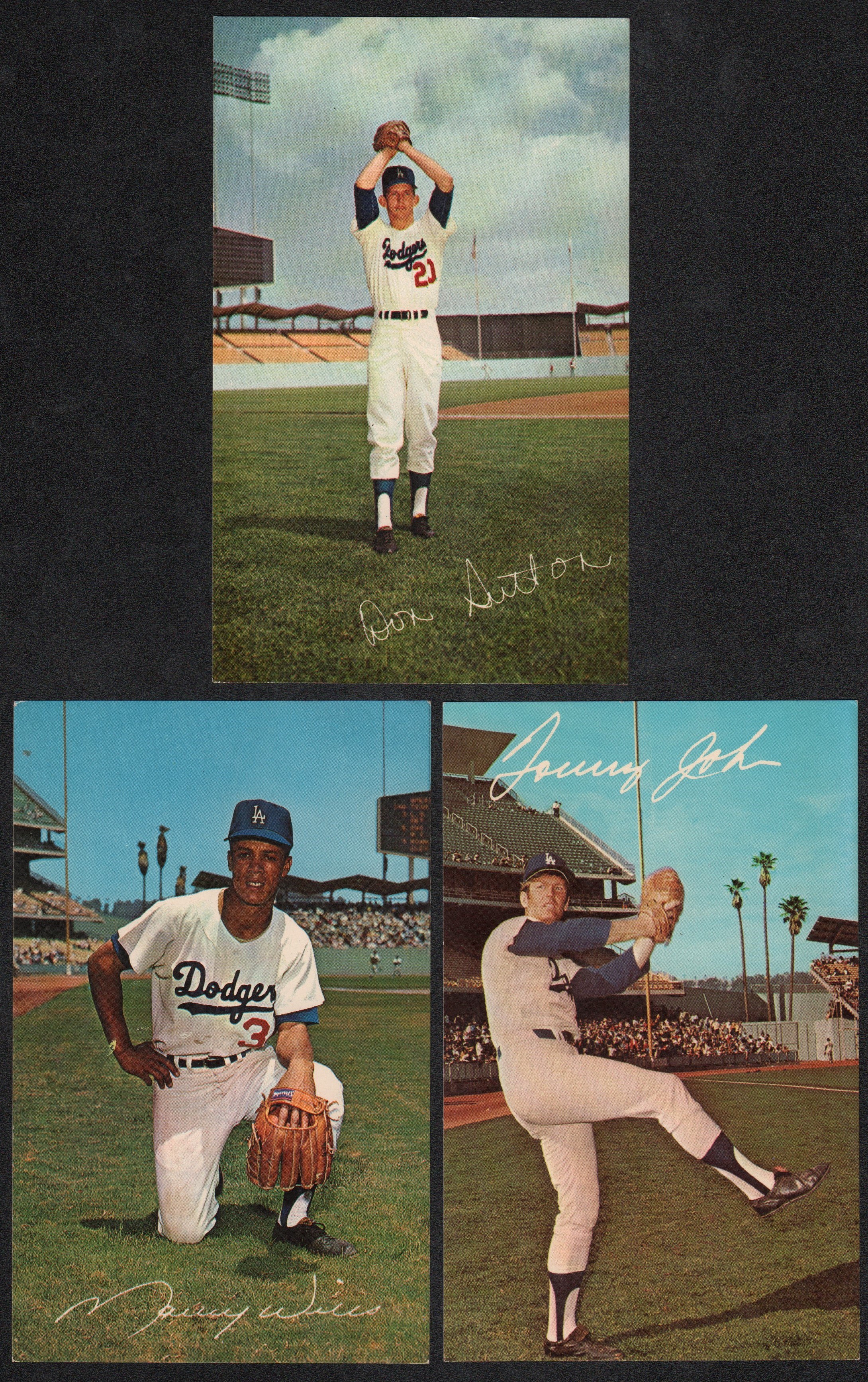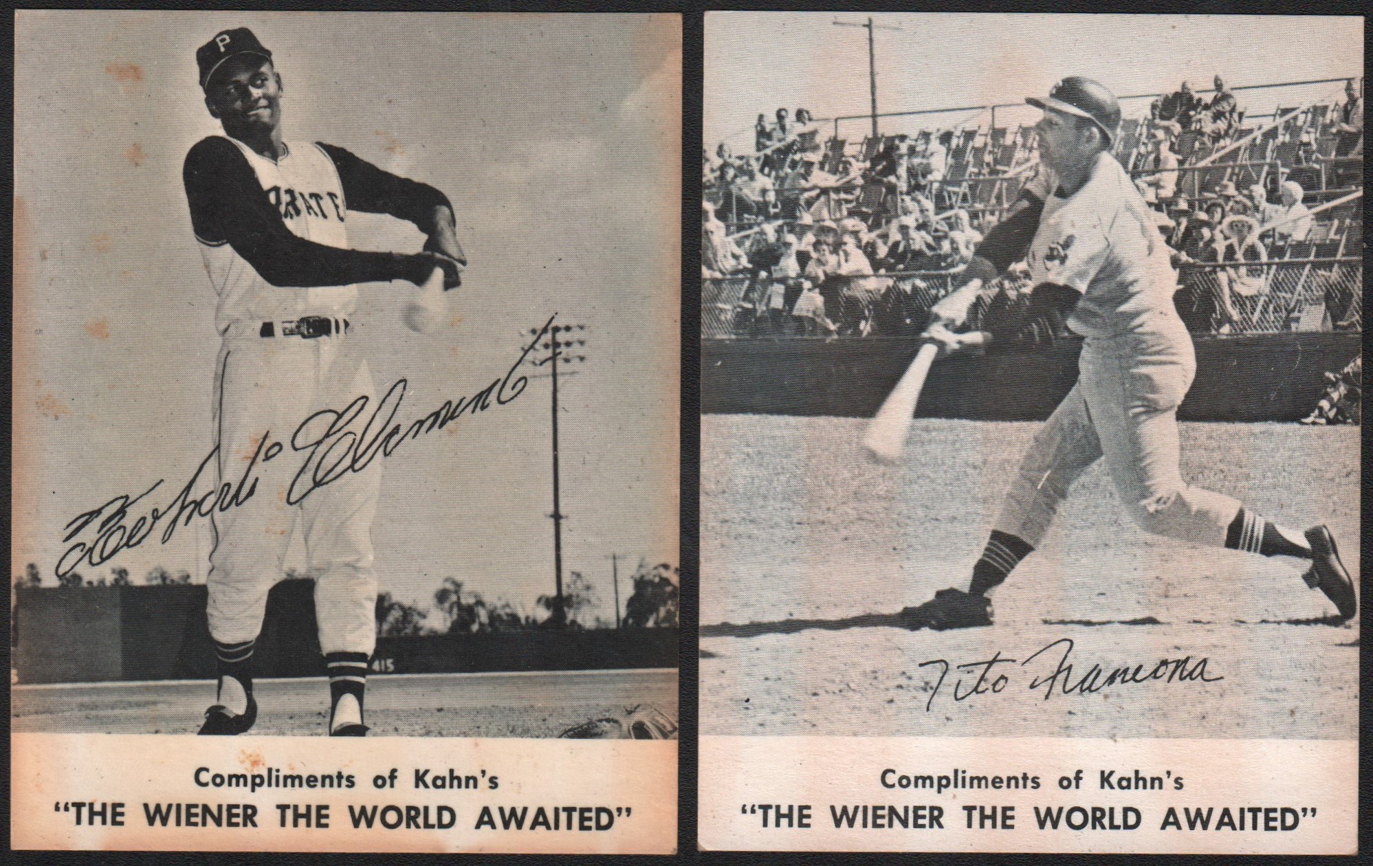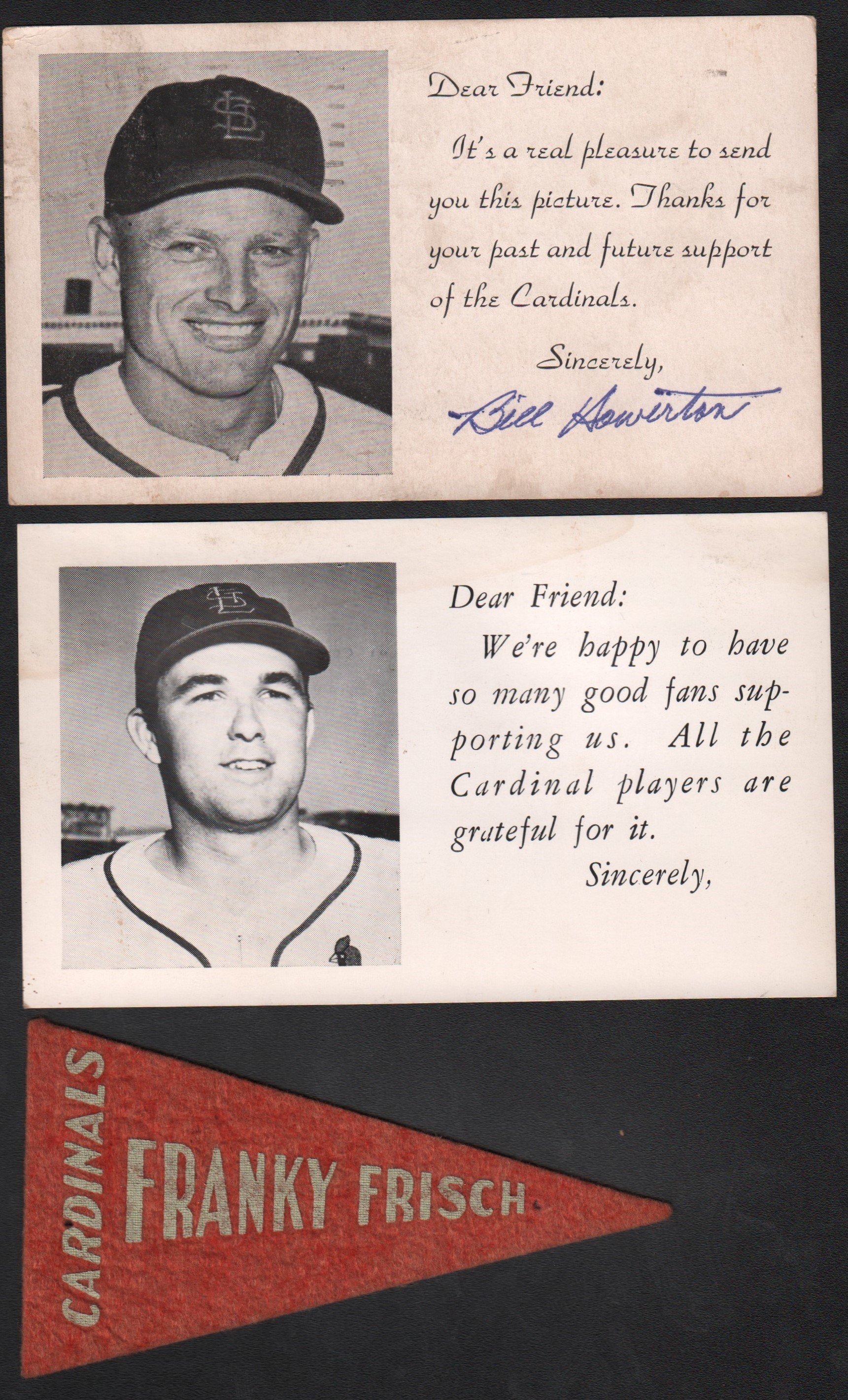 Includes: 1930s Mini Pennants - 1 pennant, Frish (FR). 1962 Kahn's - 2 cards w/Clemente (VG - toning) and Musial (EX). L.A. Dodgers postcards - 3 w/John, Sutton and Wills. 1950s Cardinals Postcards - 2 w/Howerton (signed).
