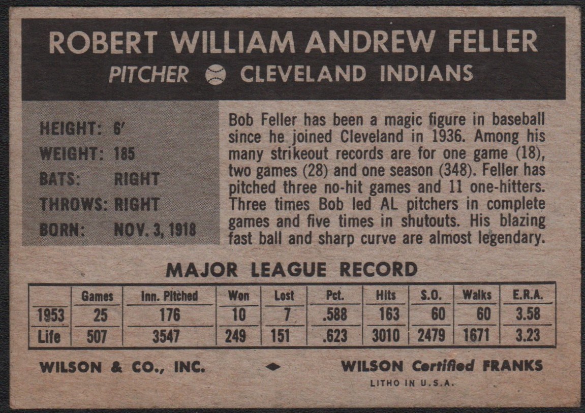 1954 Wilson Franks card of Bob Feller - Grades VG.