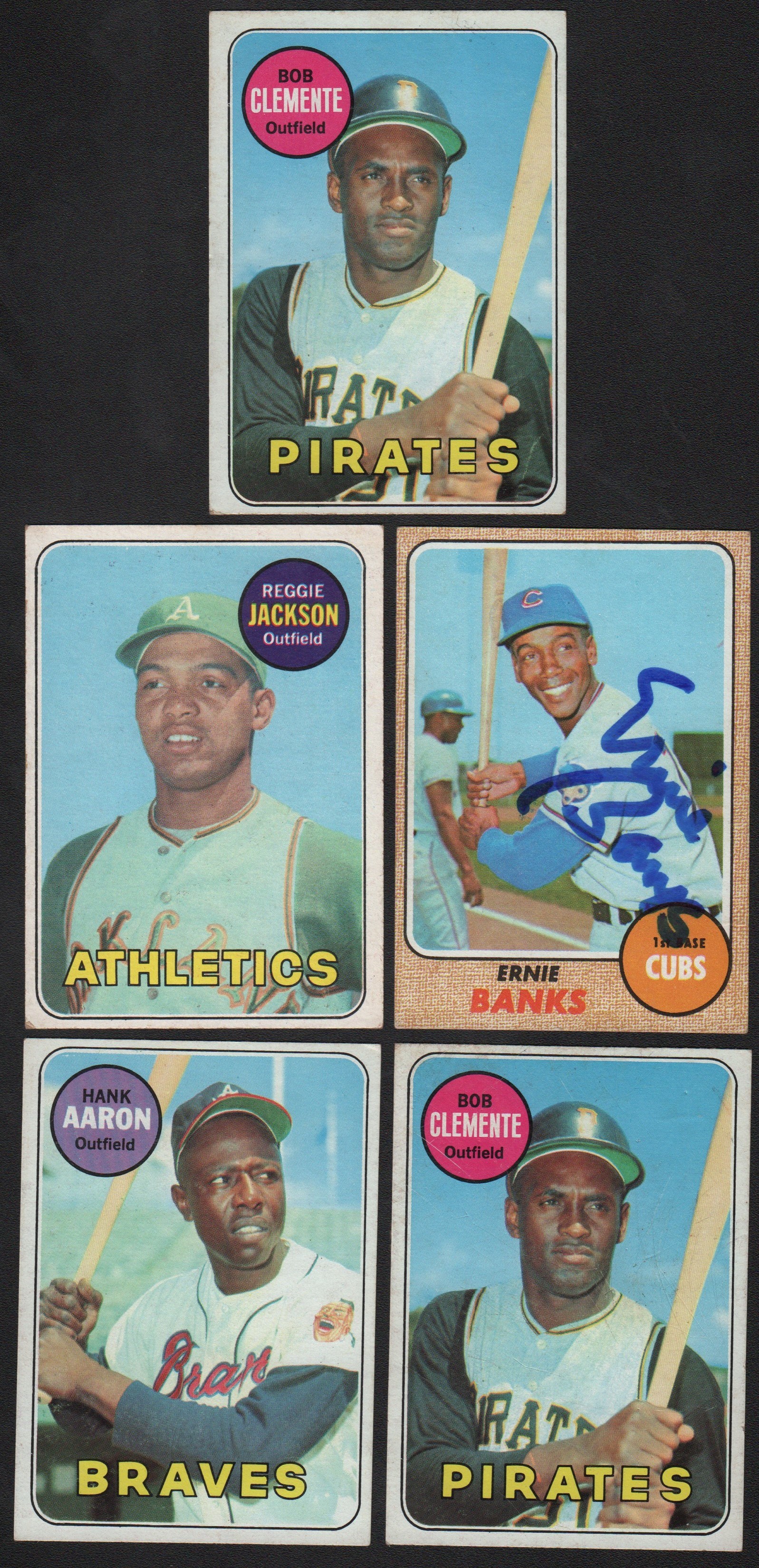 Nice offering of 14 Topps star and Hall of Famers. Breakdown of the cards, by year: 1961: Santo rookie EX. 1964: Mays G-VG. 1966: Mantle G and Koufax G. 1967: Brock & Flood Cards Clubbers VG. 1968: Mantle VG-EX, Mays VG, Banks (signed) EX, Maris EX, Durocher EX+. 1969: Reggie Jackson rookie G-VG, Clemente (2) VG, Aaron VG. Great lot of some of the biggest names to ever play the game, and the most important names in card collecting.