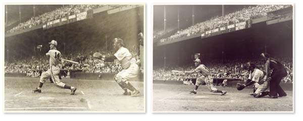 The one-armed war veteran who still managed to bat a respectable .218 for the St. Louis Browns is pictured in two action shots, batting against the Detroit Tigers during that team’s Championship season. NRMT.