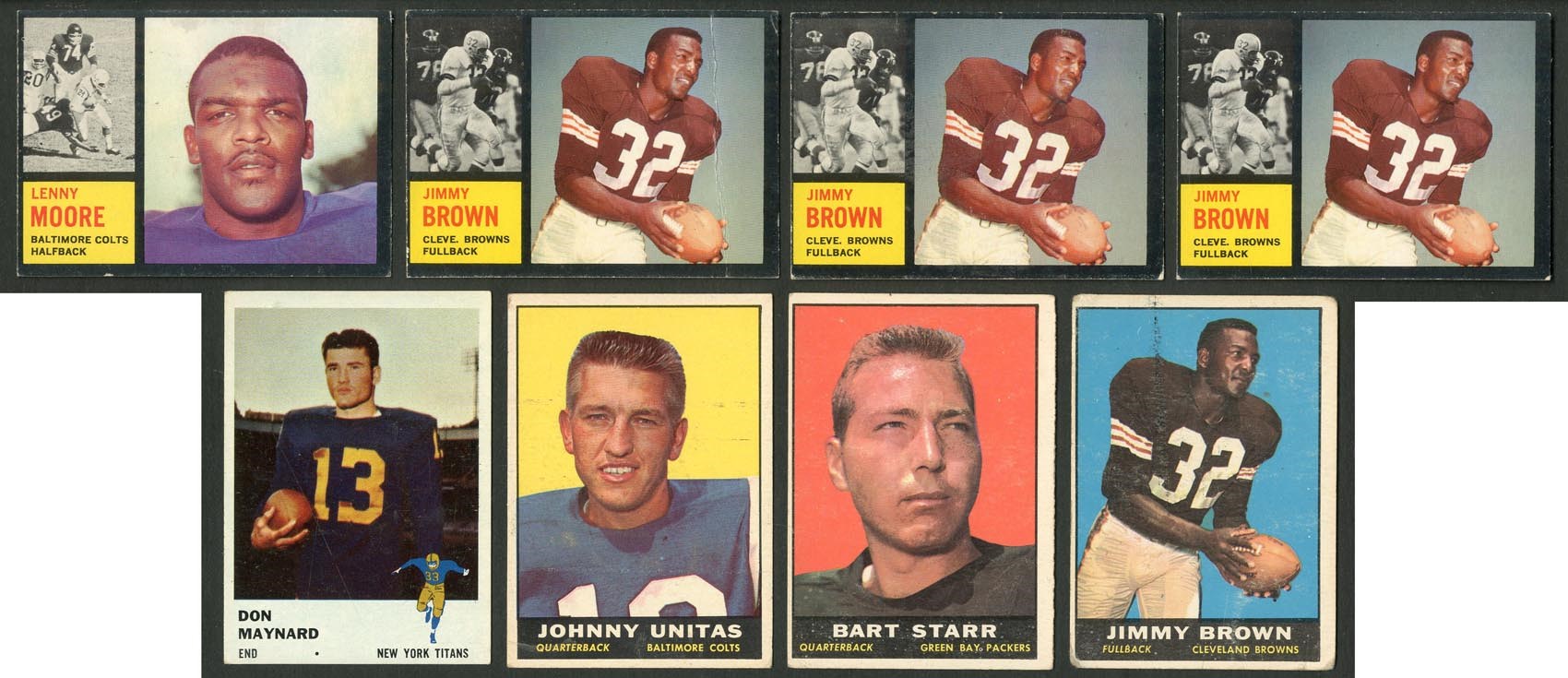 Nice offering of early 1960's Topps football cards with major stars. 1961 Topps (117/198, 153 total including duplicates): Unitas, Brown, Starr, Brodie, Title (2), Moore (3), Packers, Cowboys (3). 1962 Topps (86/176, 103 total including duplicates): Brown (3), Moore, Berry, Redskins (2), Cardinals, Title, Gifford, Cowboys, Taylor, Groza. 1961 Fleer (14): Blanda, Kramer, Moore, Donovan, Berry, Kemp, Maynard. All of the 1962 Jim Browns are VG or VG-EX. Overall EX with some stars being nicer.