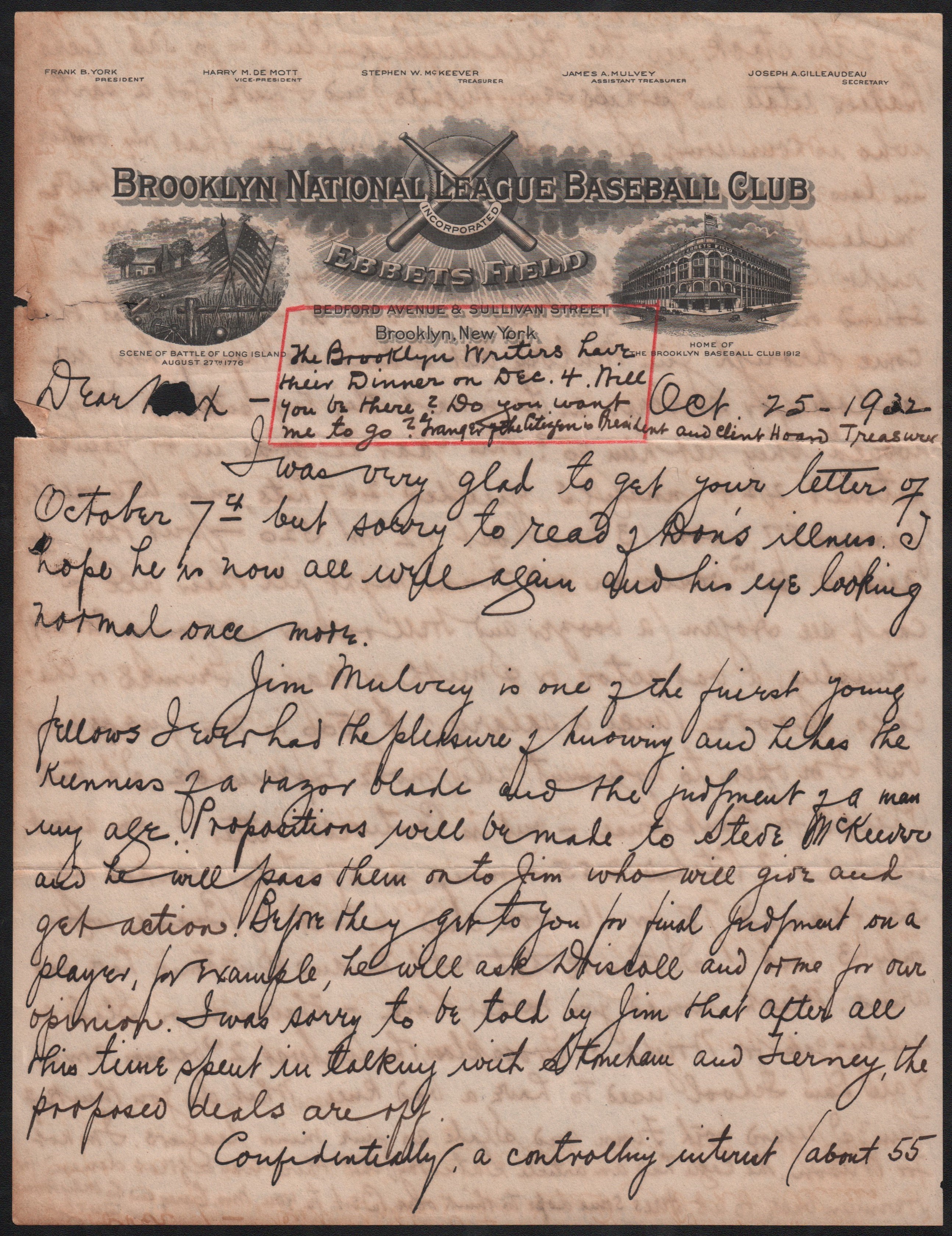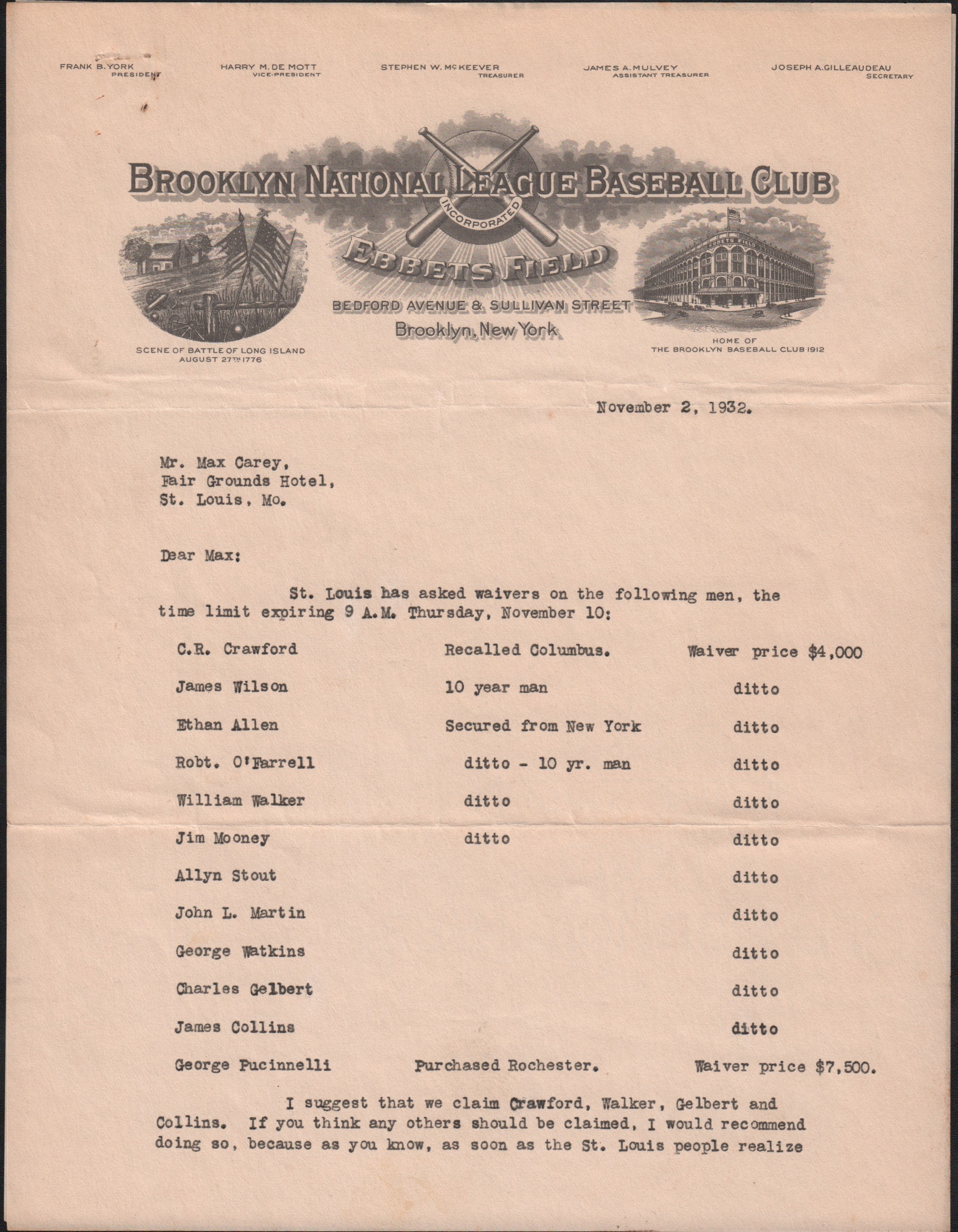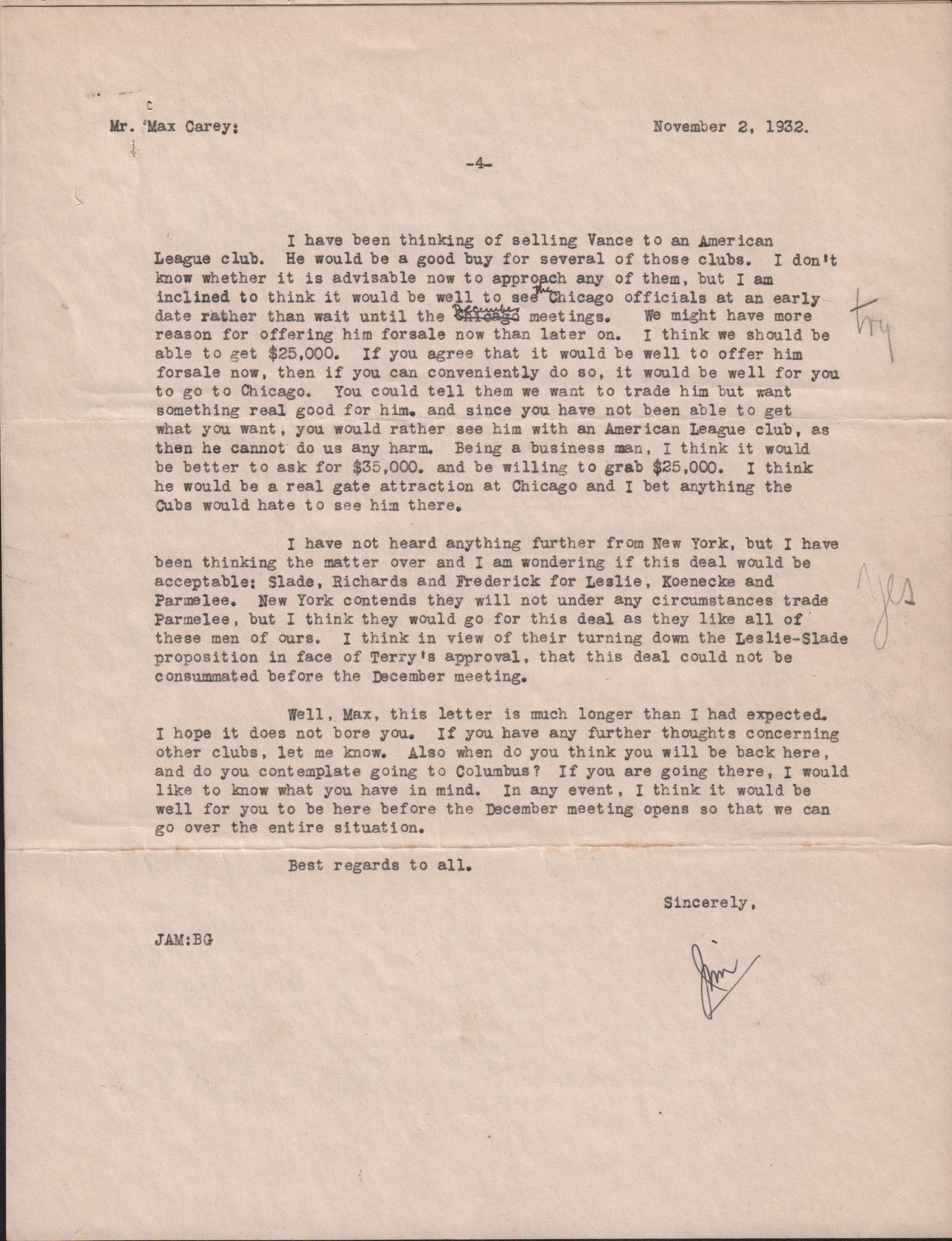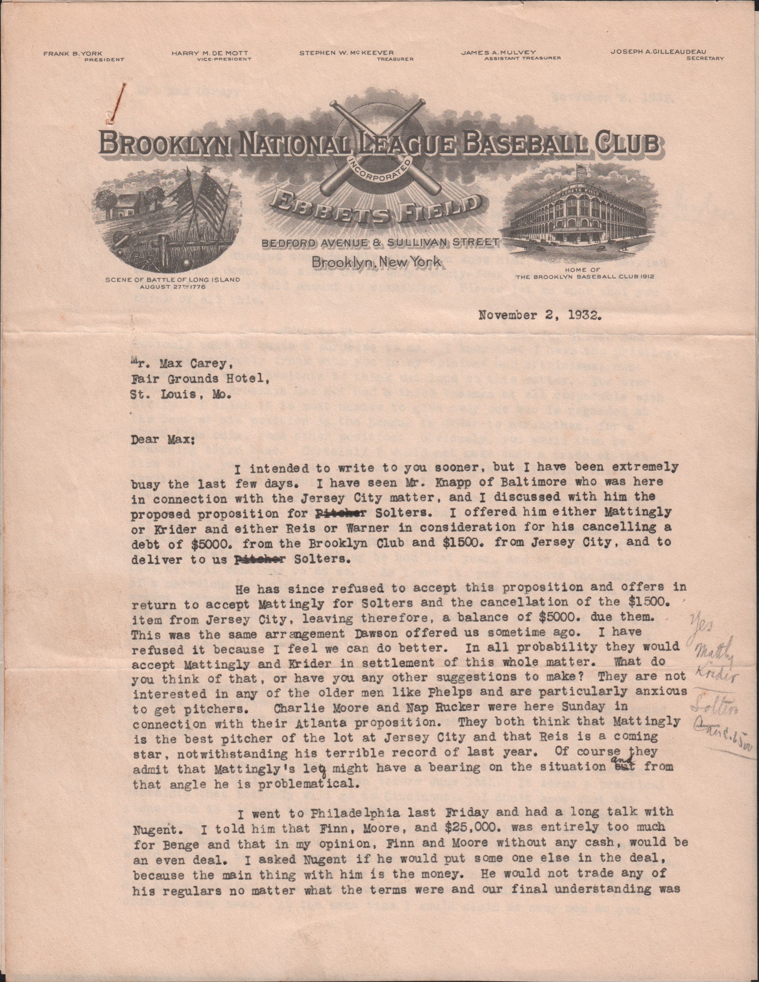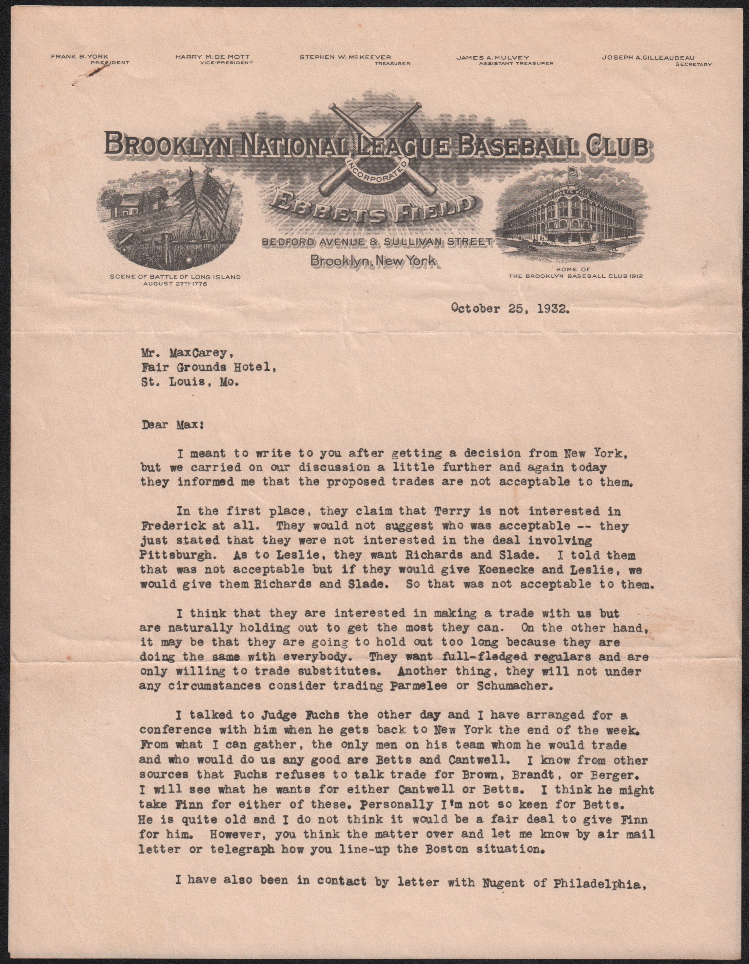 Four letters originally obtained by Barry Halper from Max Carey Jr. 1) Extensive two-page Dutch Carter letter praising Jim Mulvey and talking about prospects for the new season. Hilarious content includes mention of Shanty Hogan, "I can't see Hogan (a boozer and hellraiser and coming FAT BOY)". Carter also mentions his inside knowledge that a controlling interest (55%) of the Philadelphia club may be up for sale. 2-4) Three typed letters from Jim Mulvey including: 2-pager regarding waiver prices; 2-pager regarding trade negotiations interestingly quoting some of the ideas that Dutch Carter mentions in his handwritten letter to Carey a few days earlier (included in this lot) and; a four-page letter regarding possible trades including that of Dazzy Vance.