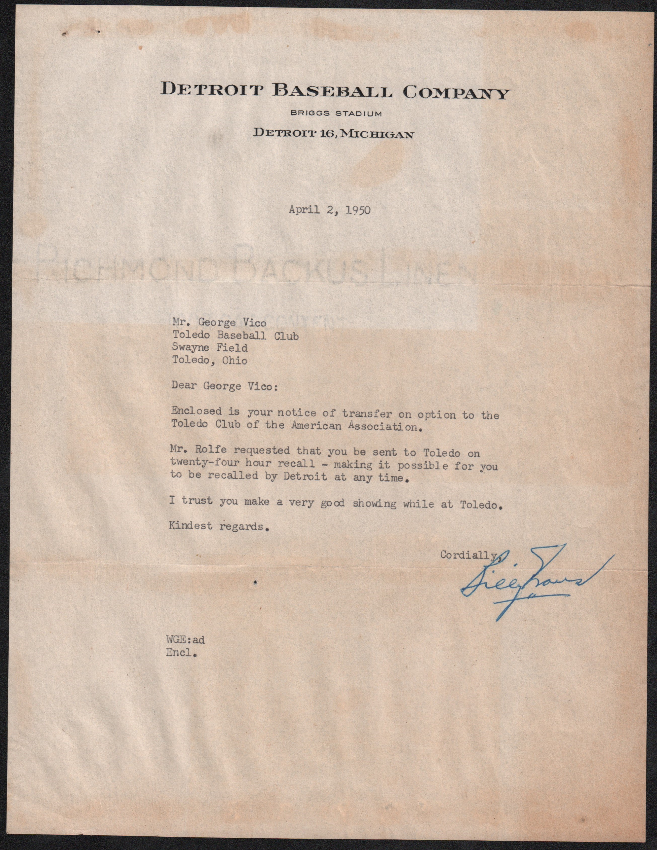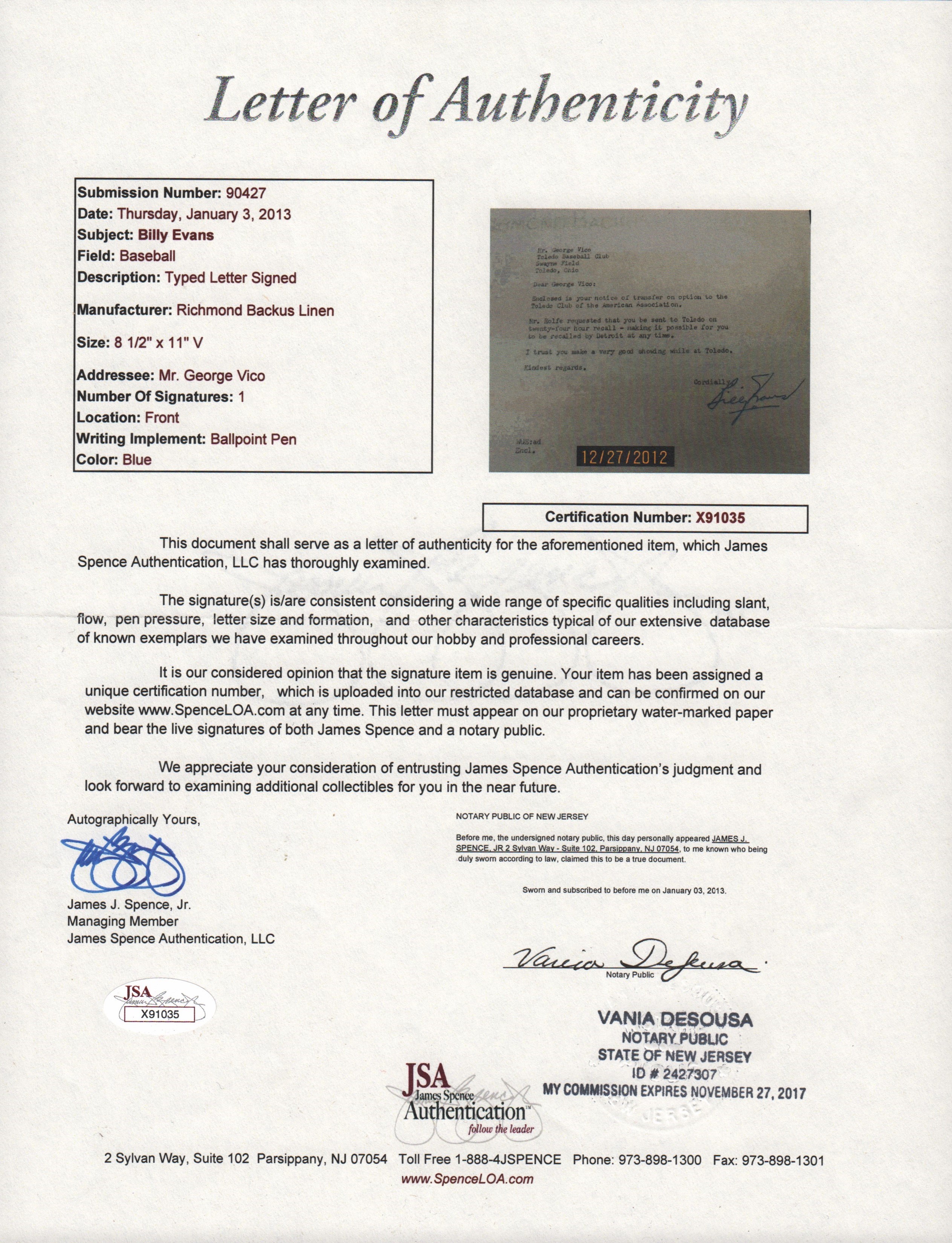 Hand signed letter from Billy Evens to George Vico dated April 2, 1950 on Detroit Baseball Company letterhead.  Letter discusses Vico being transferred to the Toledo Club and being on "twenty-four hour recall".  Interesting baseball content and comes with JSA Letter of Authenticity.
