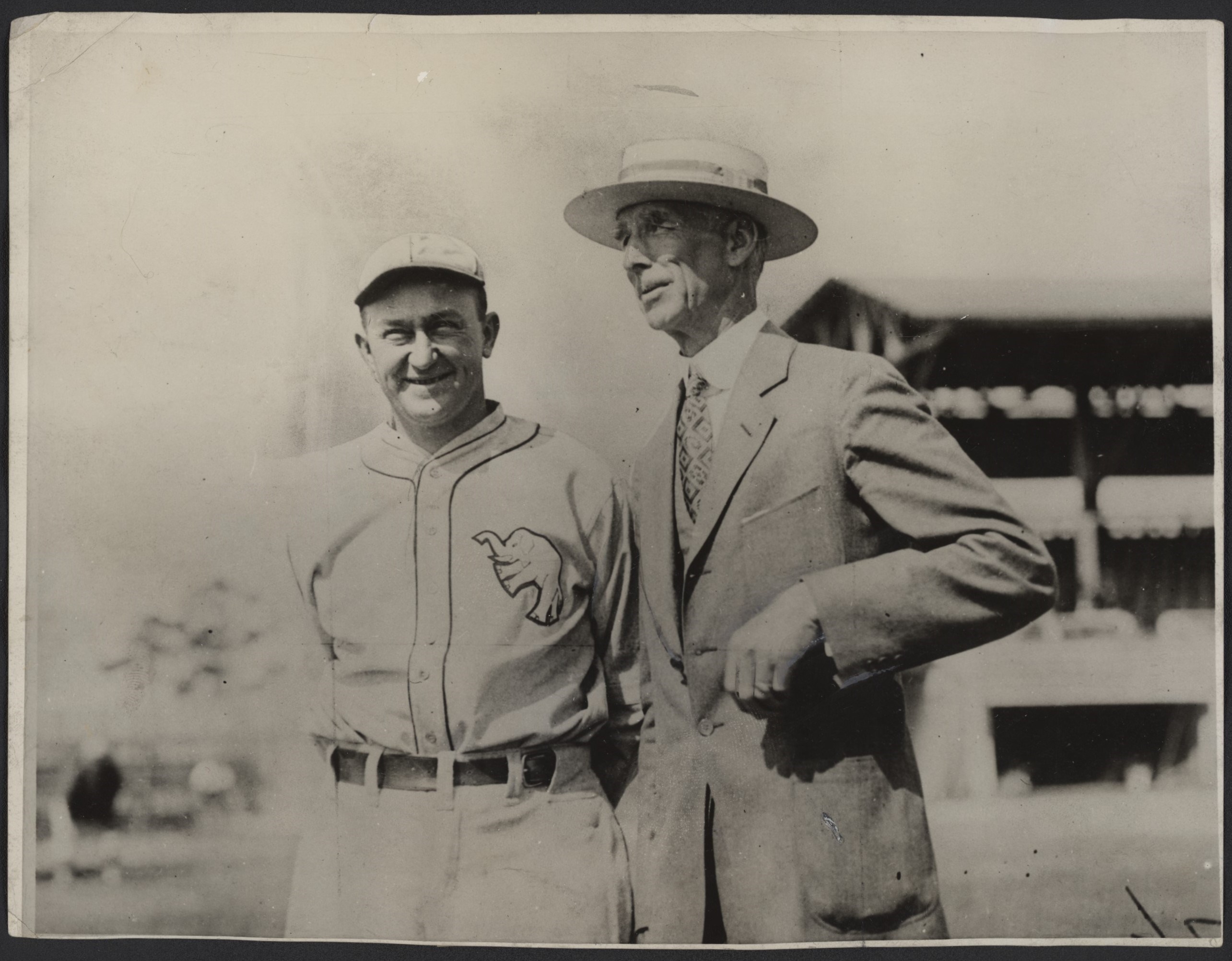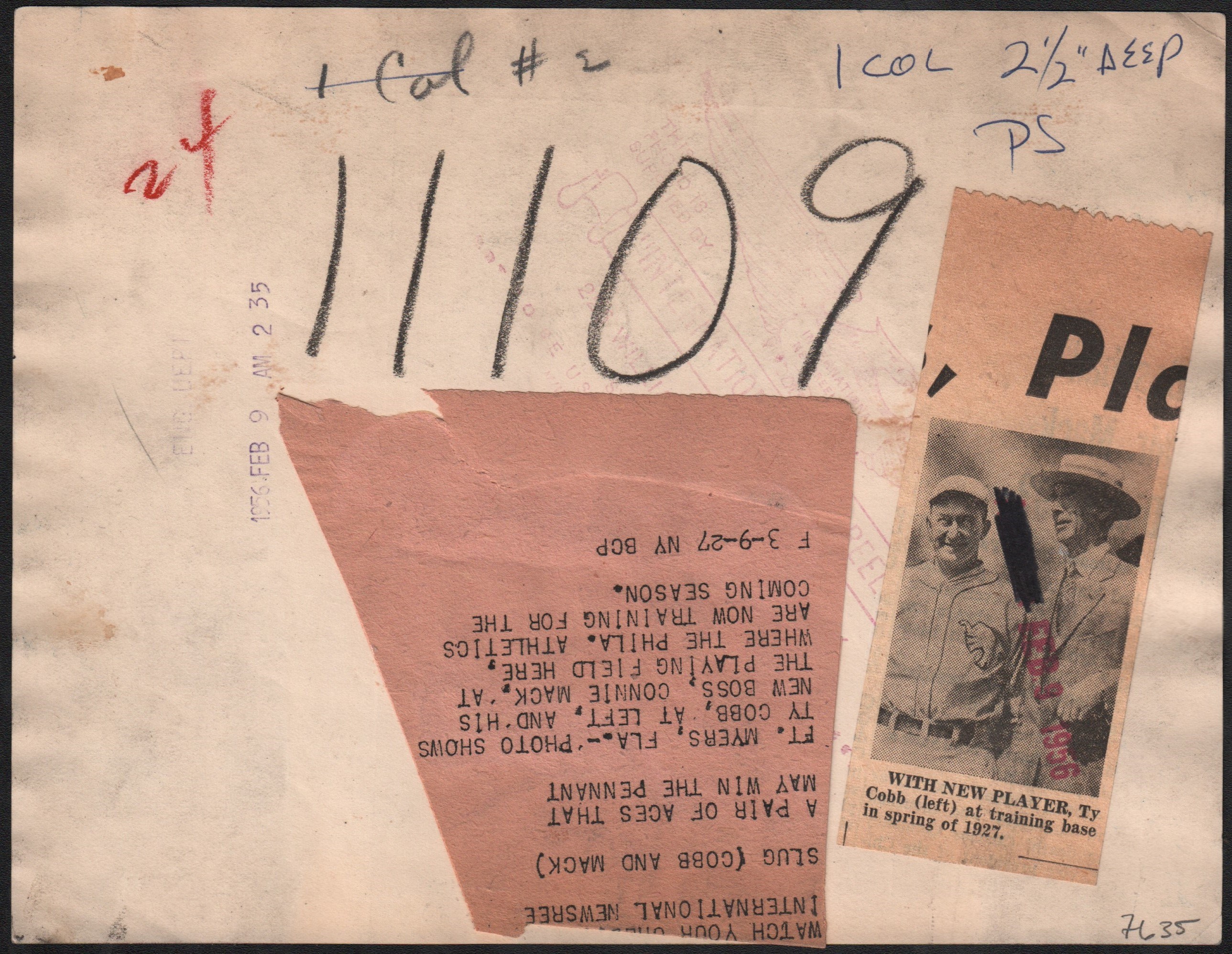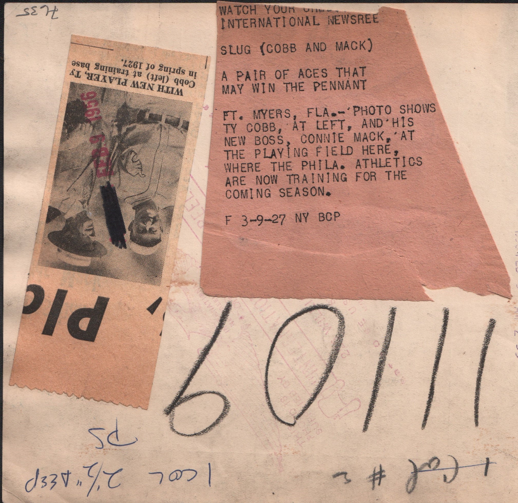 Wonderful photograph of Ty Cobb with his new boss Connie Mack discussing the upcoming season while at spring training on March 9, 1927.  6.5" x 8.5". First A's photo ever! Published in PIC magazine with actual article.
