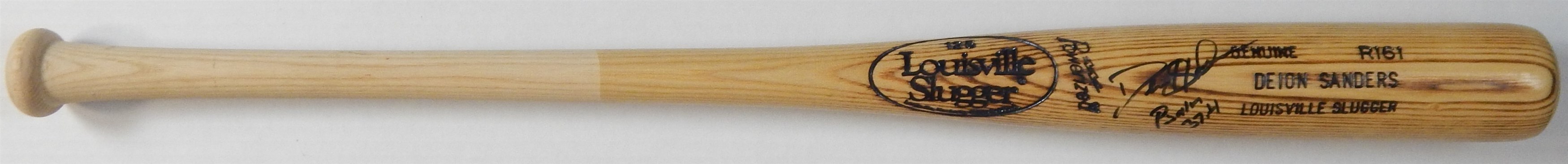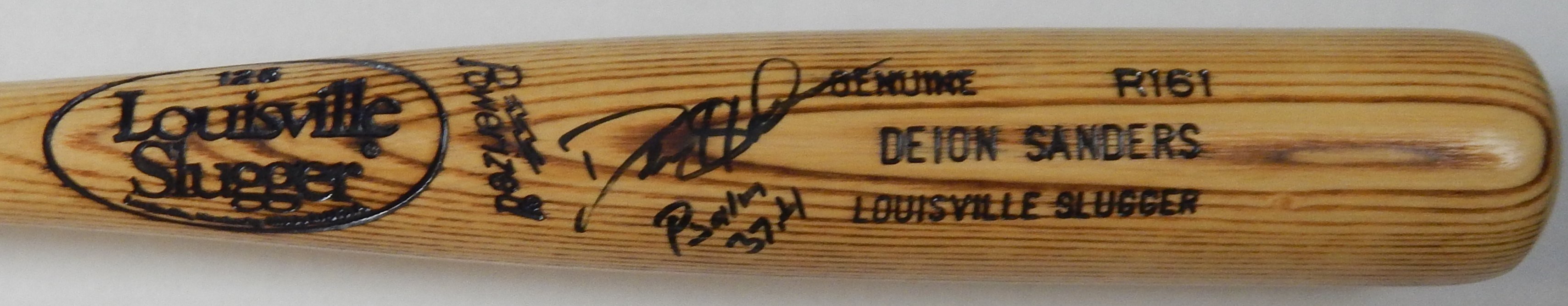 Deion Sanders game issued and signed Louisville Slugger bat. Sanders signed this bat in classic Primetime style with the "S" of Sanders being a $ (dollar sign). Beneath his signature, Sanders inscribes "Psalm 37:4". From the Bernie Stowe collection, this bat comes with a Lelands LOA.