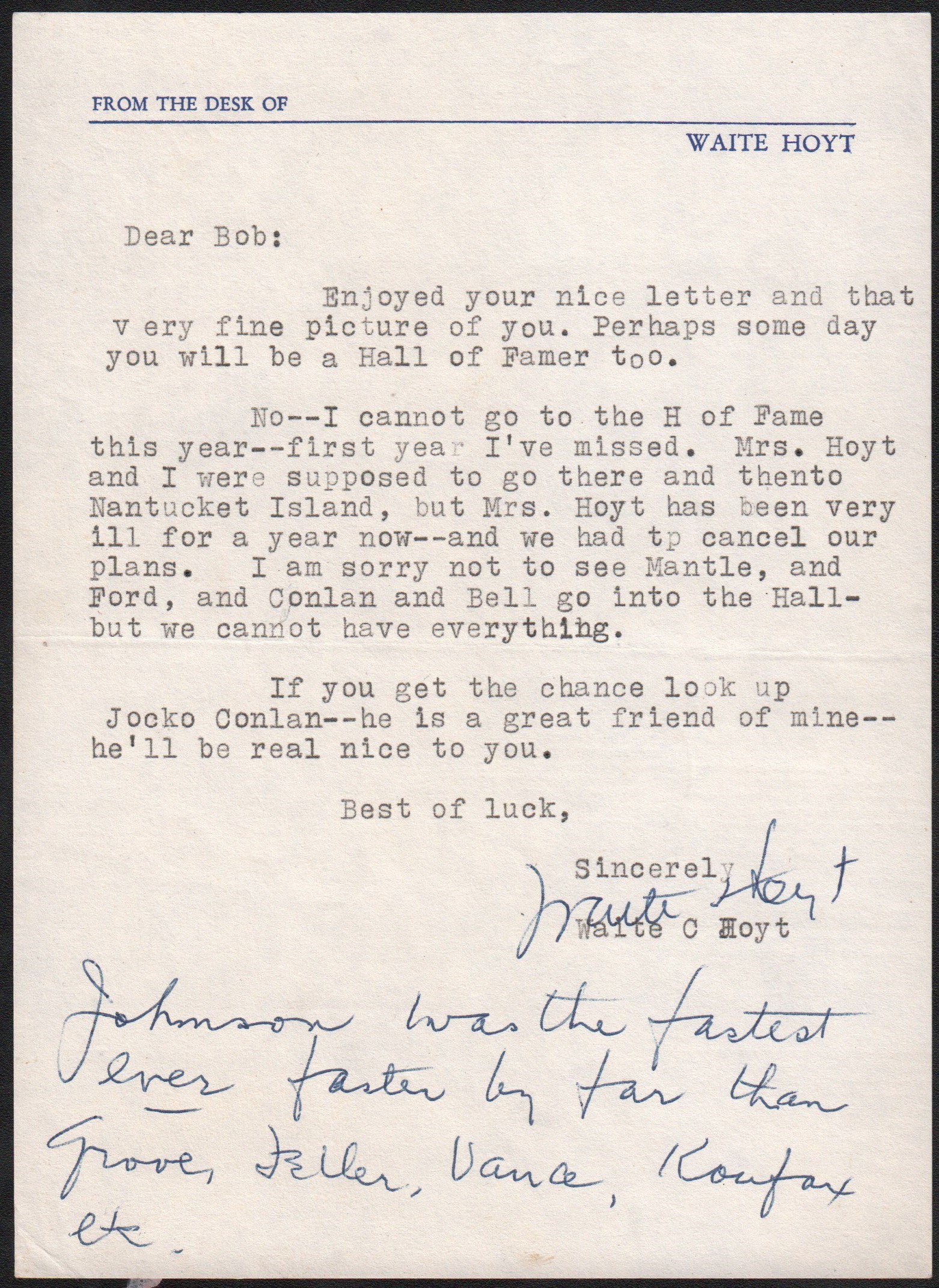 Here is a very interesting typed letter with Waite Hoyt handwriting and signature. The hand written portion mentions that Walter Johnson was the fastest pitcher ever, and "faster by far" than Grove, Feller, Vance, Koufax etc. 7" x 5" on Waite Hoyt letterhead.