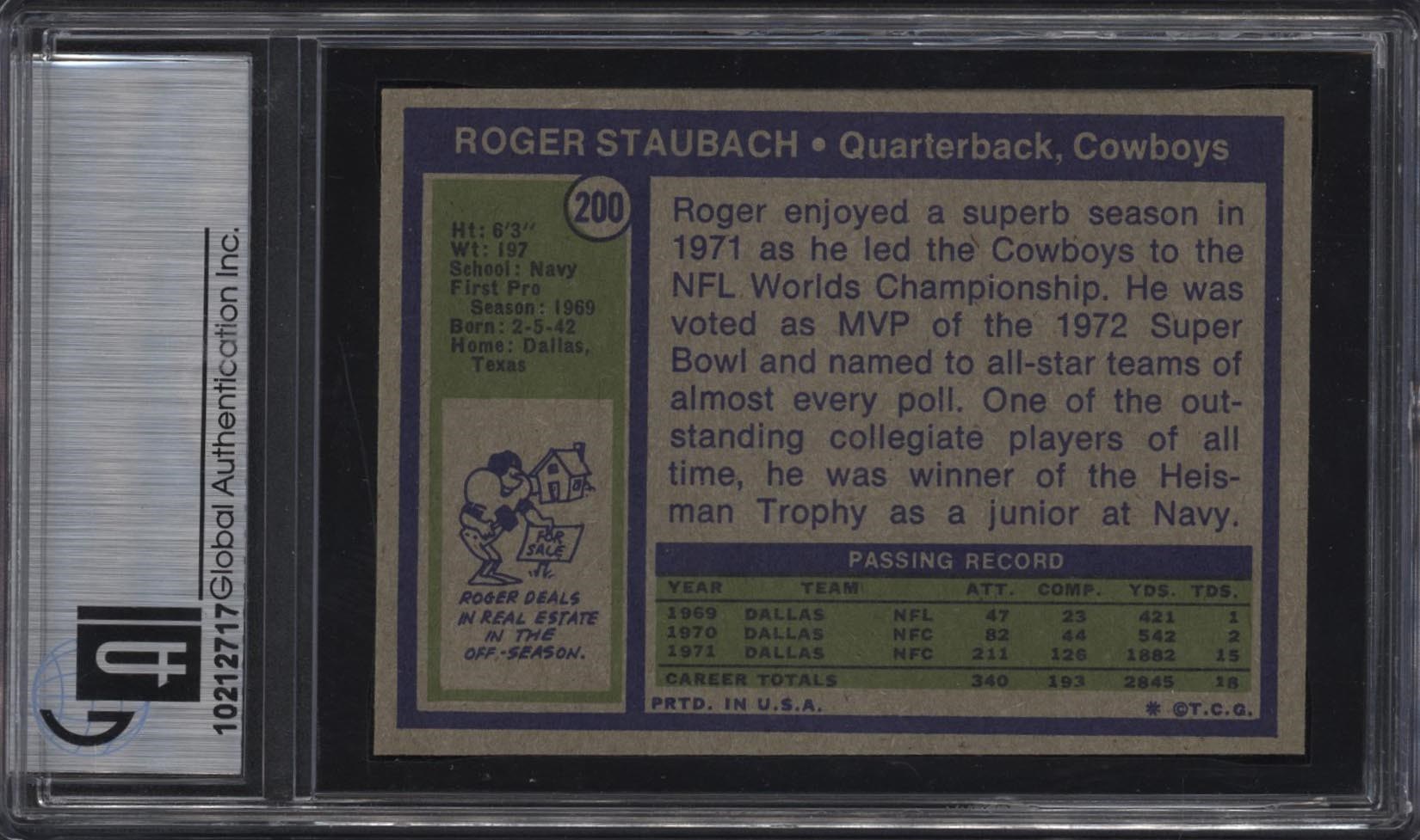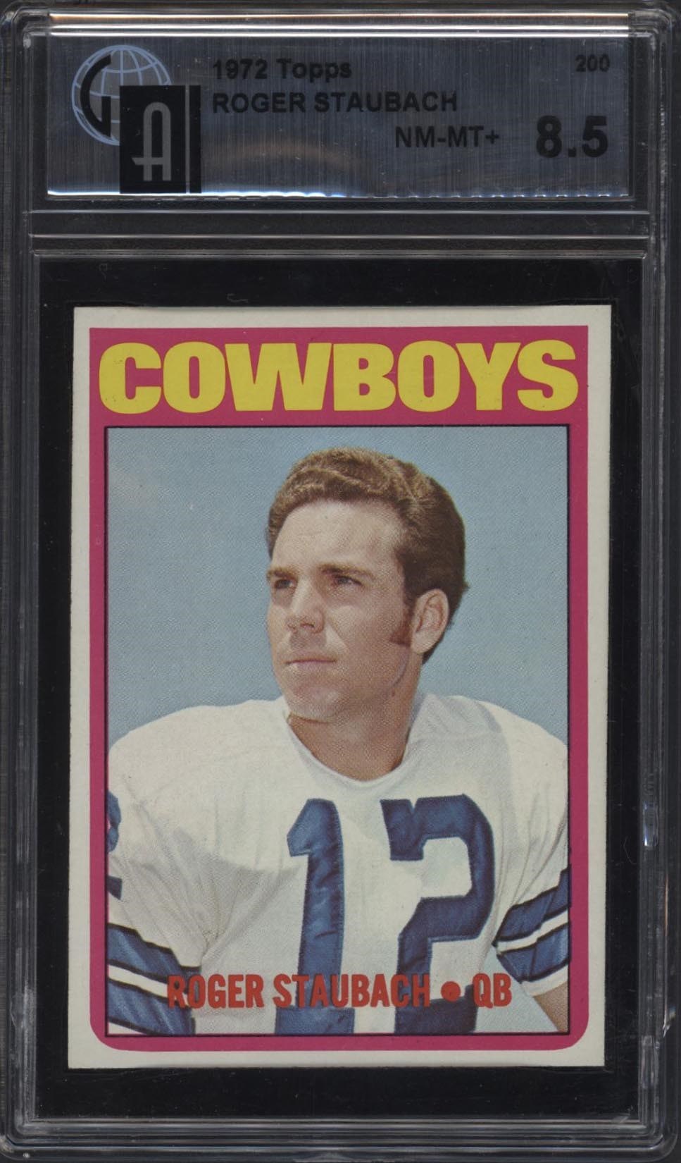 Graded by GAI NM-MT+ 8.5. The rookie card of Roger Staubach is notorious for being off center, most often severely off side to side, or shifted badly to the top. This example is centered, but offers a light tilt and contains bold colors and a crisp focus. Despite its residency in a GAI holder, this HOFer rookie card is legit with four original edges and sharp corners. Similarly centered on the reverse, with a very bold print strike. High level rookie card of this all time great.