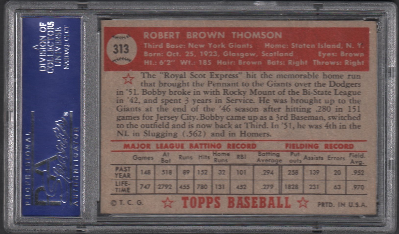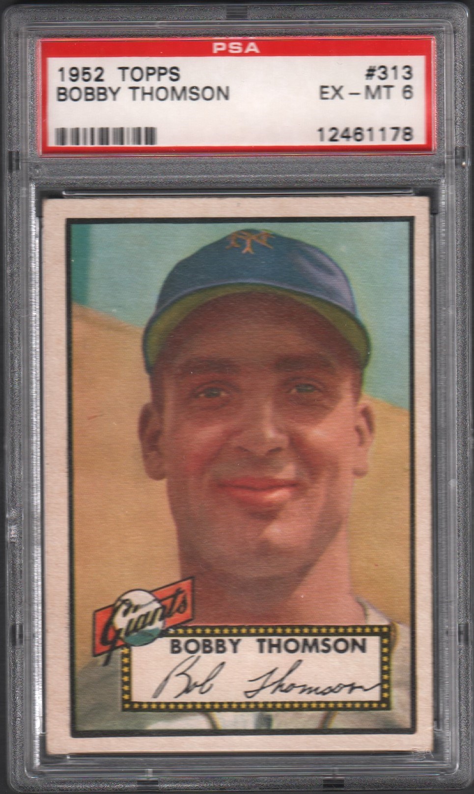 Graded by PSA EX-MT 6. Well centered, bright colors, clean surfaces. Popular 1952 Topps high number card, issued a year after Thomson's famous pennant winning home run.
