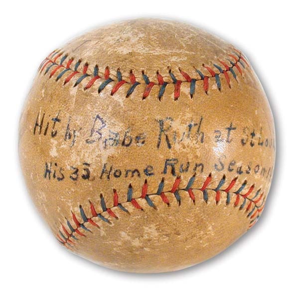 Ruthian sphere was clubbed for number thirty-three of the 1921 season (and career number 136) by the Sultan himself. This OAL ball with trademark red and blue stitching is inscribed by the fan who caught it, "Hit by Babe Ruth at St. Louis. His 33rd Home Run of the Season." The ball shows tremendous game use and comes with an LOA attesting to its history. Also included is sports page from The New York Times dated Wednesday July 13, 1921 noting that "Ruth's Two Homers Smother St. Louis."