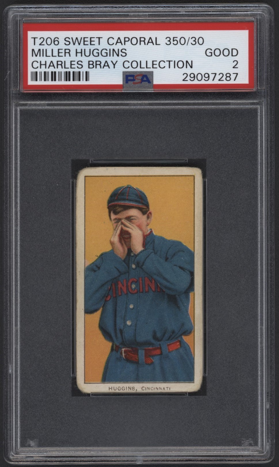 From the Charles Bray Collection.  Hall of Fame member Miller Huggins T206 Sweet Caporal PSA graded by PSA Good 2.