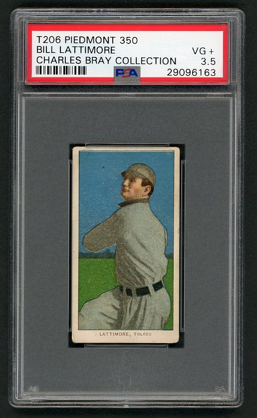 From the Charles Bray Collection. T206 Piedmont Bill Lattimore of Toledo. Graded by PSA VG+ 3.5