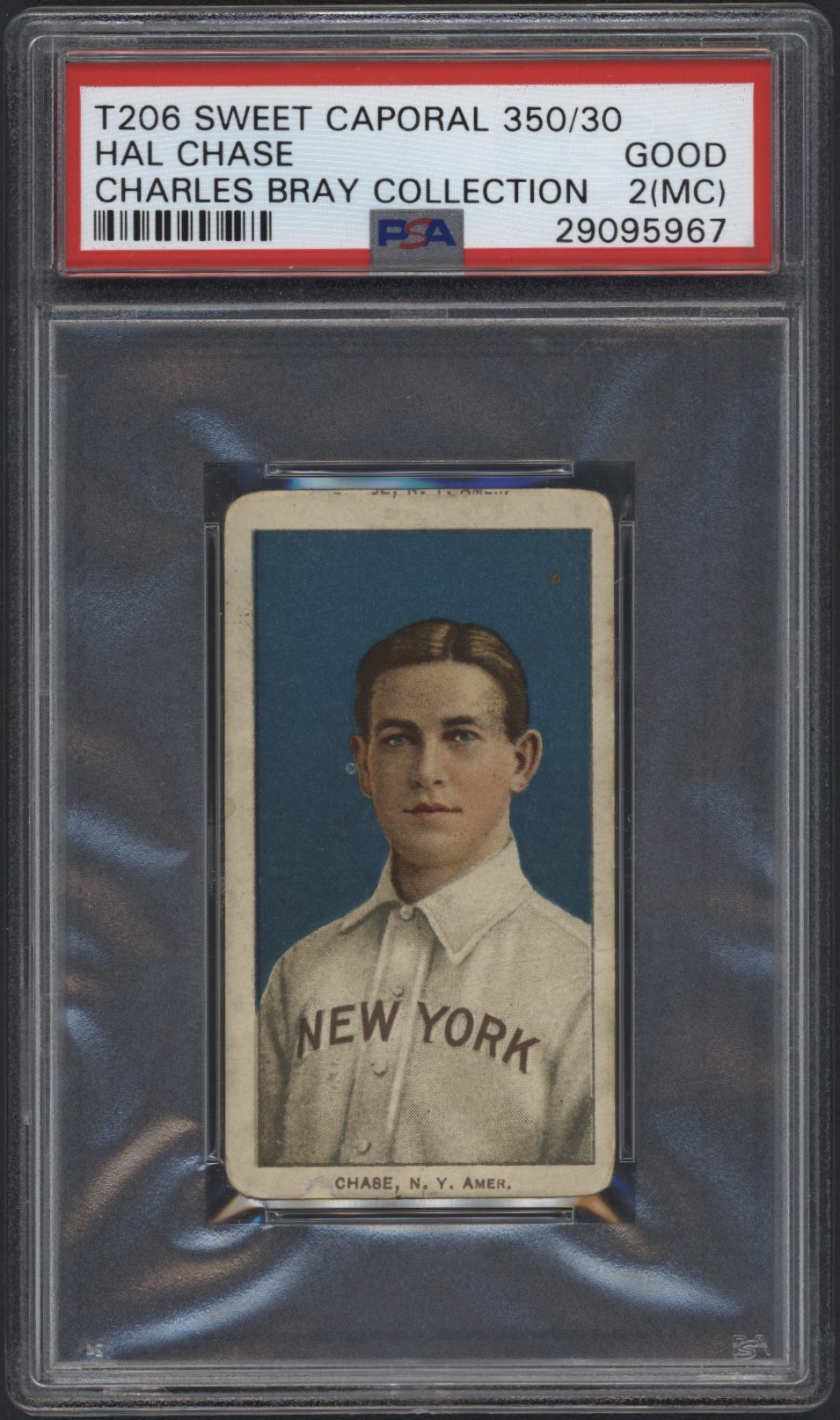 From the Charles Bray collection.  T206 Sweet Caporal 350/30 Hal Chase.  Graded by PSA Good 2 (MC).
