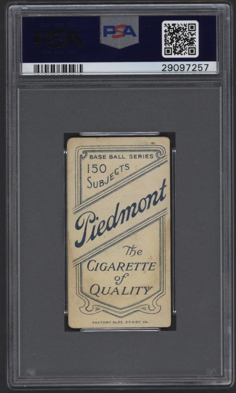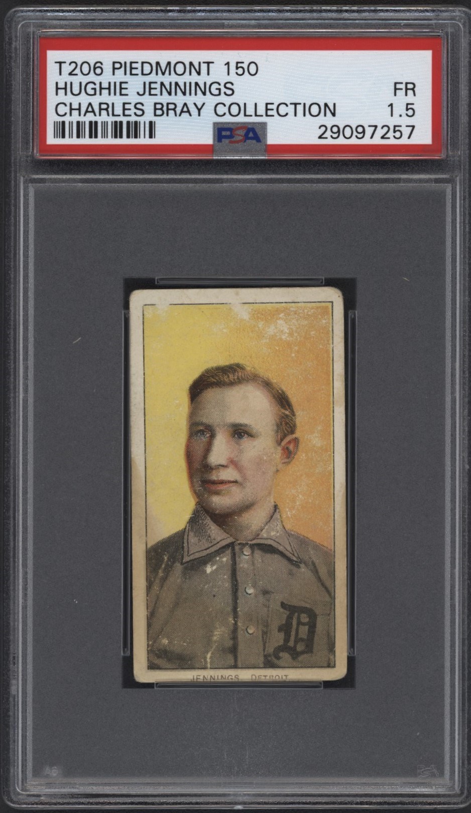 From the Charles Bray collection. T206 Piedmont 150 Hughie Jennings HOF. Graded by PSA FR 1.5
