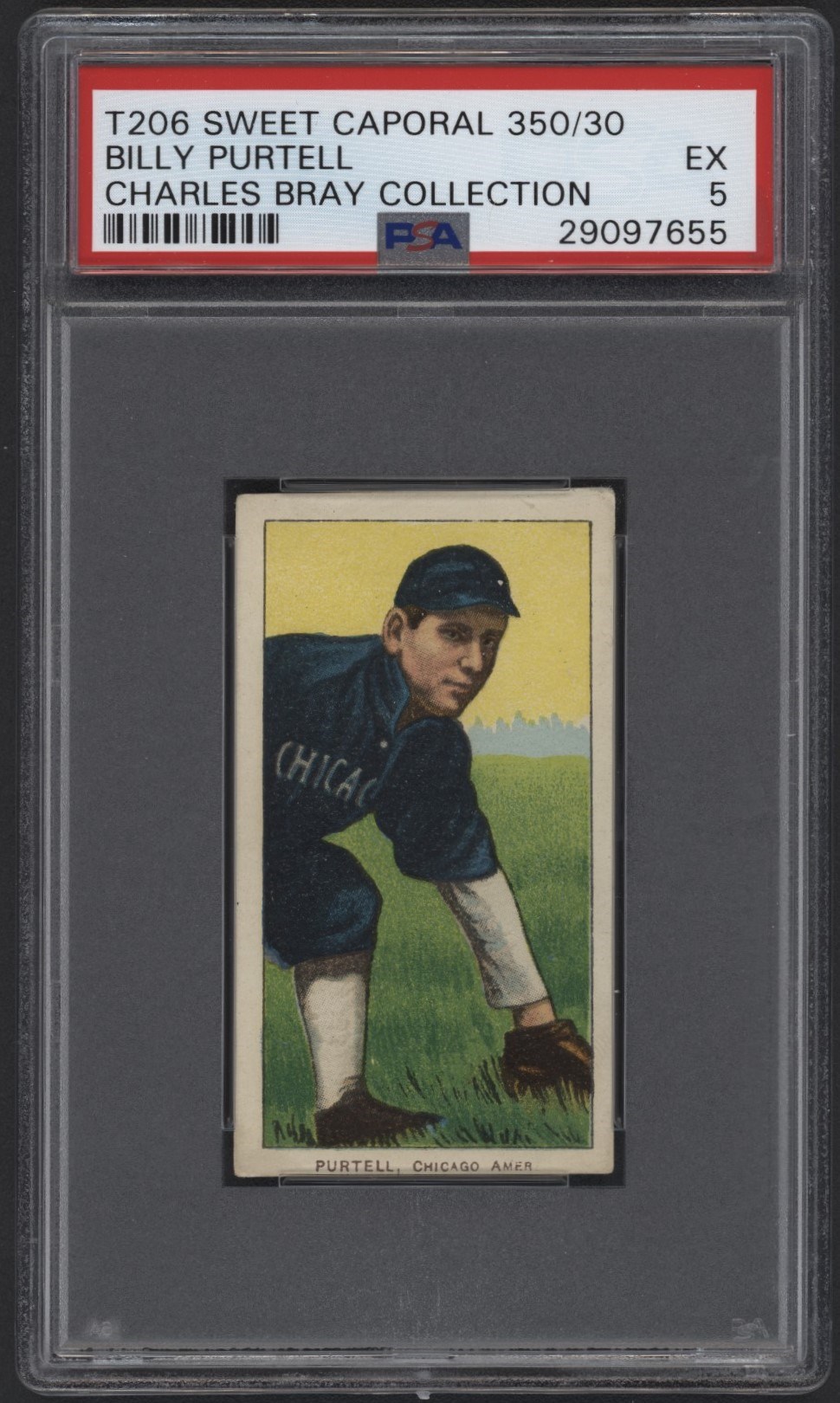 From the Charles Bray collection.  T206 Sweet Caporal 350/30 Billy Purtell.  Graded by PSA Ex 5.  Very nice.
