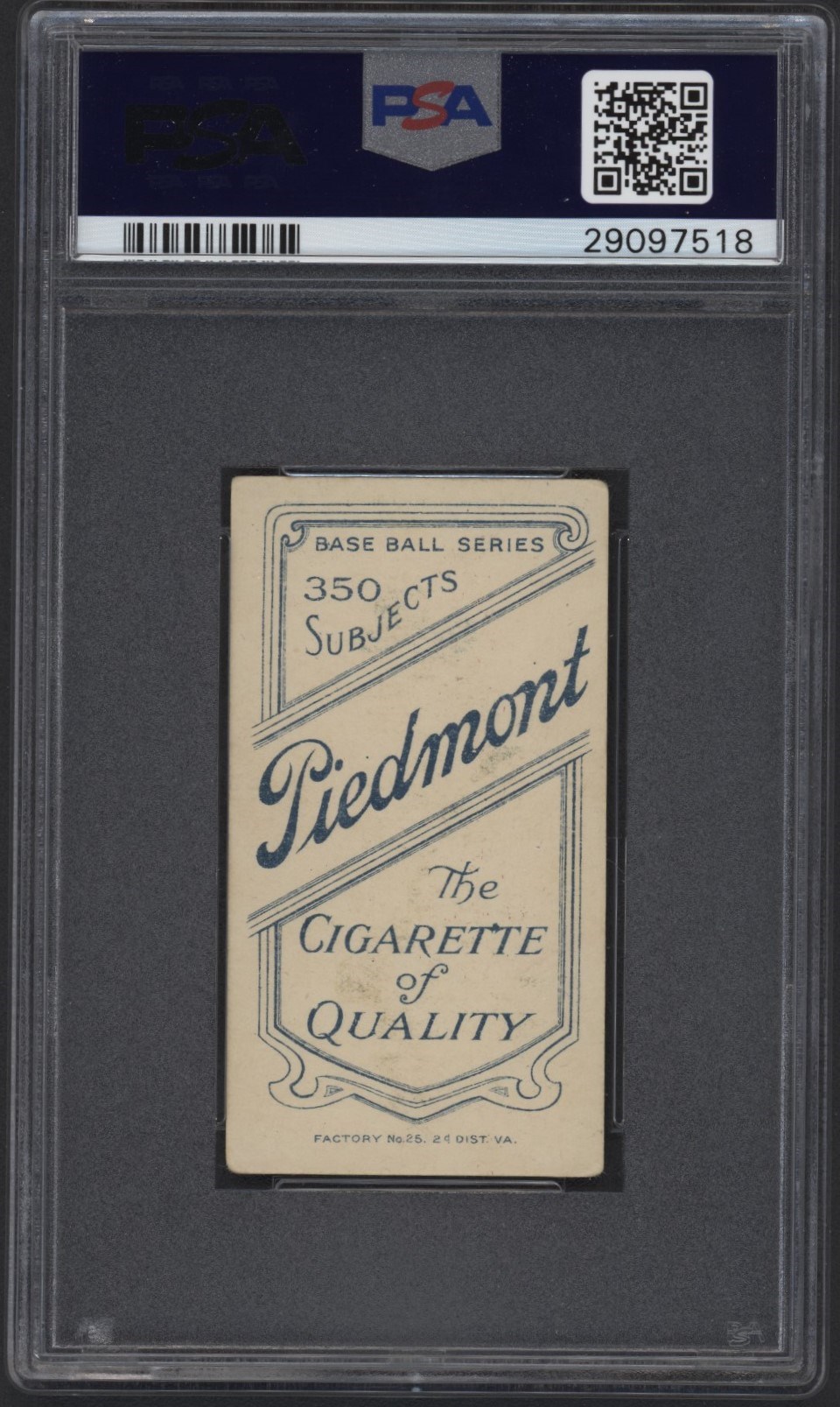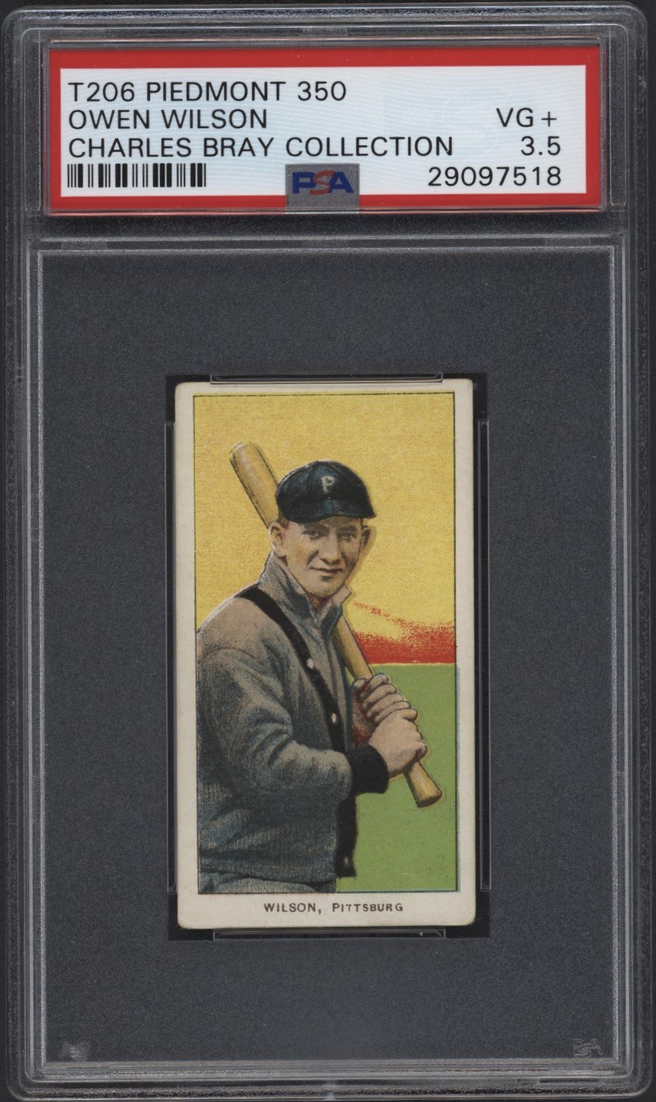 From the Charles Bray collection. T206 Piedmont 350 Owen Wilson. Graded by PSA VG+ 3.5.