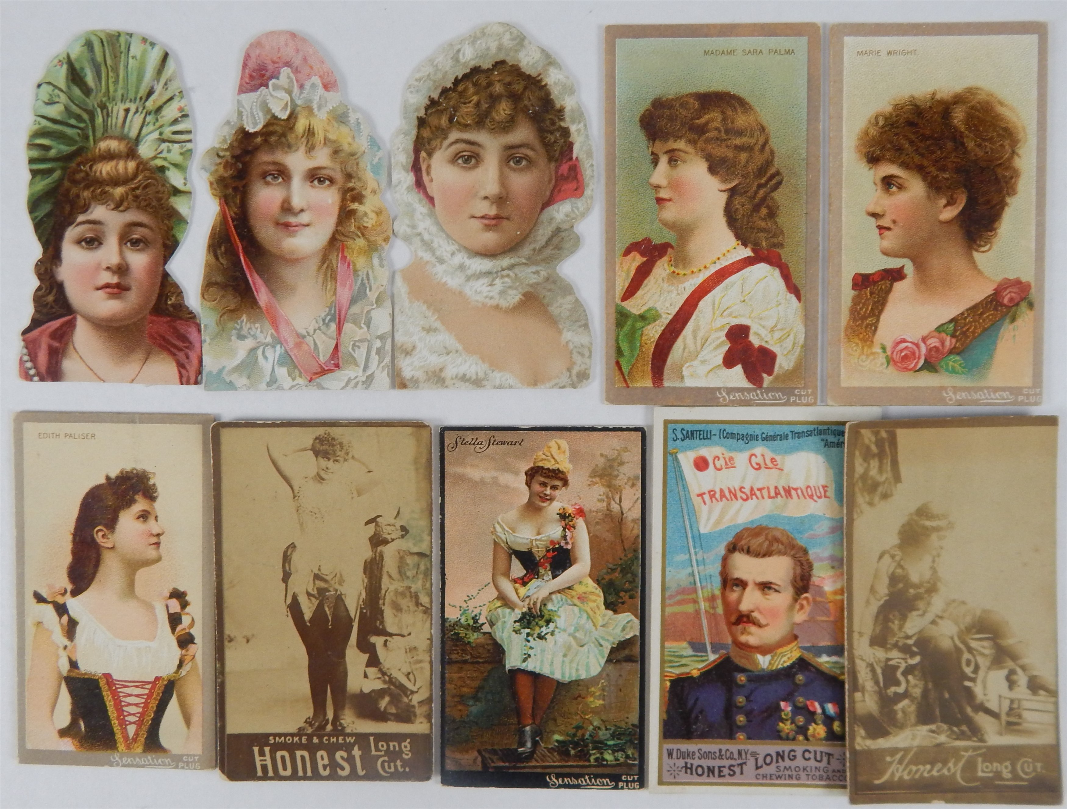 Beautiful group with some high grade cards. Nicest is Honest Long Cut Transatlantique, plus sensation actresses (4). 1892 N132 star of the stage scraps (3- Nice!), and two Honest actresses real photo CDV type cards (2). Total of 10.