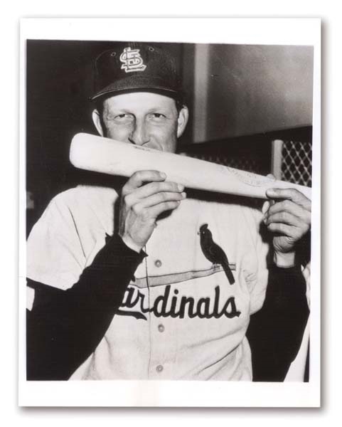 Attached caption reads, in part, “Stan ‘The Man’ Musial kisses the bat with which he recorded his 3,000th Major League hit with today against the Cubs in Chicago…” Important photograph is EX-MT.