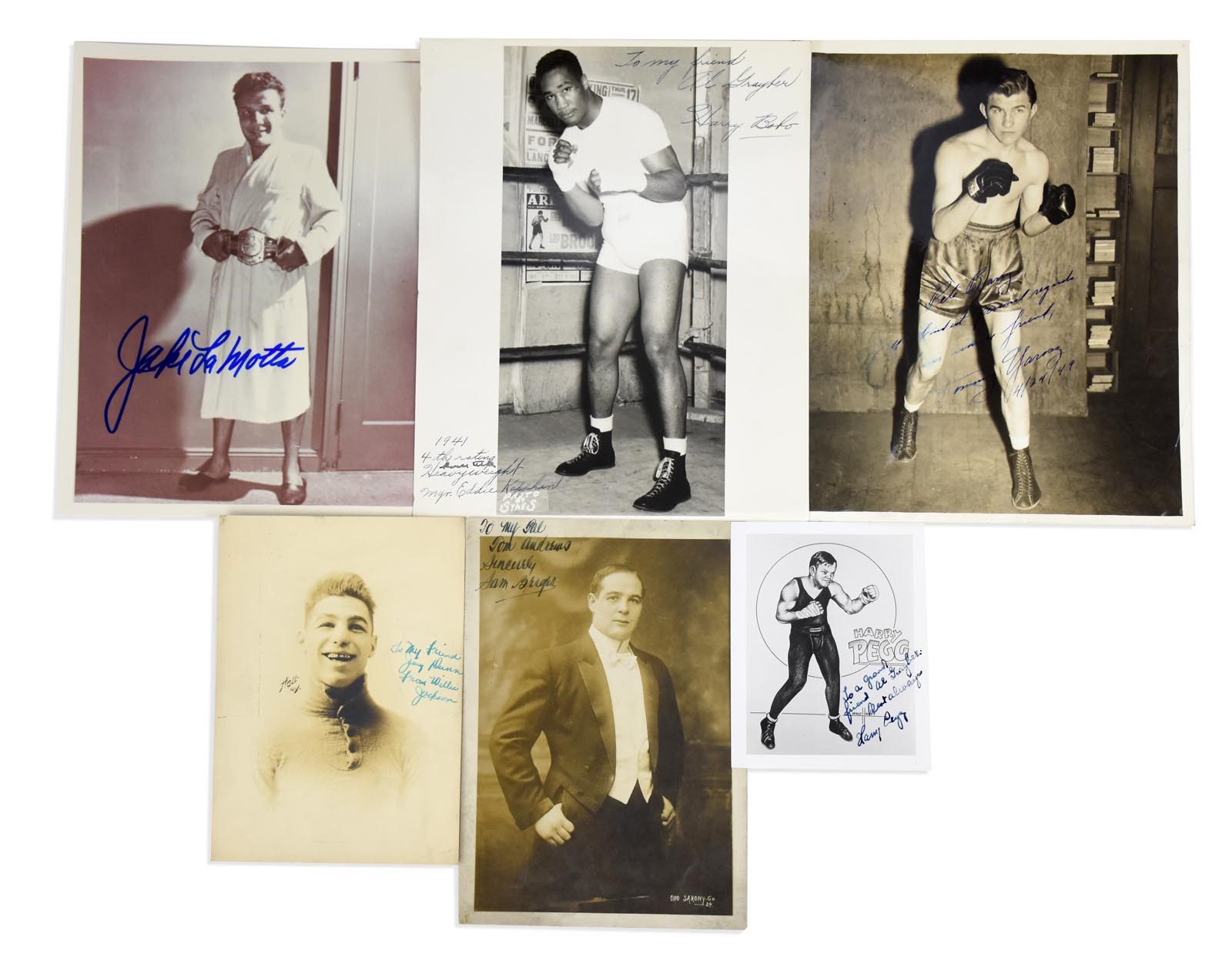 1) Jake La Motta signed 8x10". 2)Harry Pegg signed copy of a drawing 5x4". 3) Willie Jackson signed 7x5". 4) Sam Berger (won the first Olympic Gold Medal in heavywieght boxing in 1904) signed 8x6". 5) Harry Bobo signed 8x10", also signed by manager Eddie Kapphan. 6) Tommy Yarosz signed 8x10".