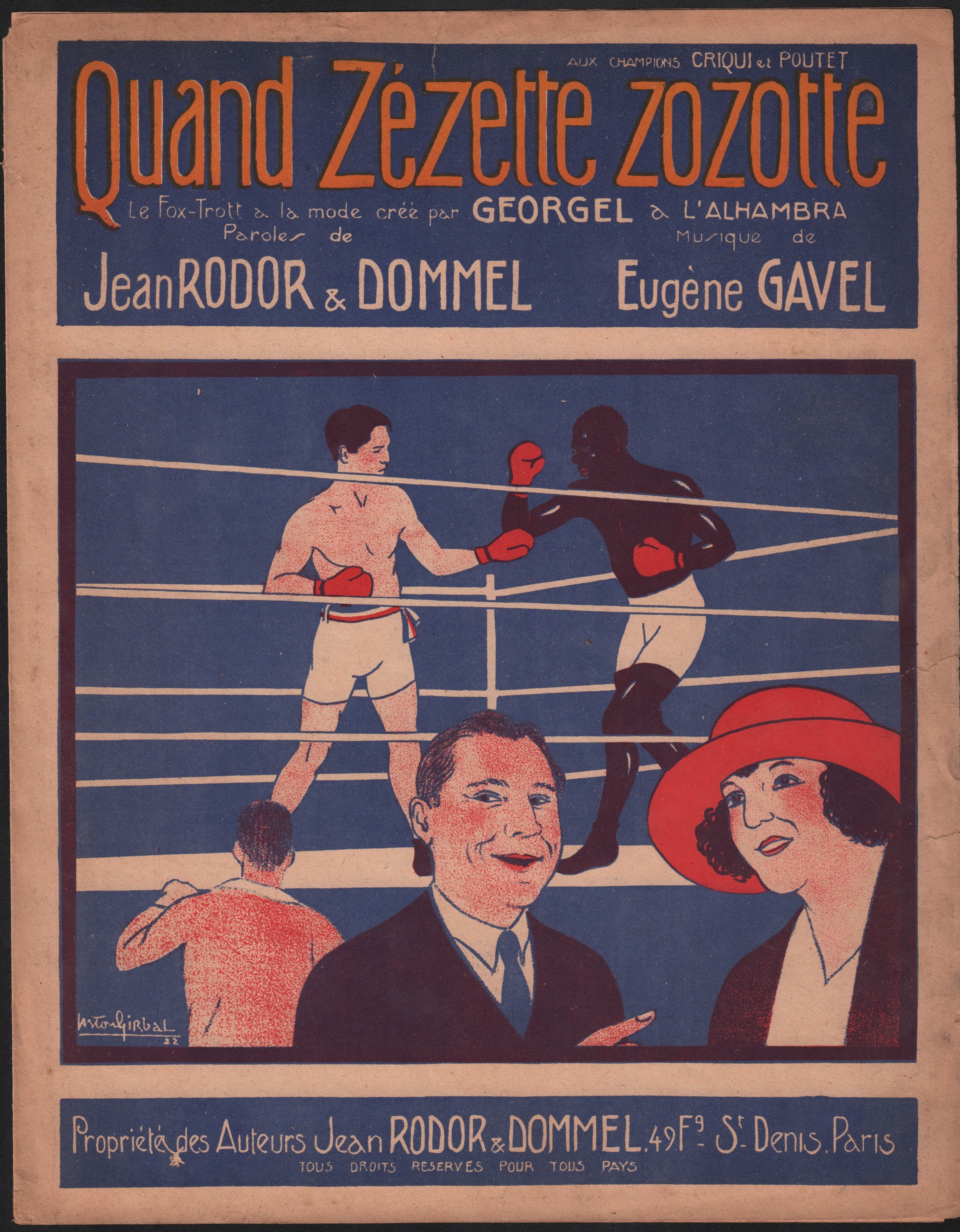 Incredible piece of sheet music with cover depicting a pair of pugilists in battle.  More than likely the depiction is of Johnson vs Jeffries from the 1909 battle.  The significance of the piece is that that shortly after the epic battle, Johnson was convicted and chose to flee to France. French.
