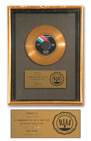 14x17.5". In 1975 Elton John was the recipient of this floater style R.I.A.A. gold record single for "Philadelphia Freedom". Excellent condition. *addendum* this gold record award is for "Philadelphia Freedom"