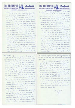 Four pages of Jackie's writing on two sheets of Brooklyn Dodgers spring training stationery. Terrific content throughout, mentioning, "…I am in the best possible shape and expect a really fine season…Pittsburgh tried to buy me, but Bavasi said no unless they gave me $50,000 and the club $150,000. I am sorry the man did not accept (smile)…" Also, "…I promised Rae to watch what I say and do and only the Campanella incident came close to making me blow up. I am glad I held myself but believe me it wasn't an easy thing to do…" And, "…I don't know if I will call it quits or not now because I believe there can be a nice next year…" If he was talking about 1955, he was right! Robinson closes, "Always just Jack." NRMT condition with mailing folds.