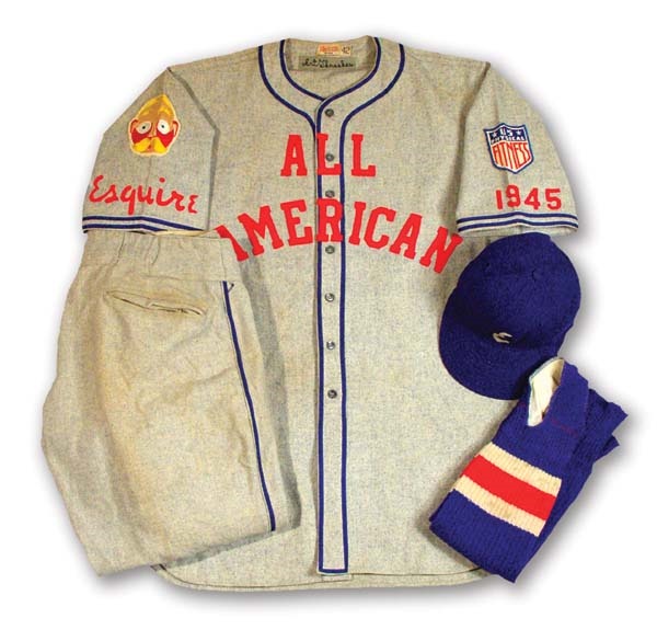 Gorgeous “Esky” man logo made famous with his association with Esquire Magazine. This uniform was worn by Art “Pinky” Thrasher during the 1945 All-American All-Star game sponsored by Esquire Magazine. Babe Ruth and Ty Cobb graced this very significant event as celebrity managers. Exhibits nice wear.