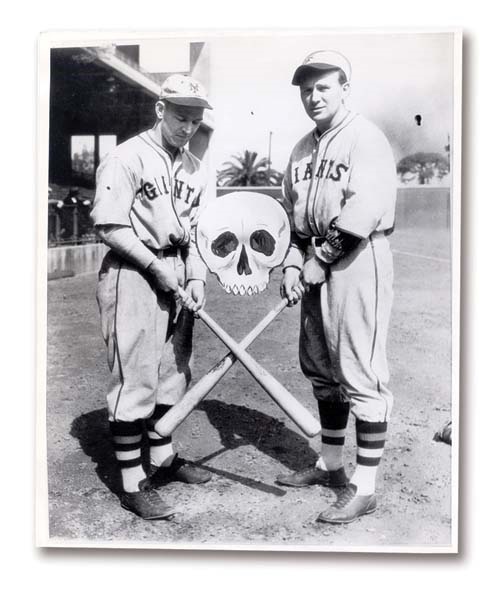One of the coolest wire photos we've seen. The photographer had the idea that these two Hall of Famers should provide crossbones for an artist's rendering of a skull. This will get compliments from everyone to whom you show it. EX-MT.