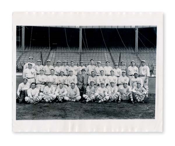 The National League Champs gave their former Polo Grounds roommates the best going-away gift of all this season, treating the Yanks to a World Series victory. Creasing is only particularly noticeable in the white border, meaning that you could frame this photo to look basically NRMT. "International Newsreel" stamping on verso.