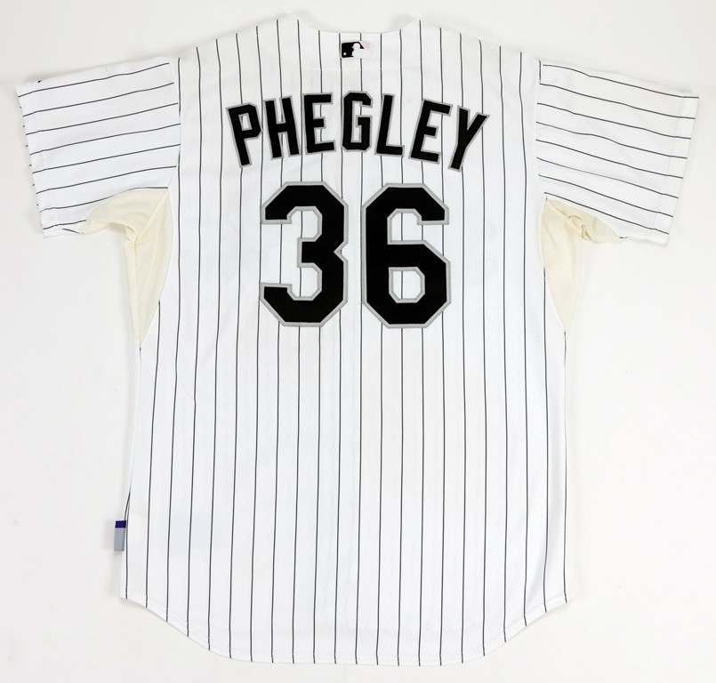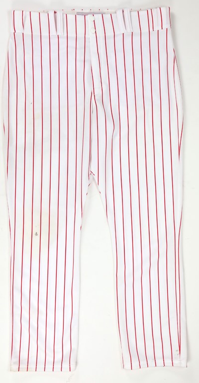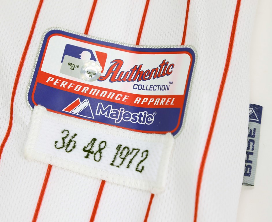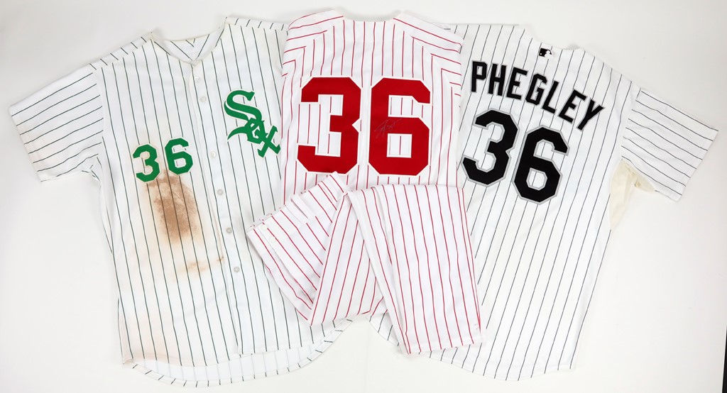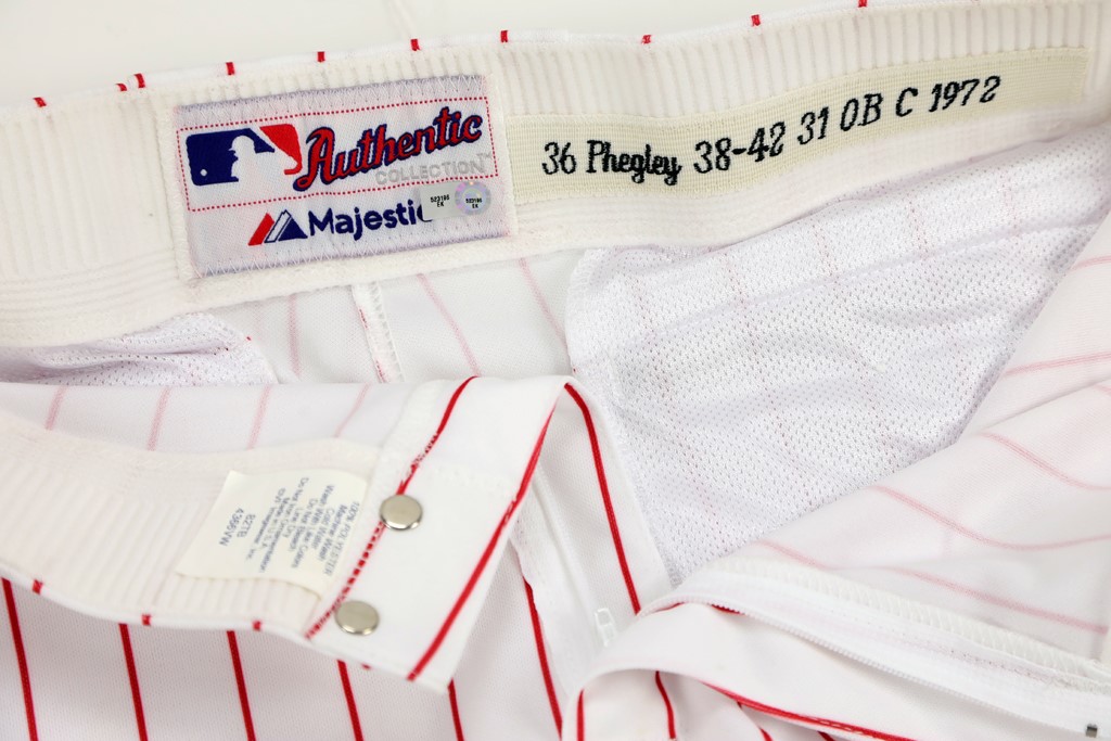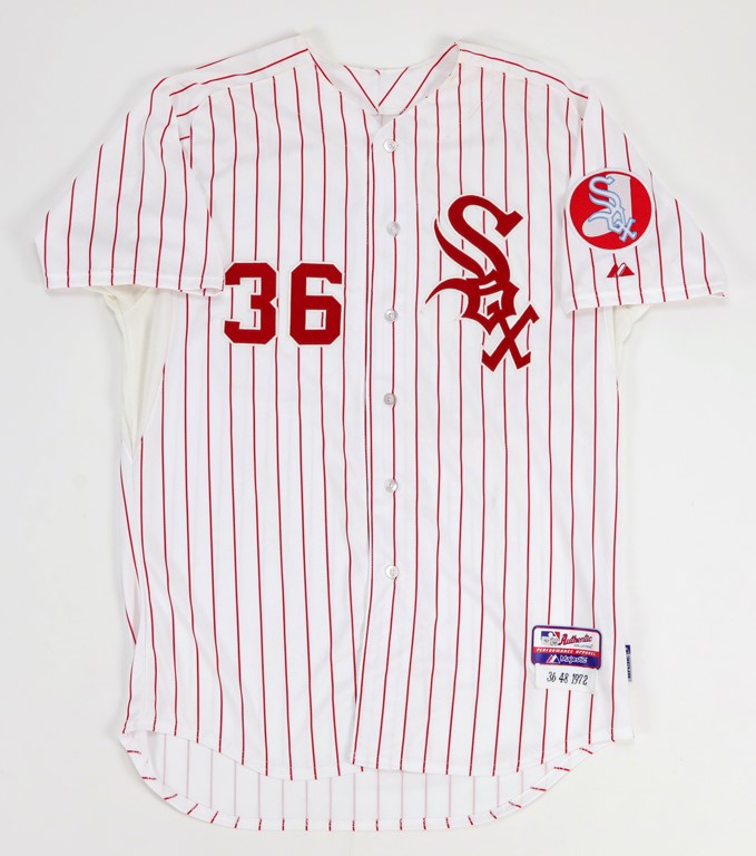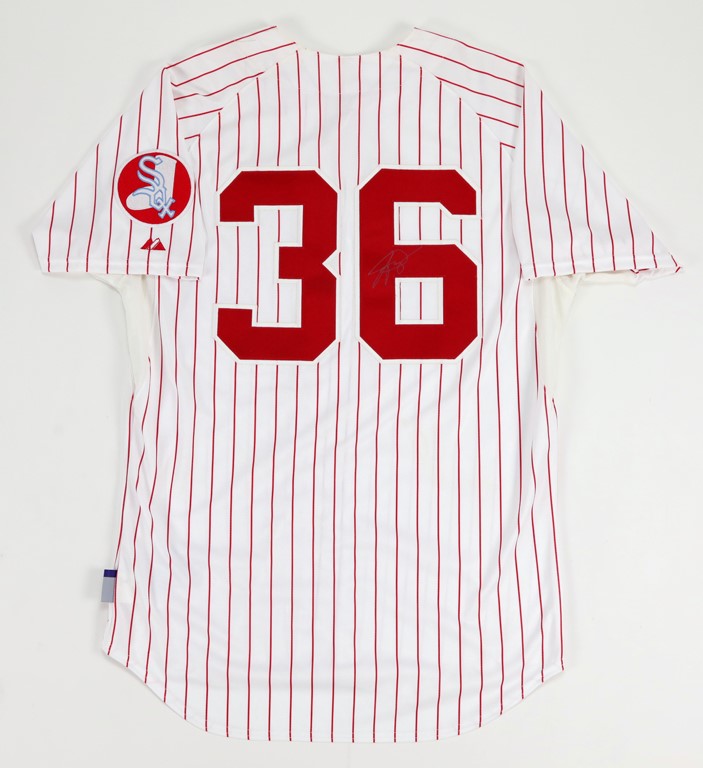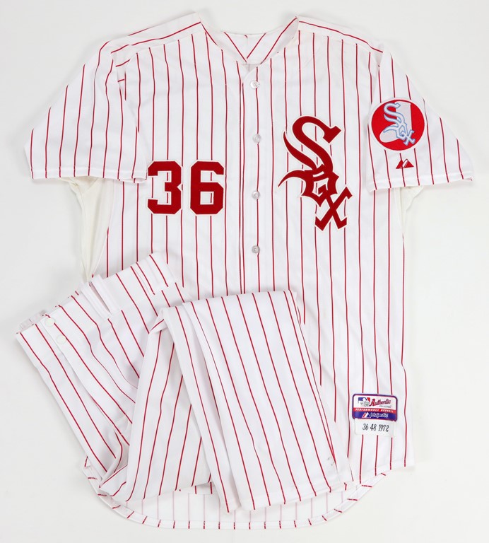 (1) 1972 Chicago White Sox throwback uniform with signature on jersey. The red and white jersey is made by Majestic and has a front tail tag that reads "35 48 1972. The tag on the matching pants reads "36 Phegley 38-42 31 OB C 1972."