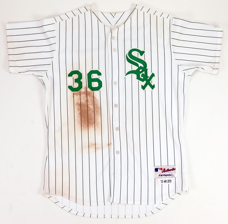 (1) Green and white St. Patrick's Day edition jersey made by Majestic with front tail tag that reads "'13 48 SPD." Shows nice use and even has some dirt on the front under the "36."