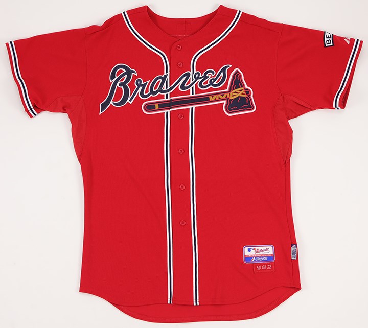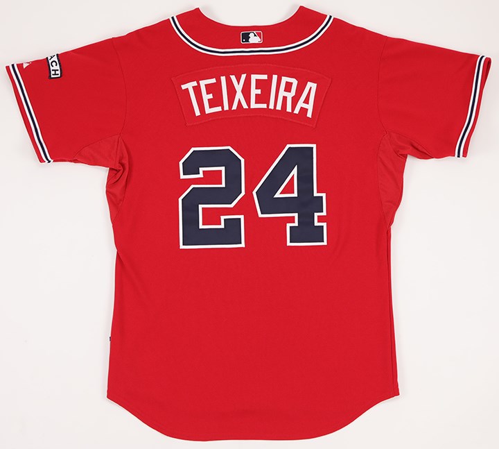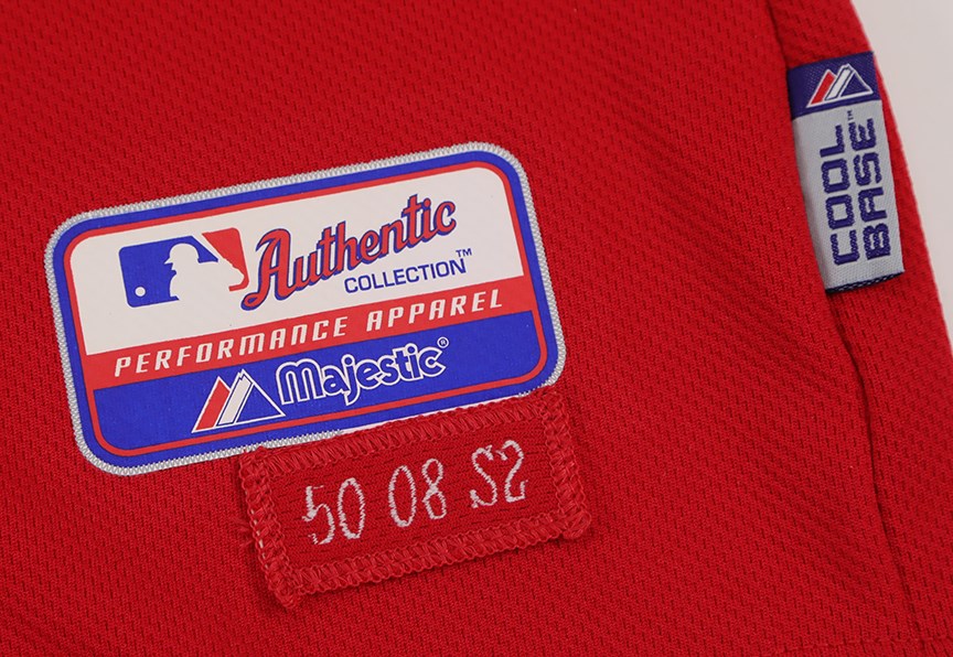 The five-time Gold Glove winner, three-time All-Star, and World Series champion wore this jersey during the 2008 campaign, when he tallied thirty-three homers, 121 RBI, and a career-high .308 average. Red button-down knit with sewn-on identifiers and Jim Beauchamp memorial patch on the left sleeve features all the proper tags, including "50 08 S2" swatch and "Taper" flap tag. Exhibits light wear.